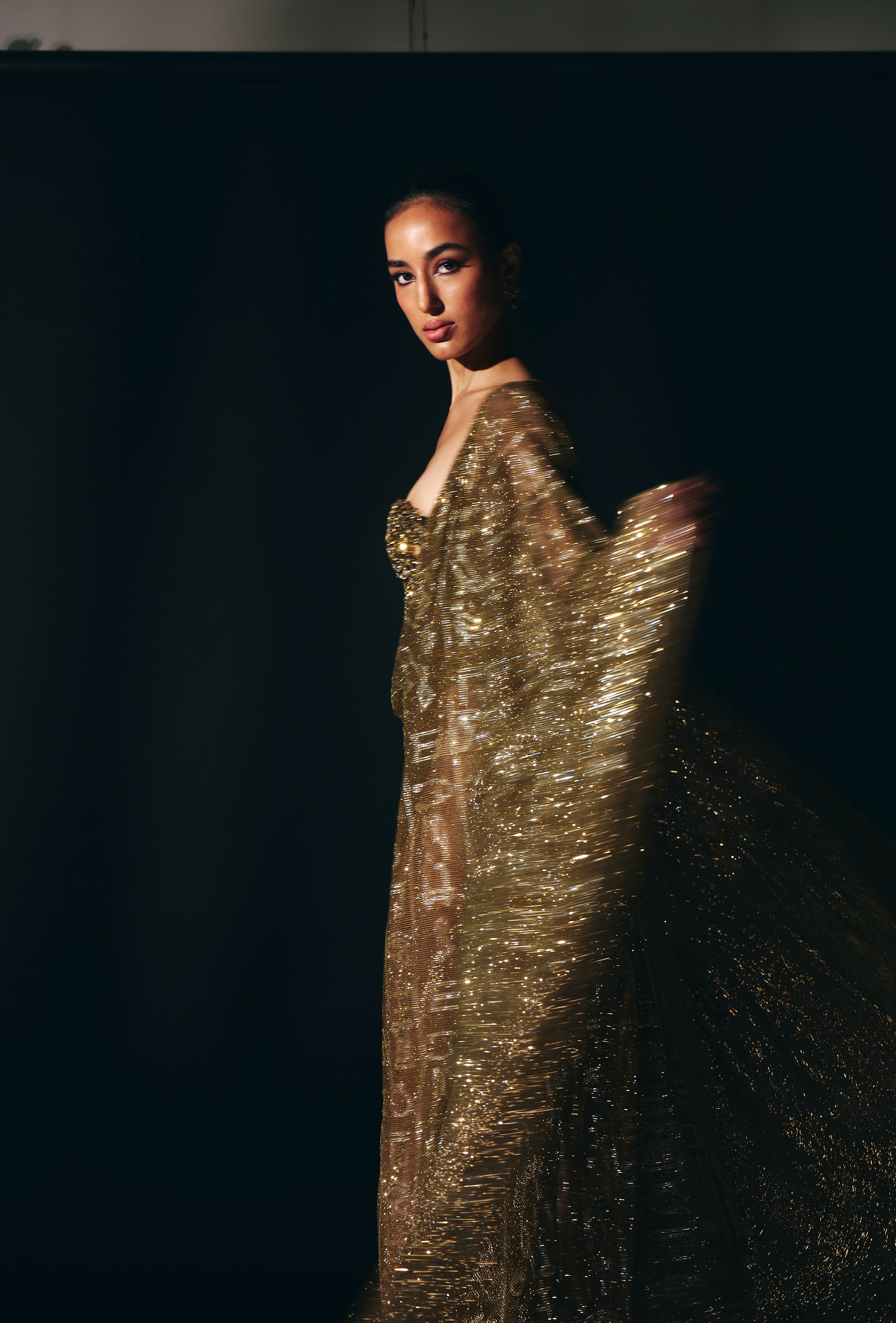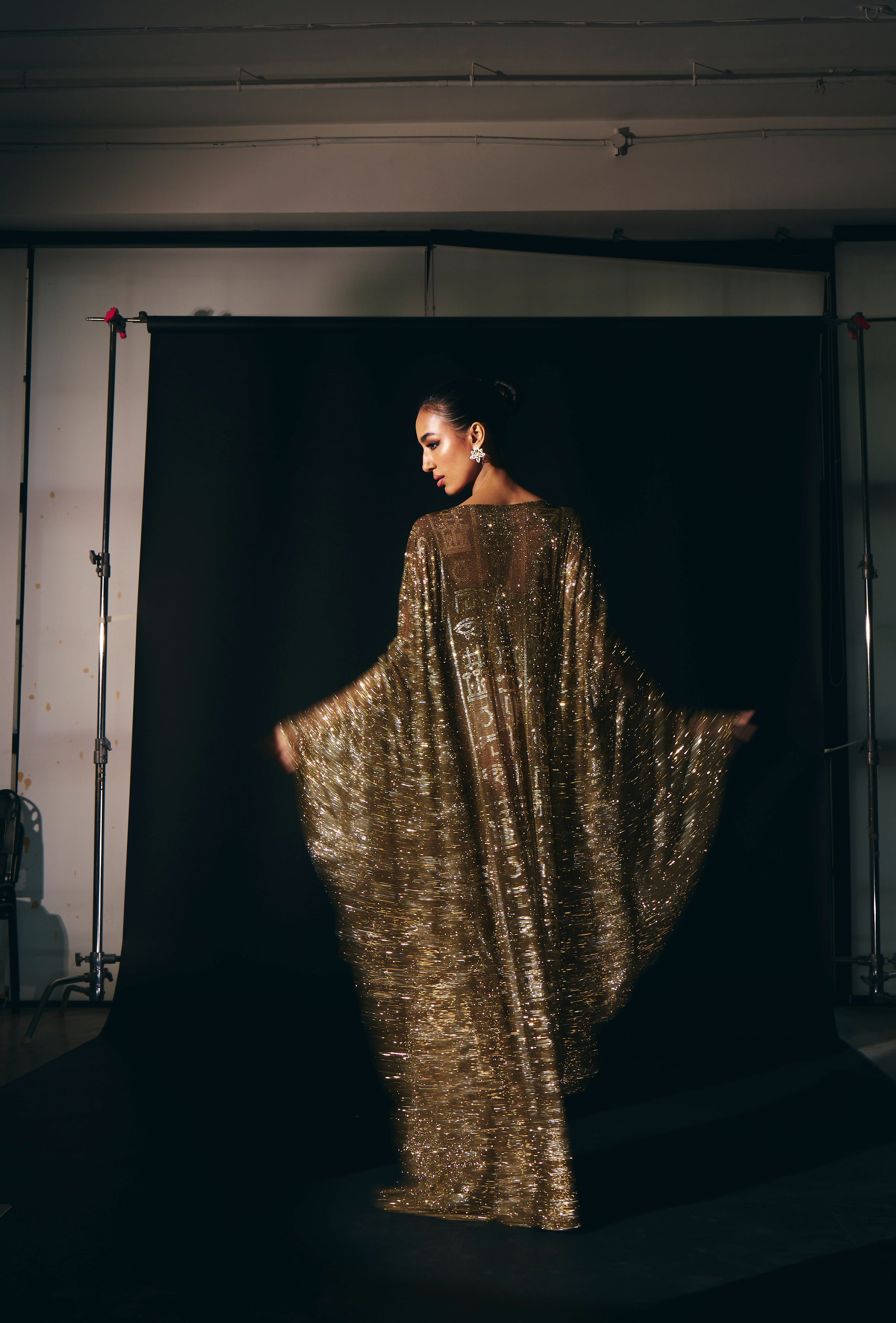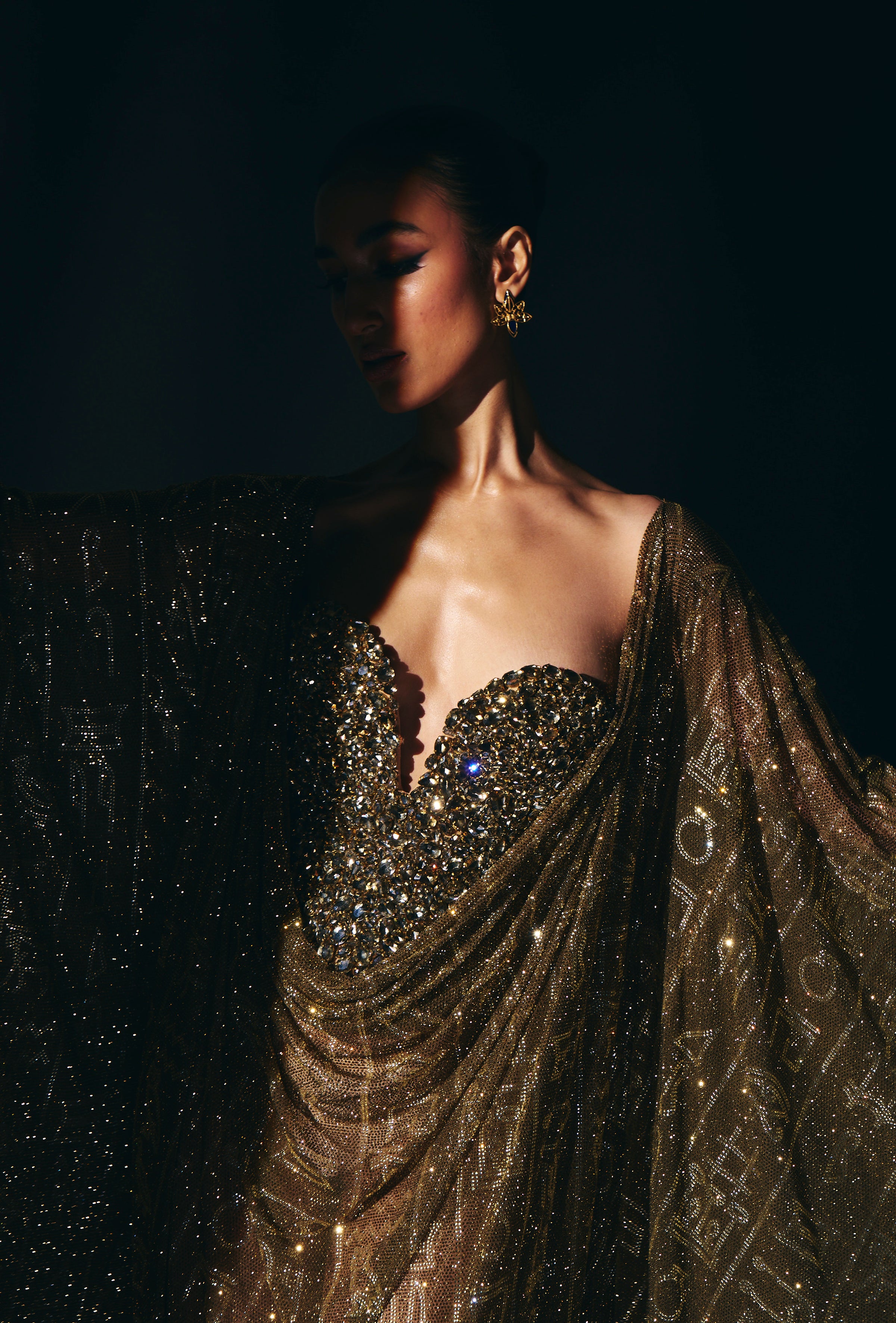 This stunning kaftan features intricate hieroglyphic crystal embellishments. paired with a gold jewel corset , adorned with dazzling big crystals, radiates glamour and allure, drawing eyes with its captivating sparkle