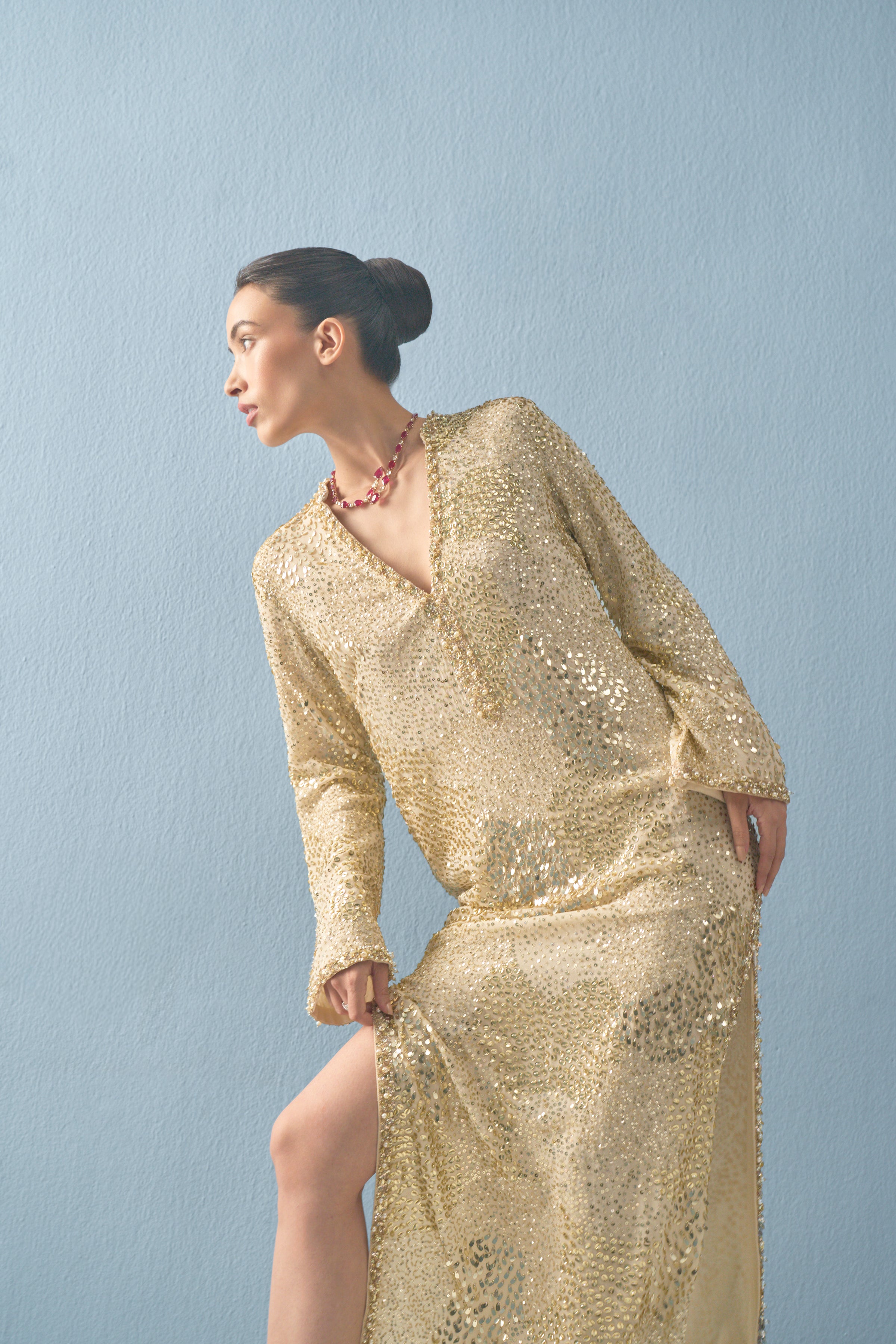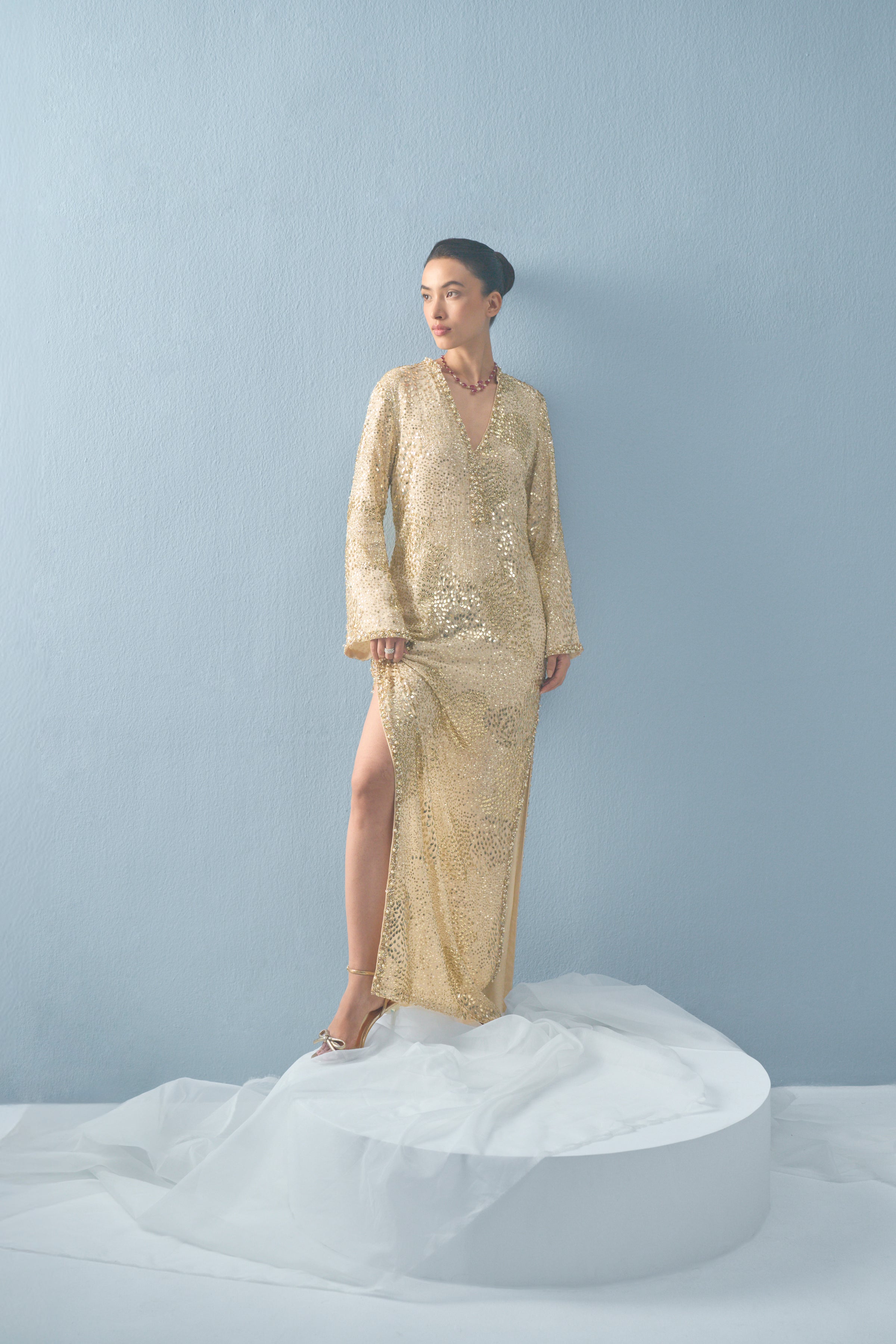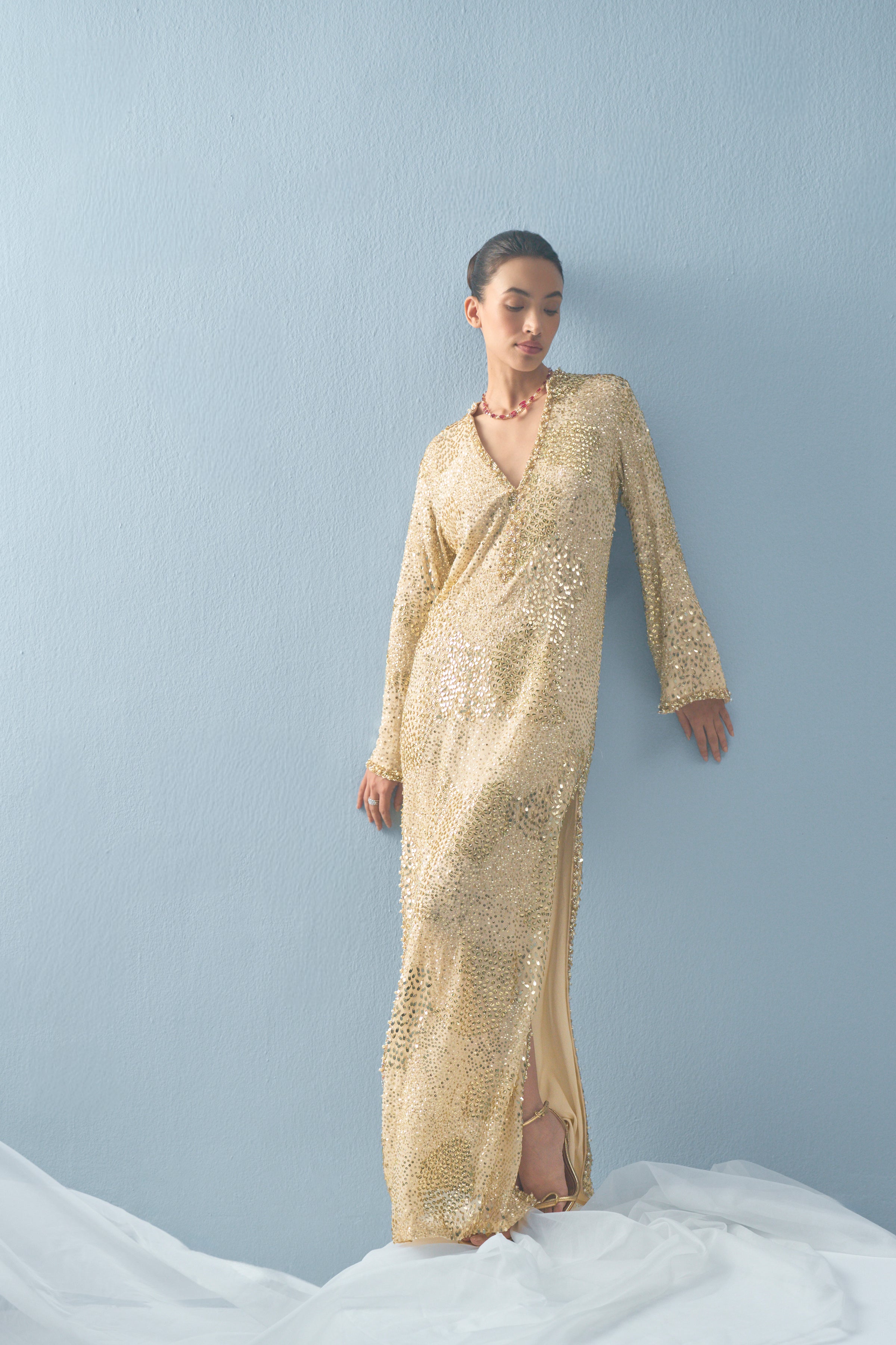 Ivory georgette kaftan with sequin, cutdana and pearl sheeting embroidery.