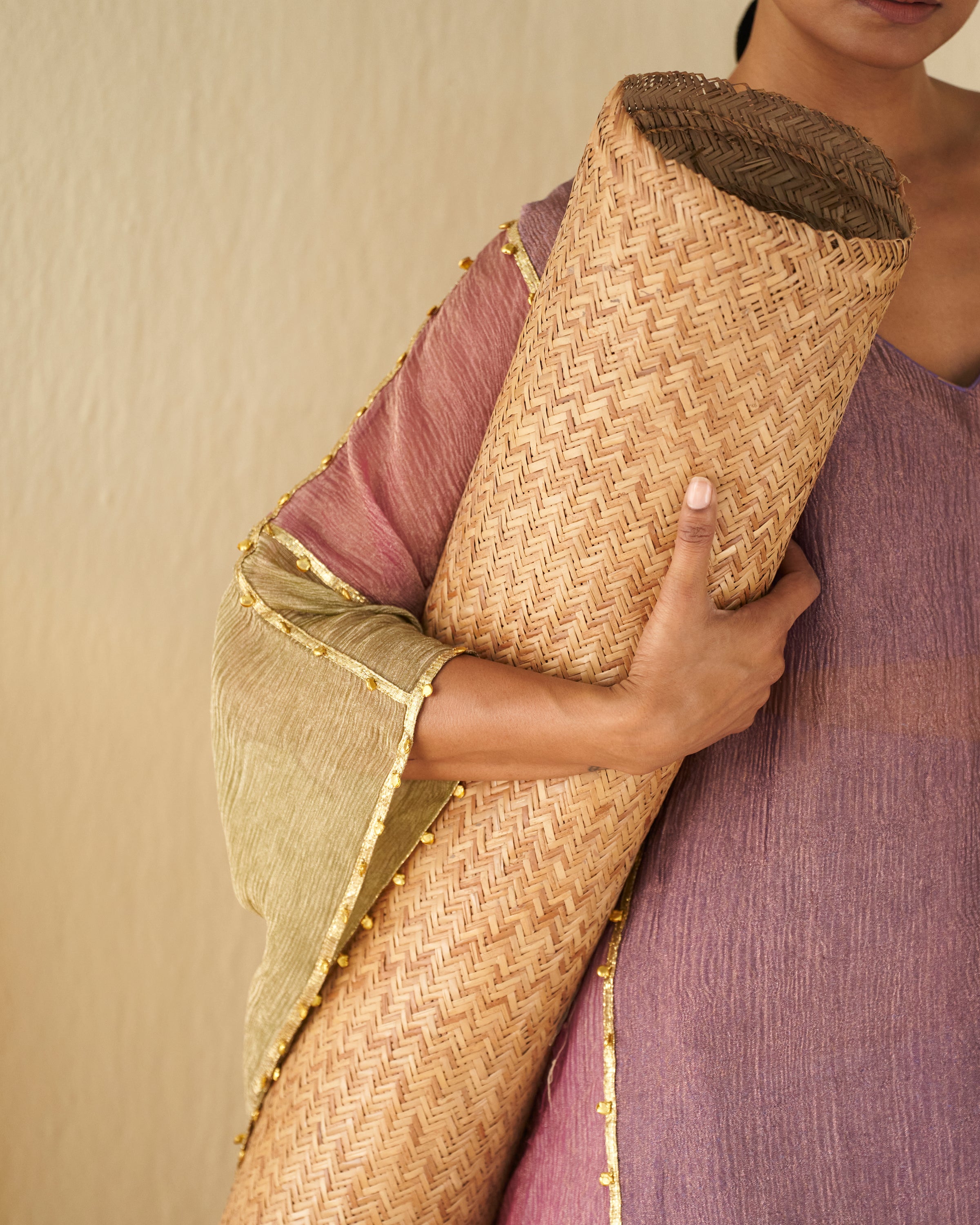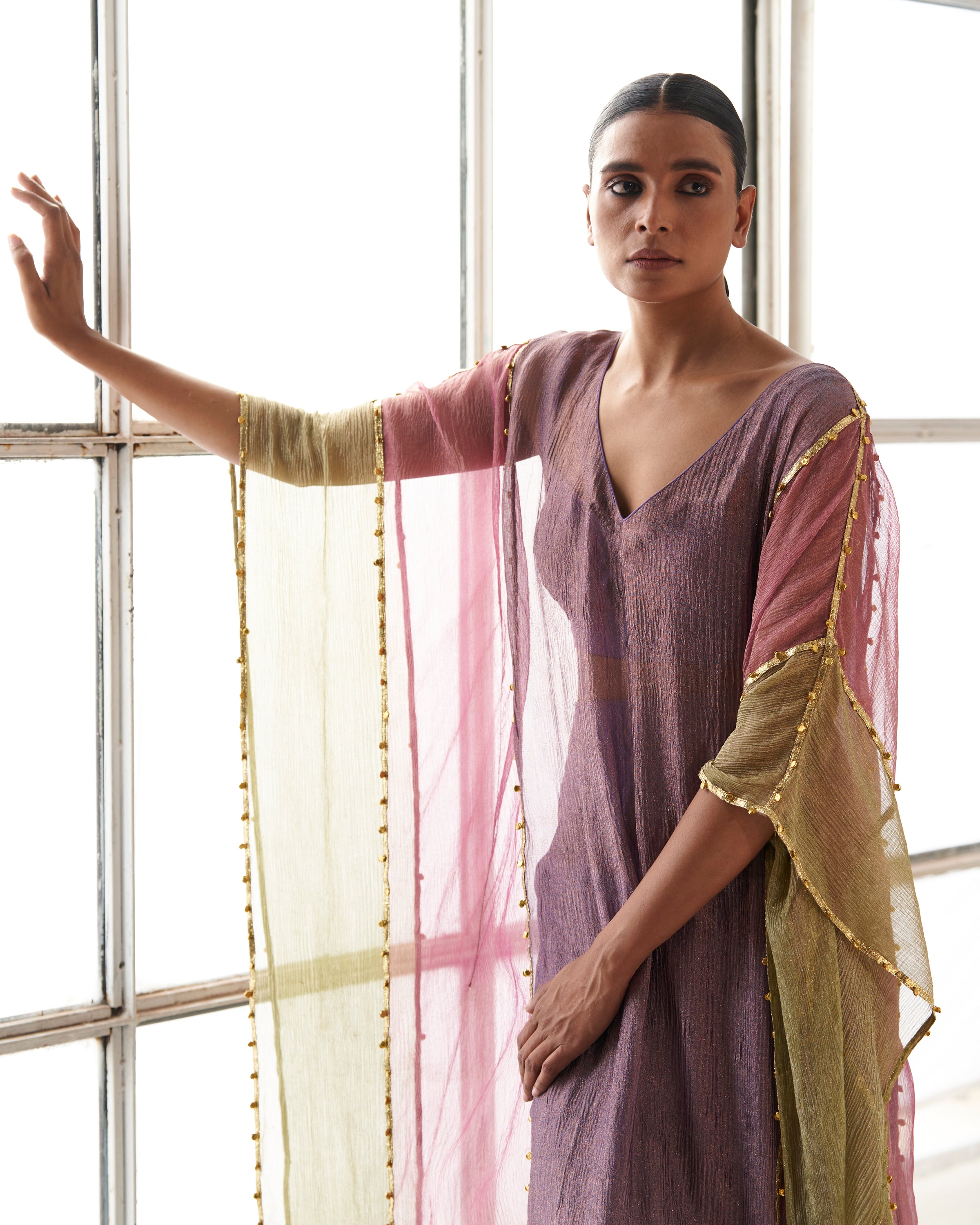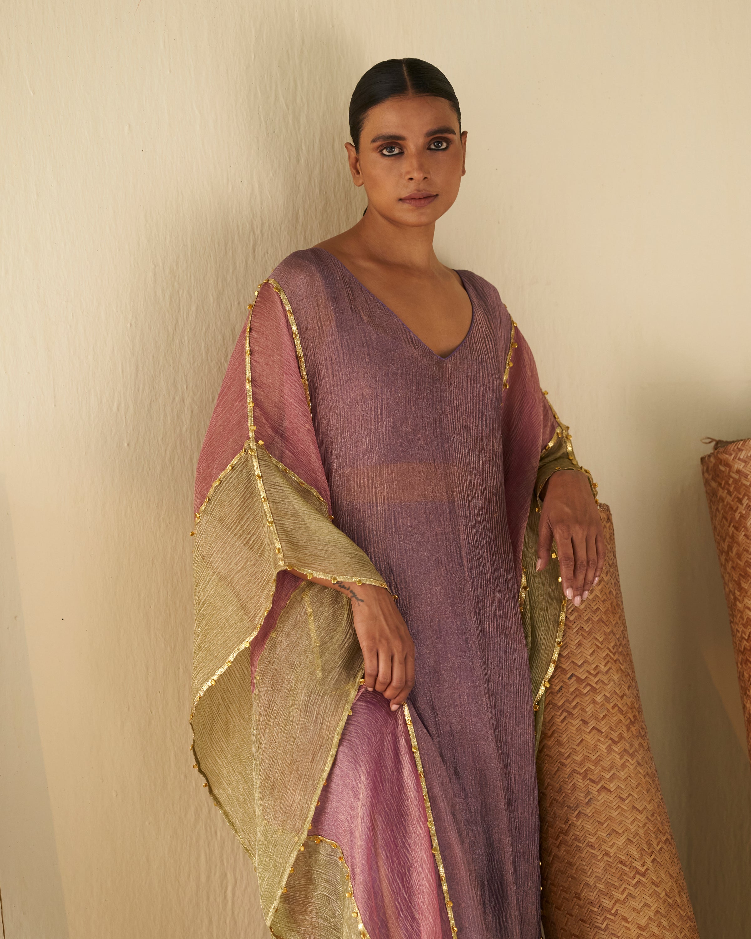 Color blocked kaftan with ghunghroo and vertical gota stripes detailing