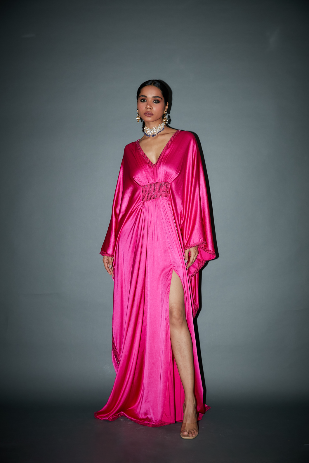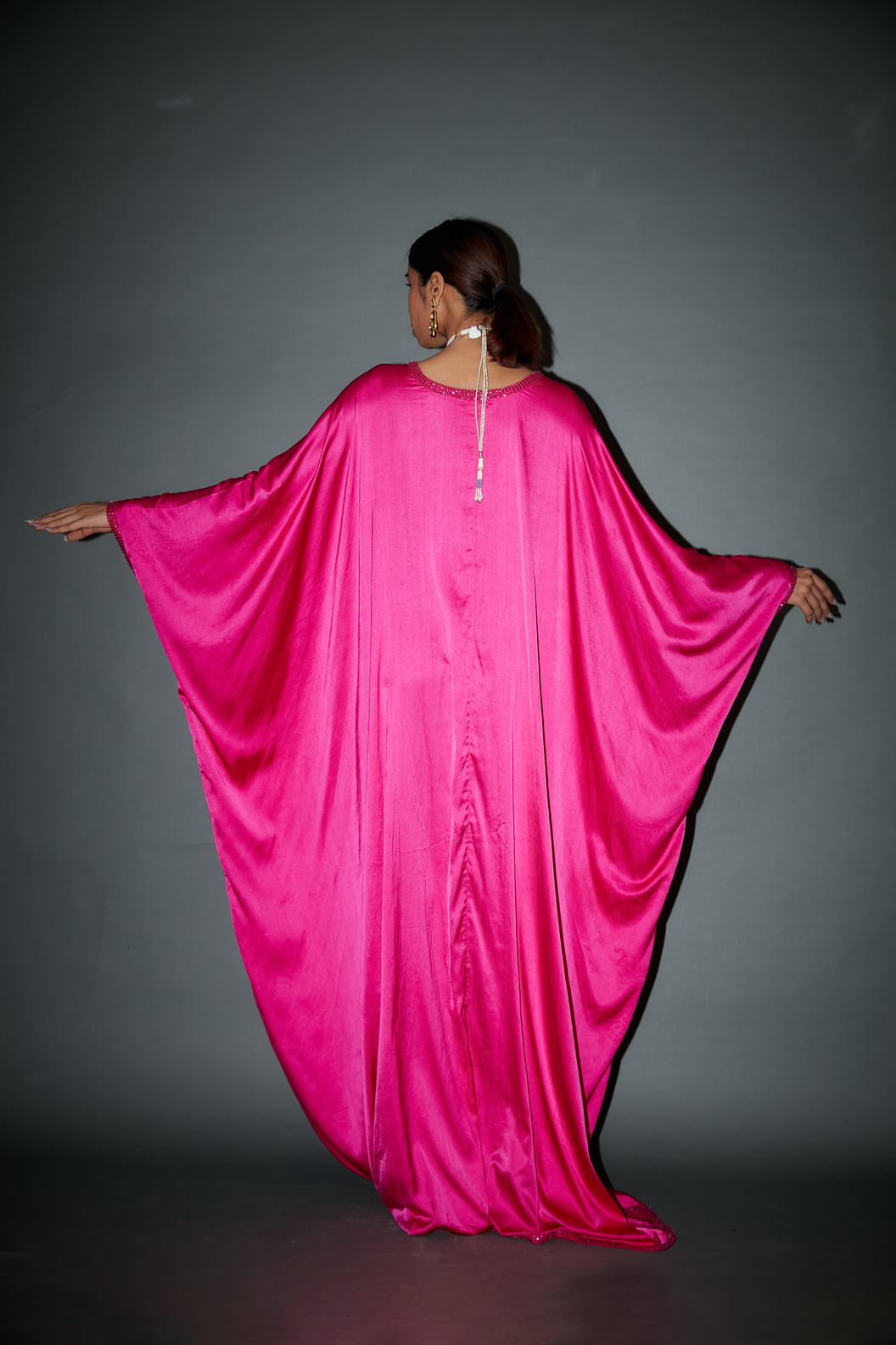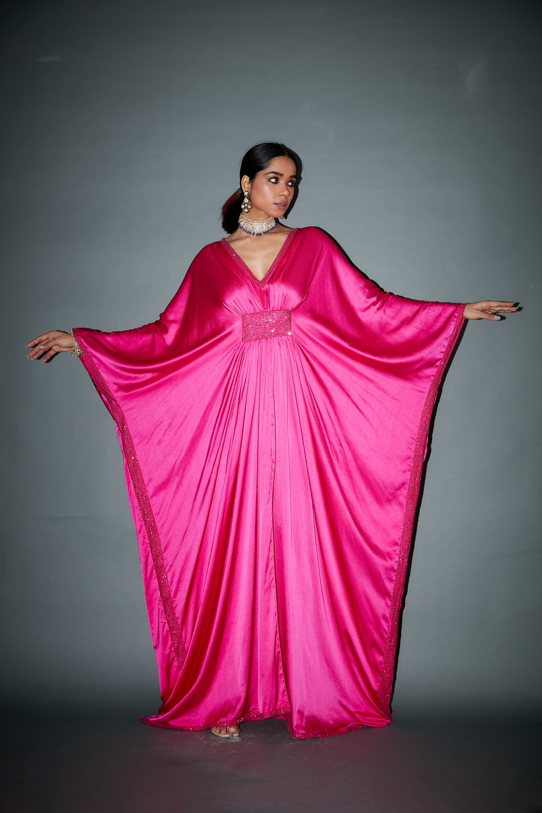 French fuchsia crystal embellished border with sinched waist kaftaan.
