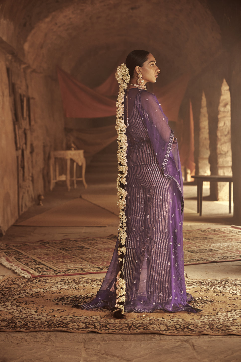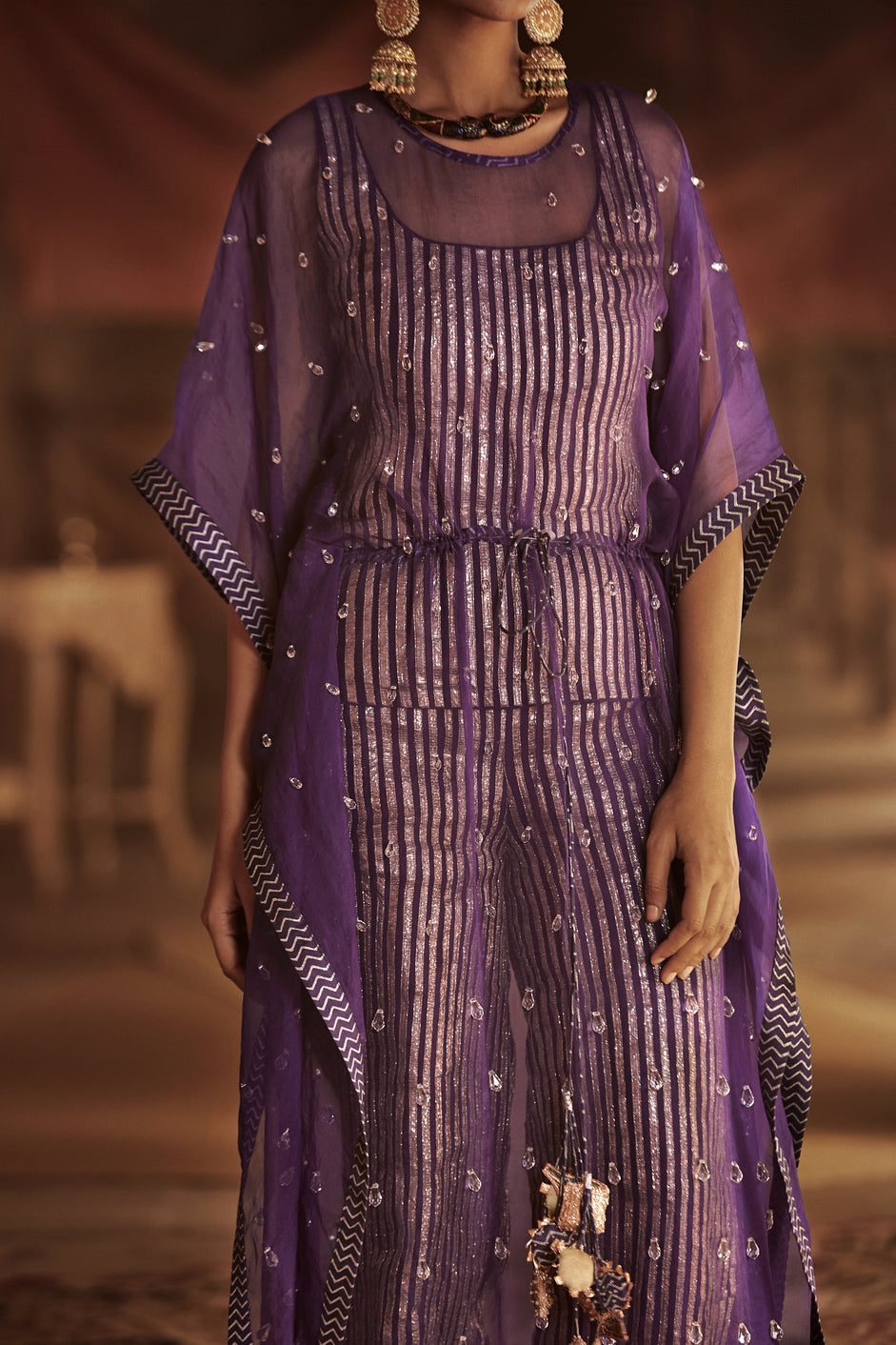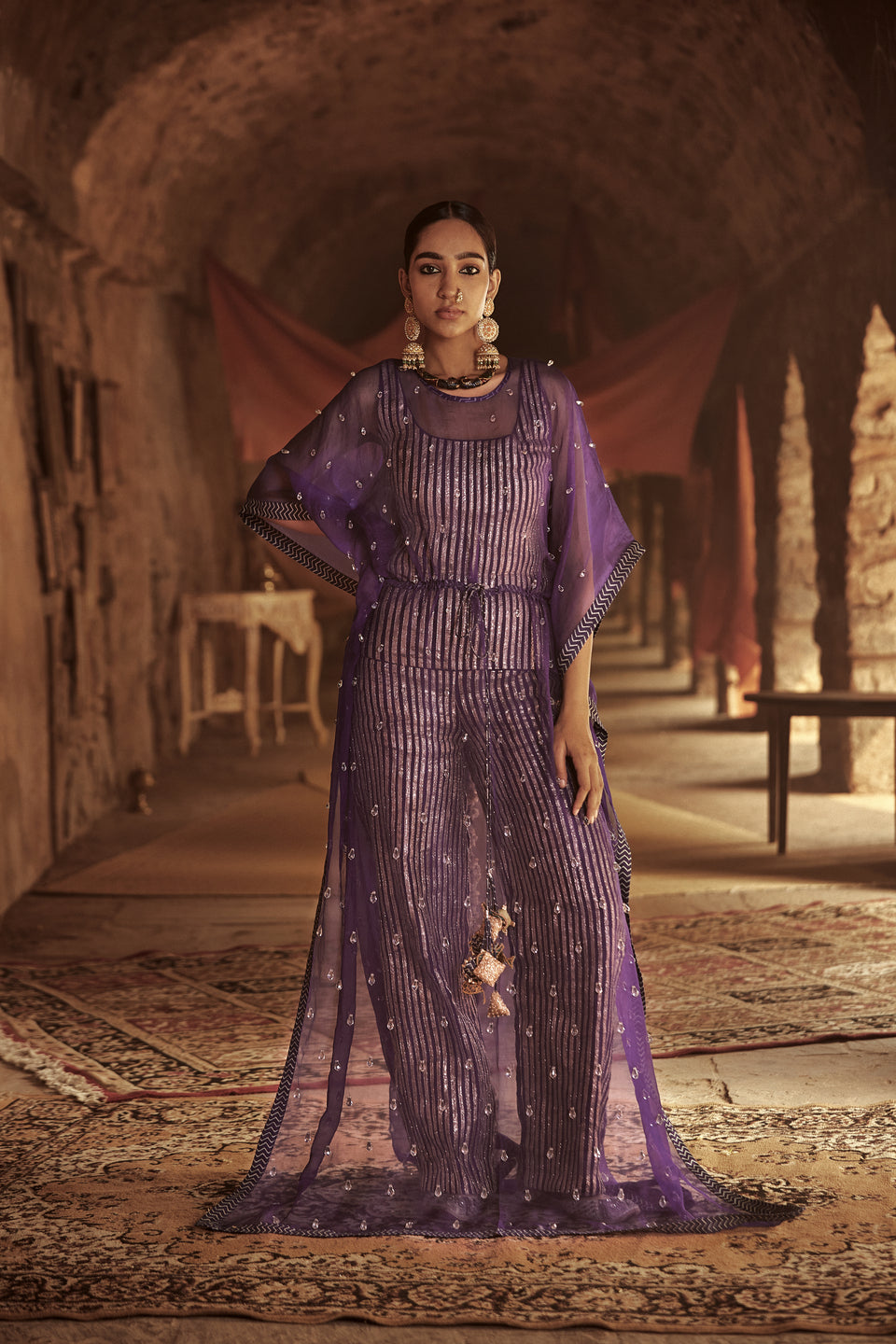 Purple kaftan in silk organza base with crystal drops detail paired with matching bralette and pants.