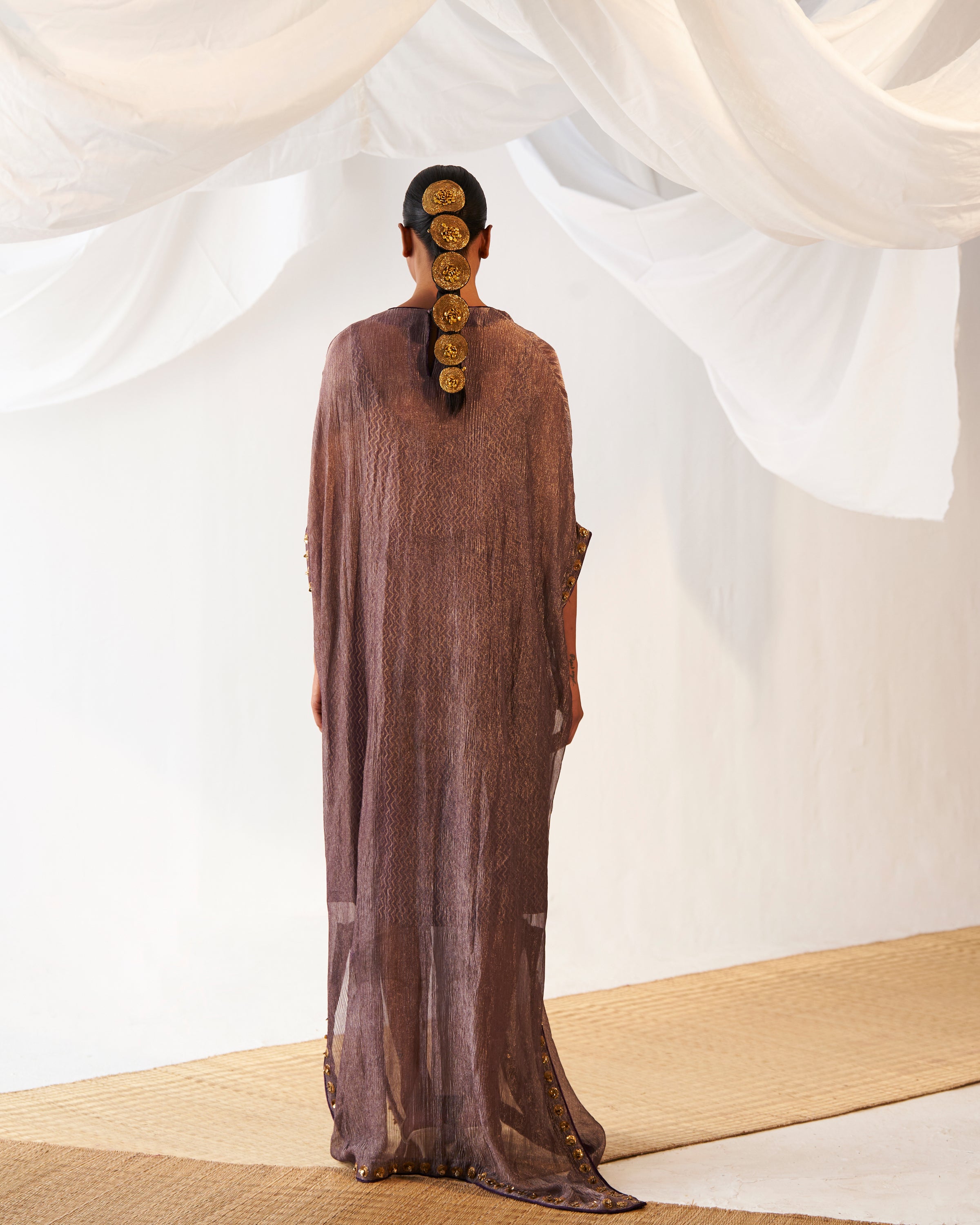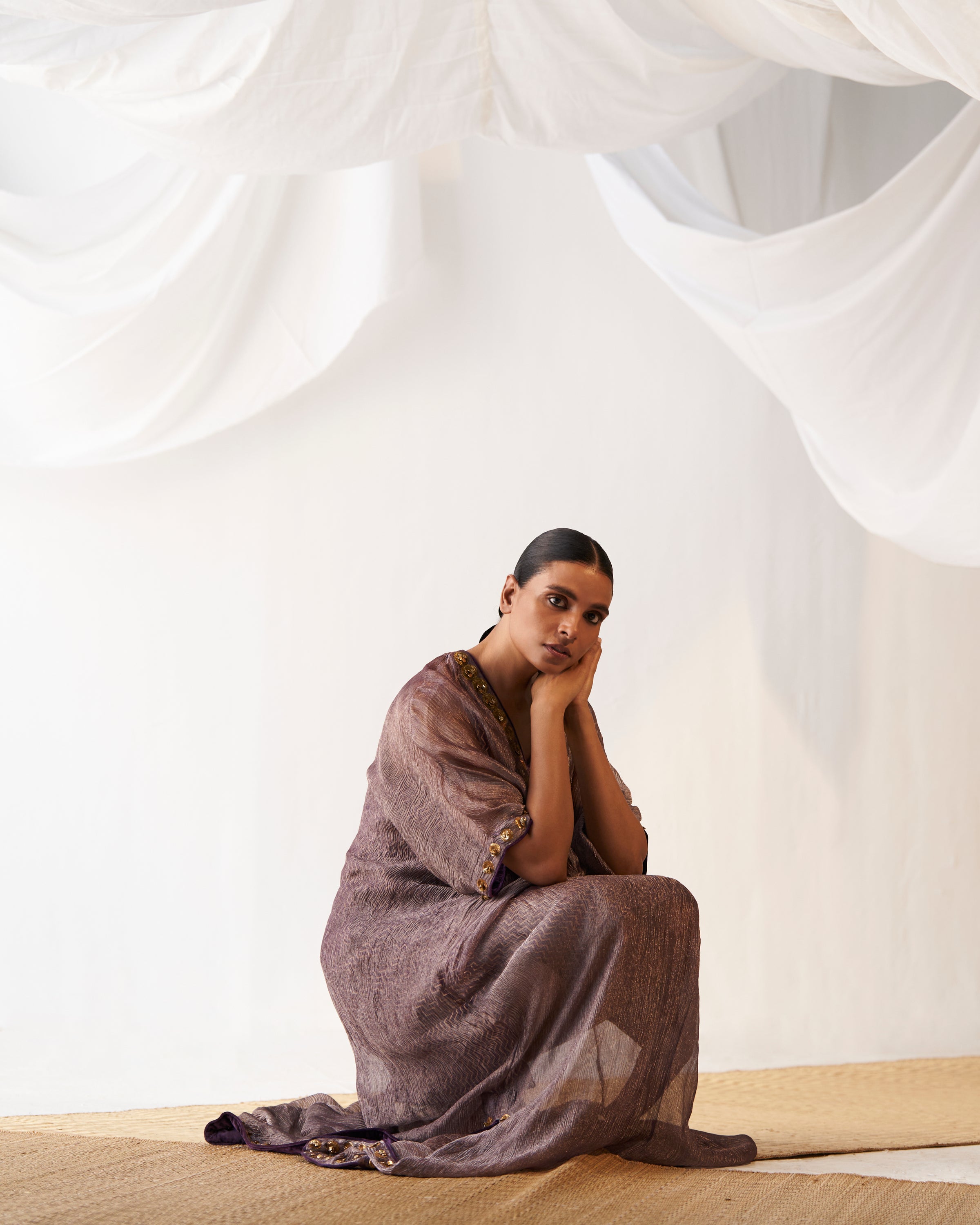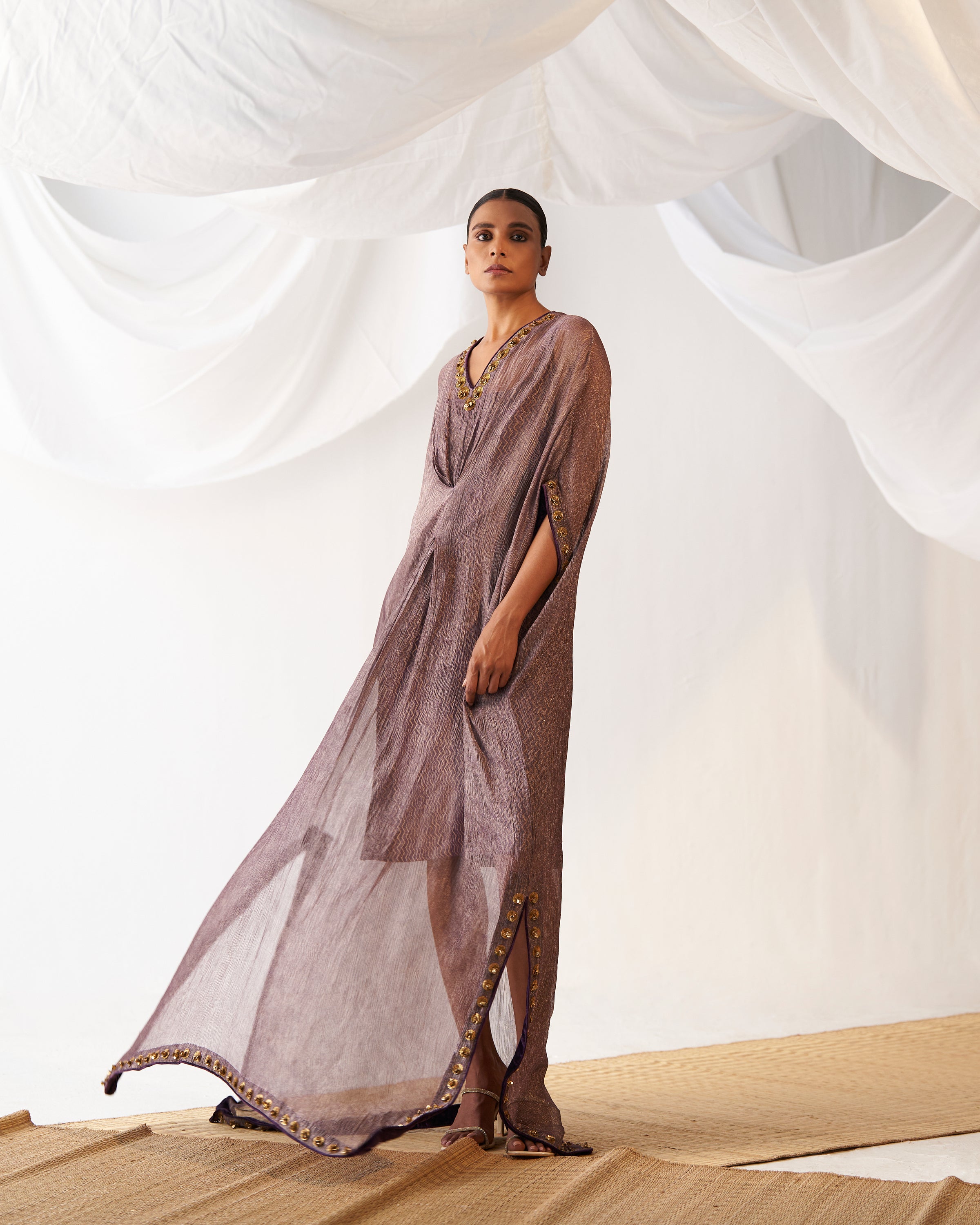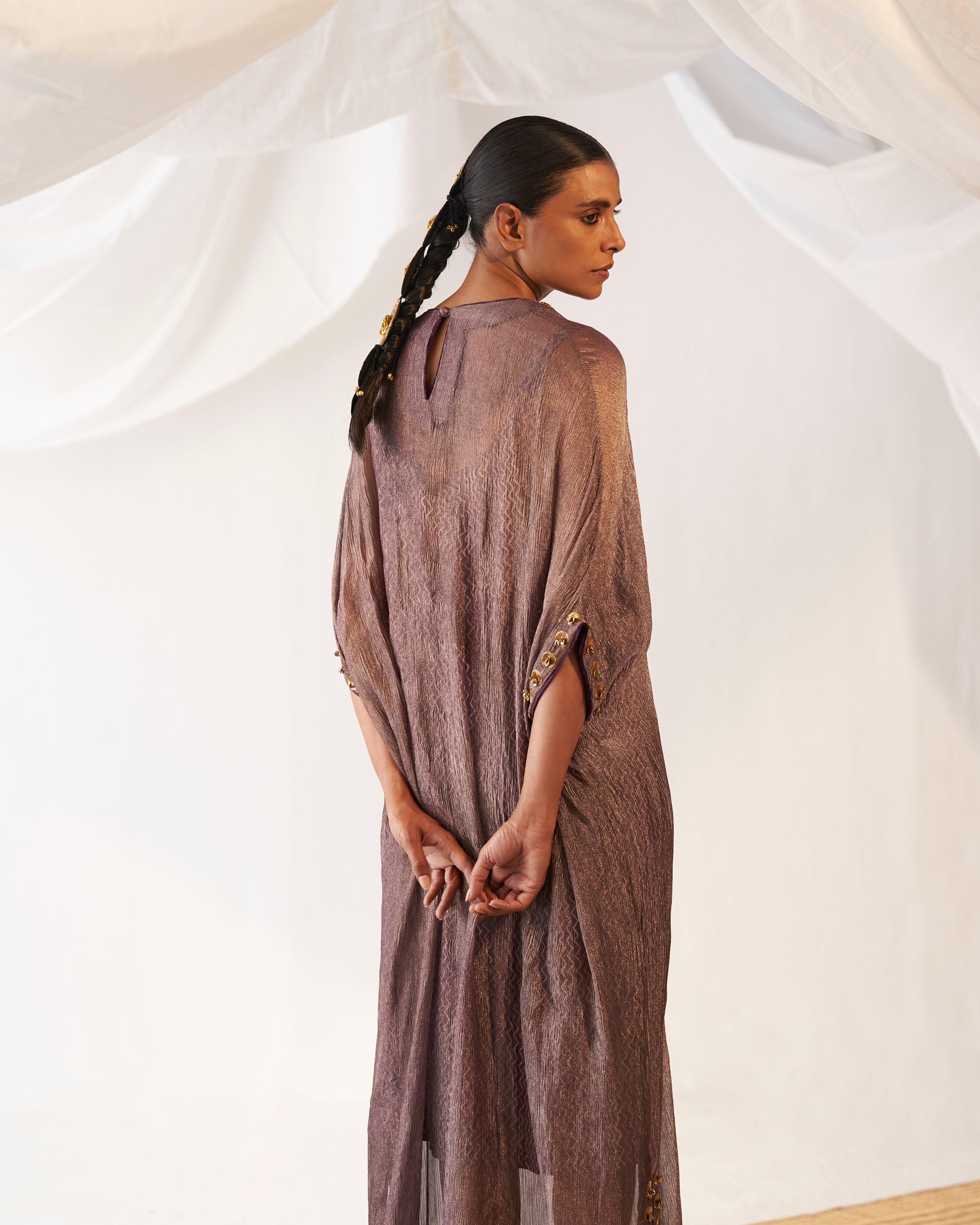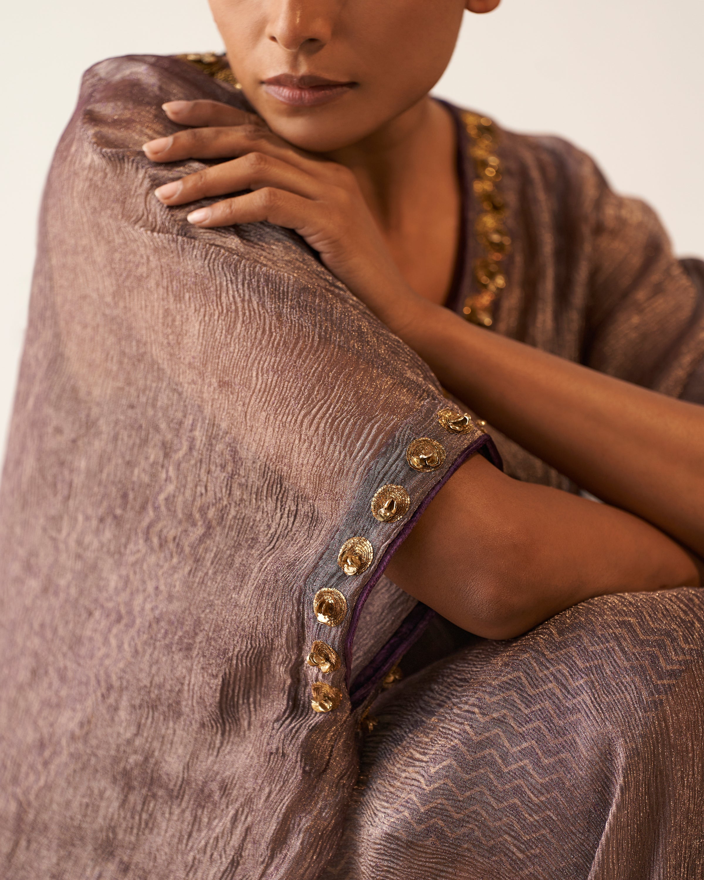 Purple tissue kaftan with ghunghroo dot embroidery on neckline and side seam