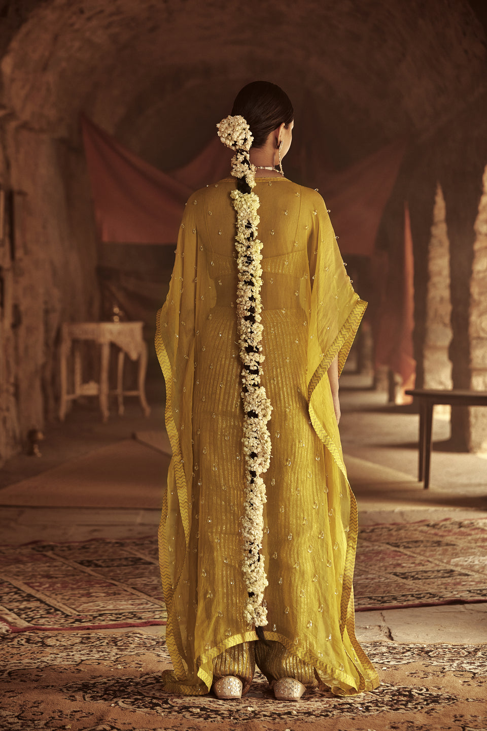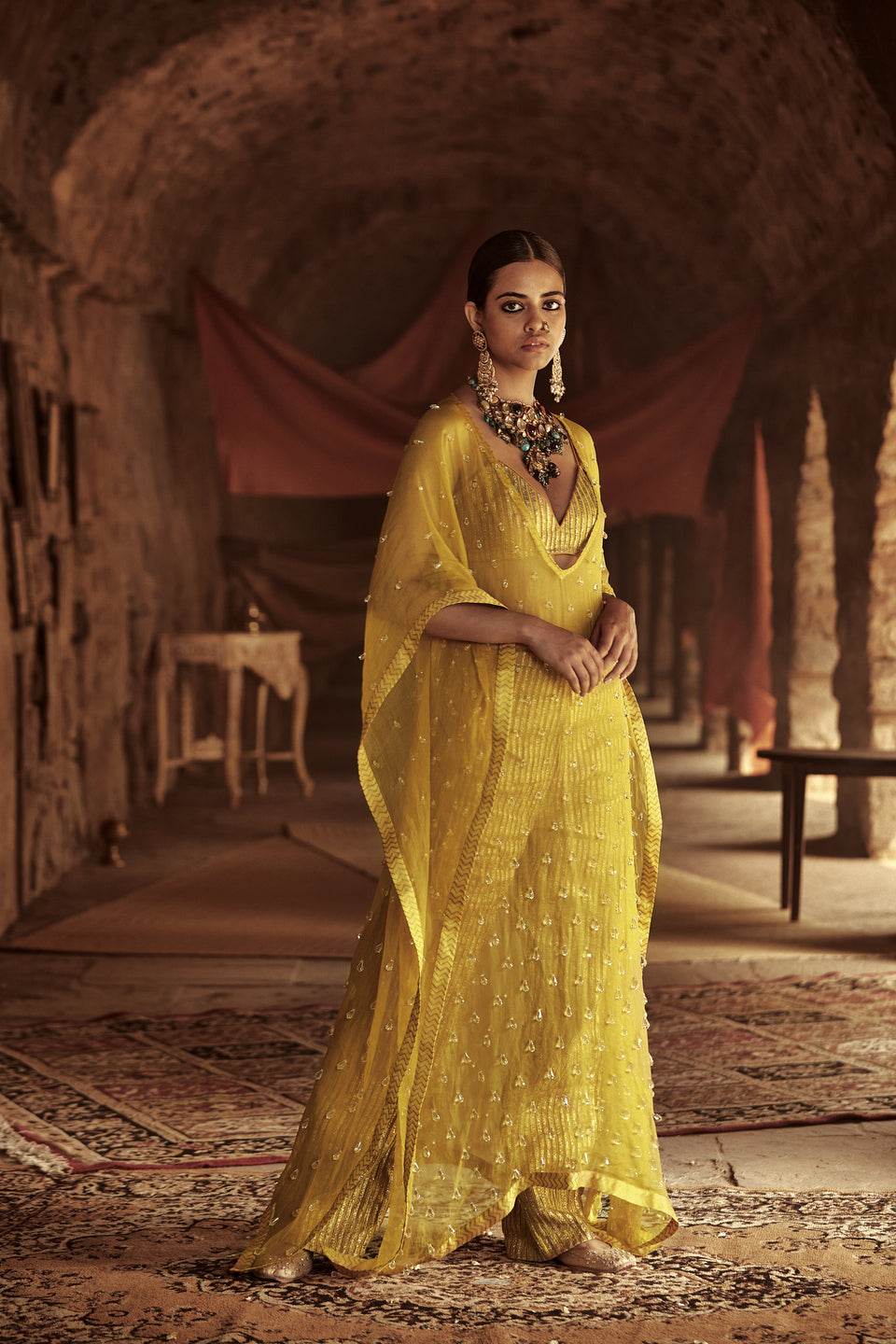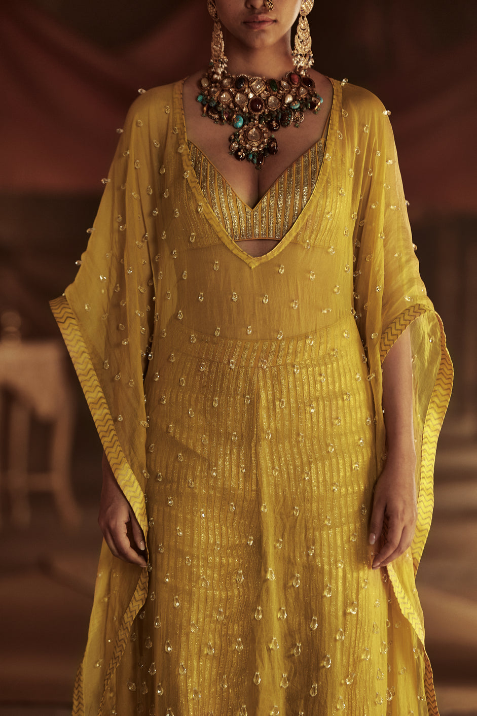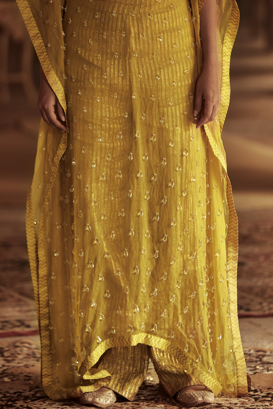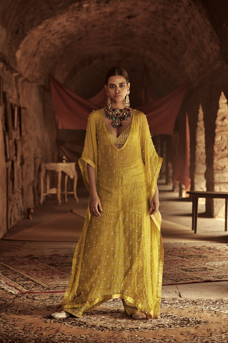 Yellow kaftan in silk organza base with crystal drops detail paired with matching bralette and pants.