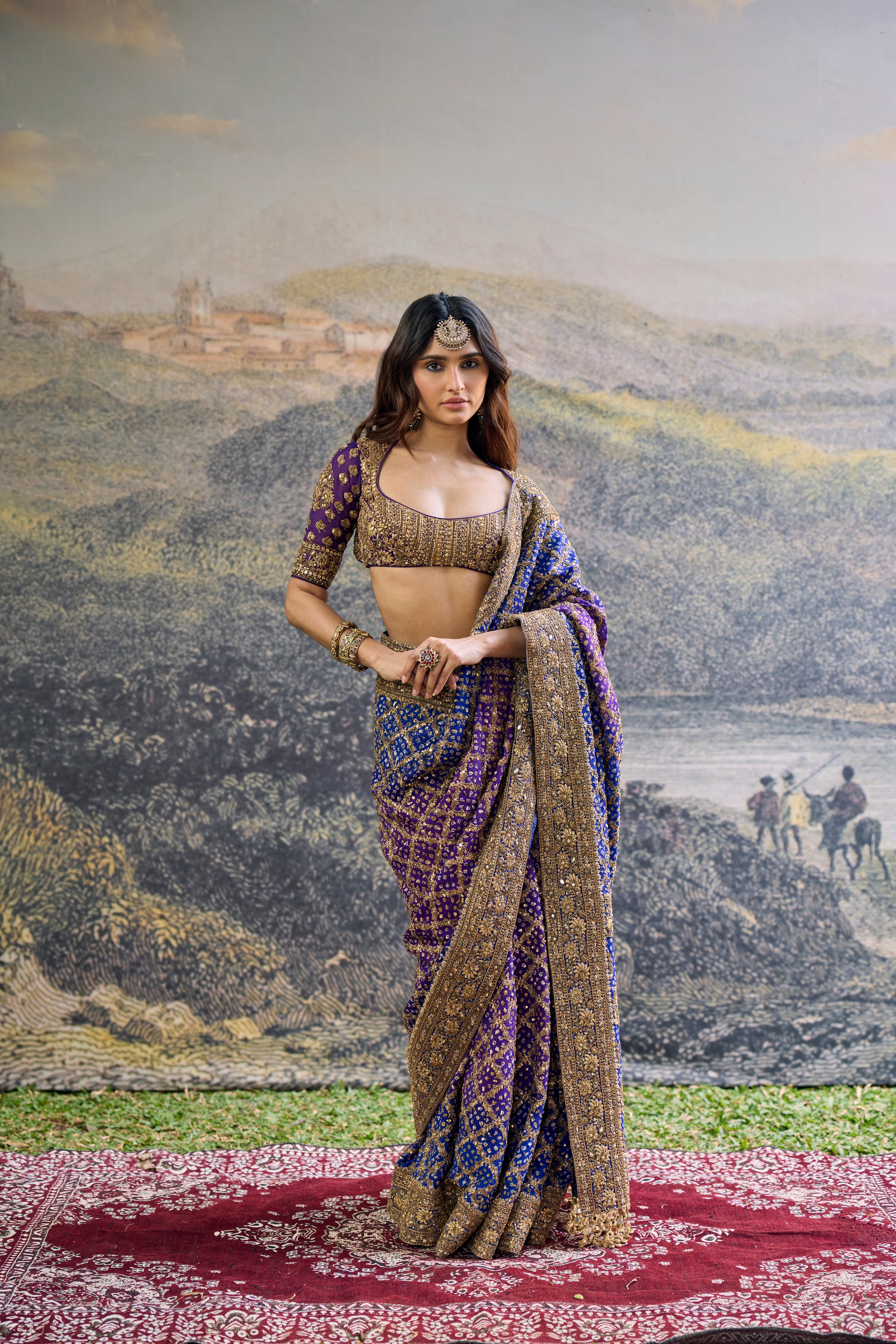 A Beautifully Handcrafted Blue–Purple Ombré Georgette Saree That Flows With Effortless Grace. It Is Paired With An Intricately Hand-Embroidered Organza Blouse, Finished With Delicate Handmade Tassels For A Refined Statement.
