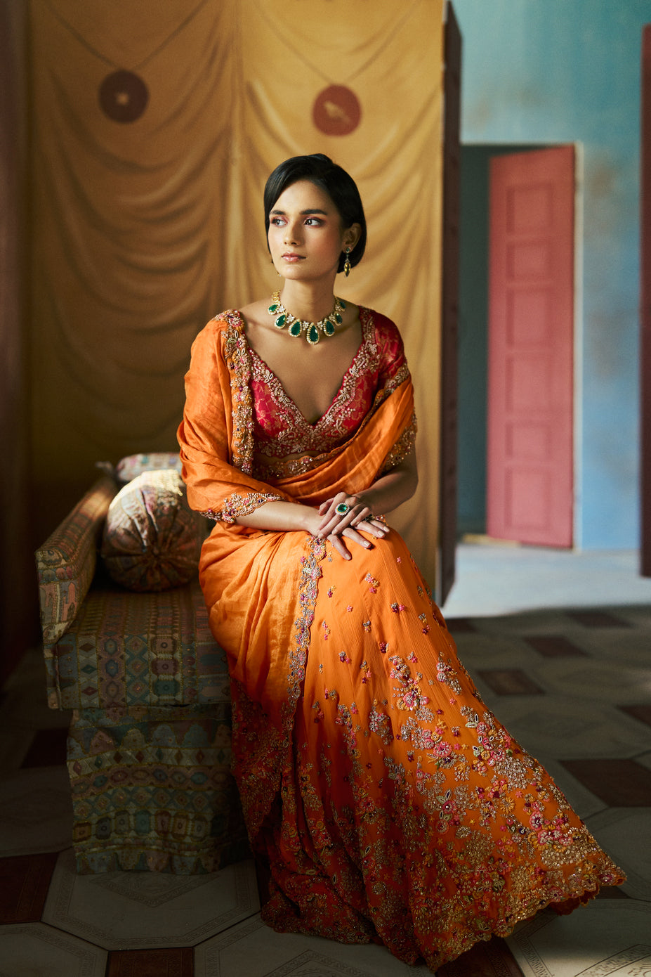 A Poetic Harmony Of Textures—This Ensemble Weaves Together A Gleaming Tissue Aanchal, Airy Chiffon Kalidaar Panels, And A Brocade Blouse Adorned With Antique Gold Threadwork. A Timeless Ode To Refined Elegance.