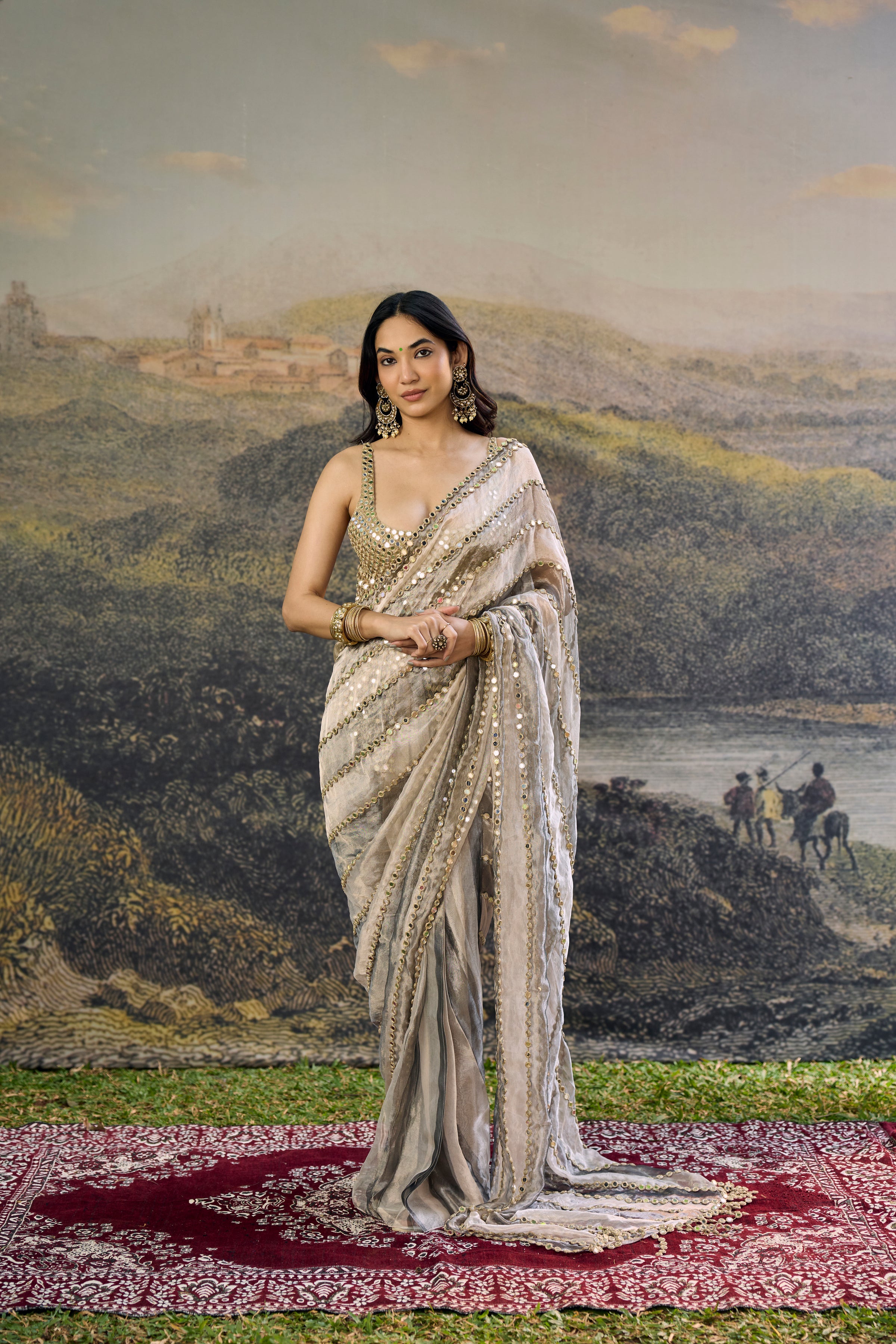 This Set Includes A Silver And Grey Panel Tissue Pre Draped Saree And A Hand Embroidered Mirror Blouse With Jhallar Latkan. Disclaimer: Color May Vary In The Tissue Fabric Since It Is Hand-Woven With Metal Zari, Which Can Naturally Cause Slight Color Variation