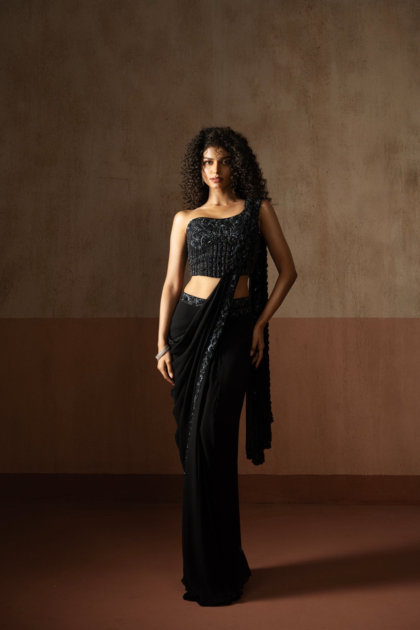 Featuring a black pre-stitched, drape saree, with intricate hand embroidered work on blouse and pallu border of the saree. The saree is made up of Georgette.