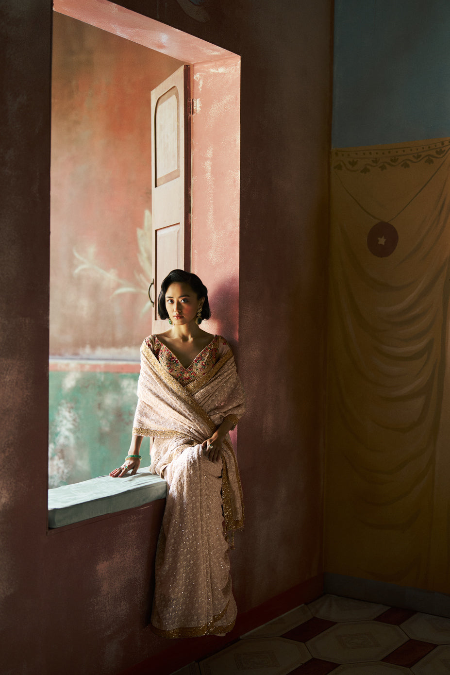 An Ivory Chikankari Saree Featuring Intricate Tonal Threadwork, Accentuated By A Meticulously Crafted Hand-Embroidered Blouse And Lustrous Gold Zari Border. A Serene Expression Of Classic Craftsmanship And Contemporary Elegance.