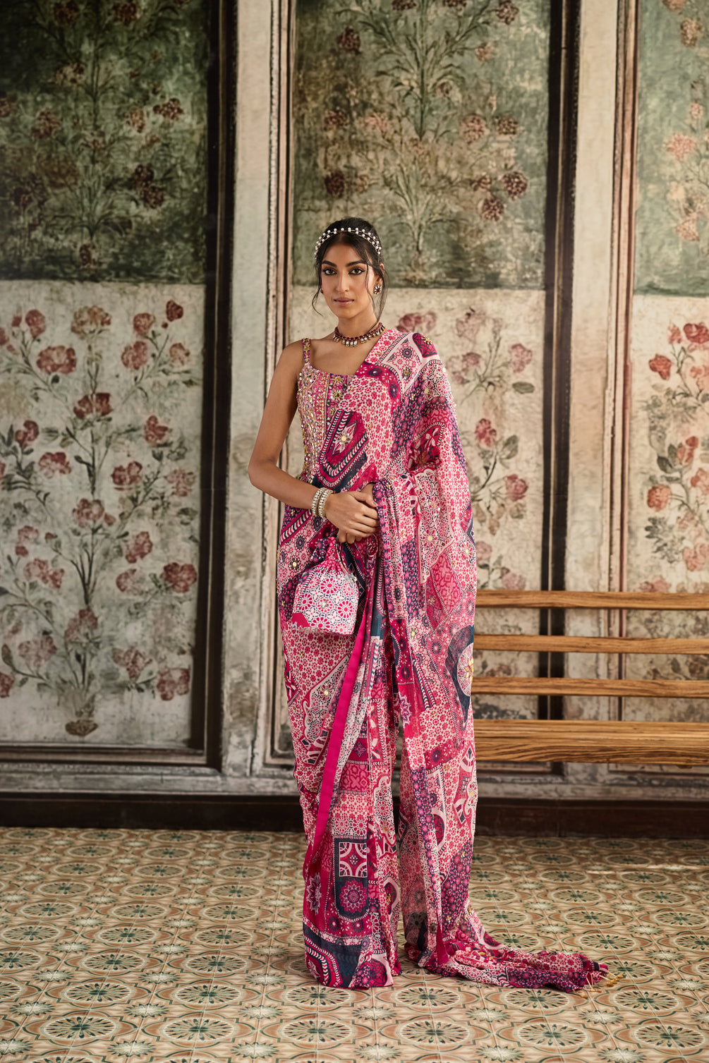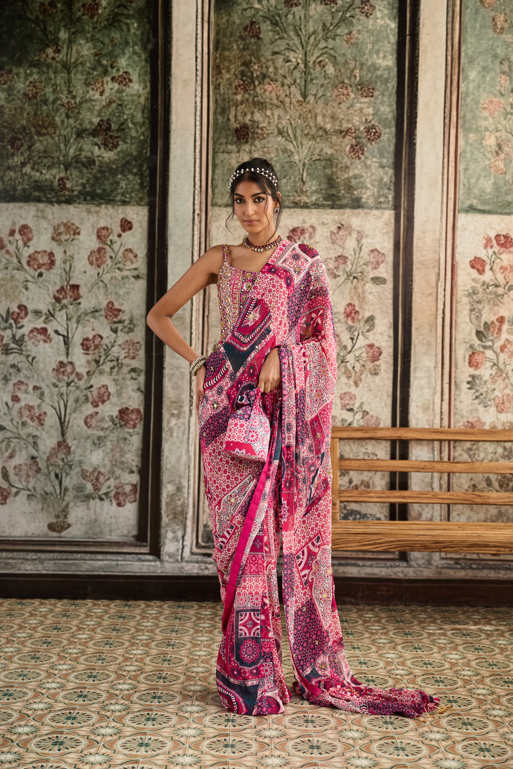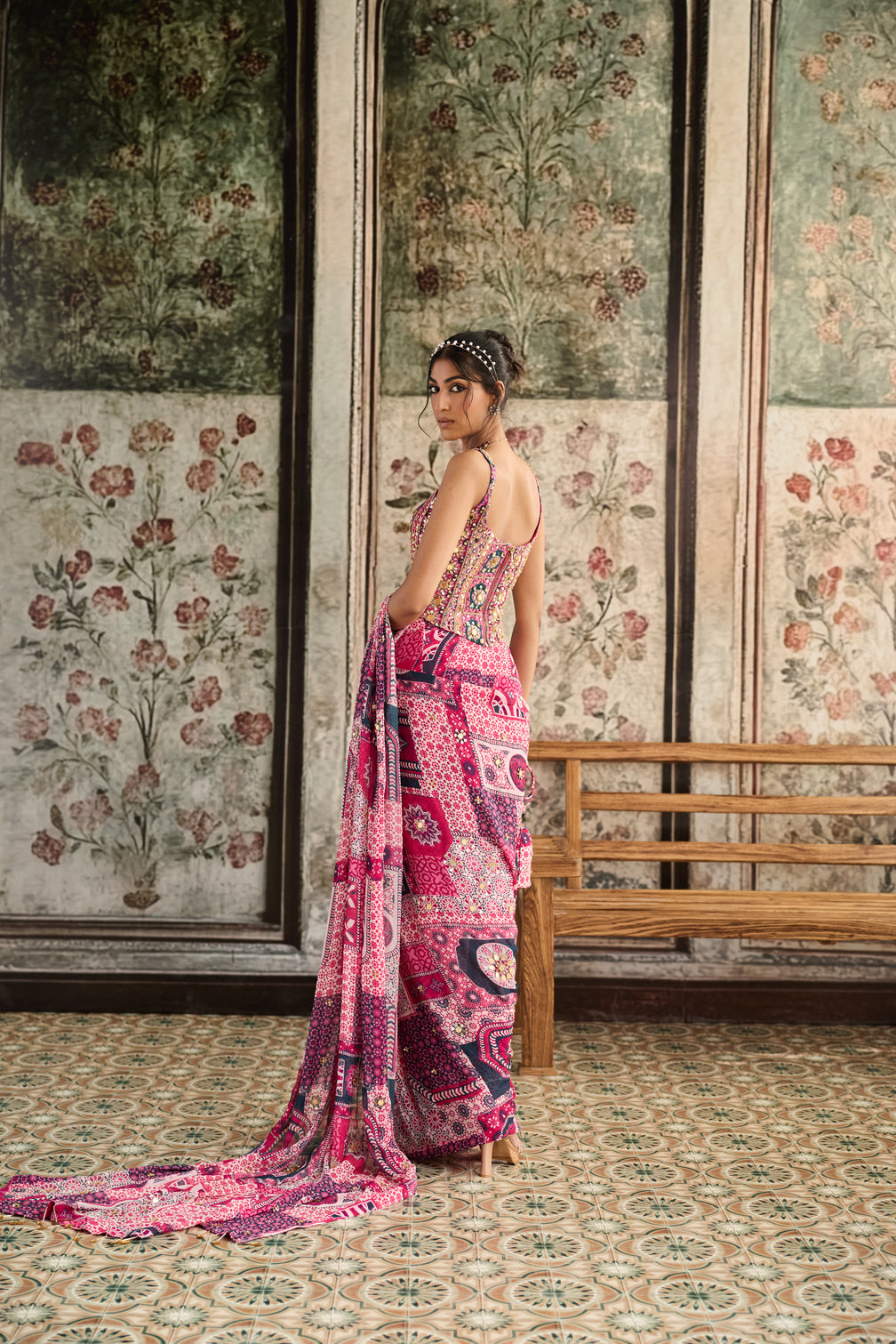Fuschia Print And Highlighted Corset Blouse Paired With Pre-Draped Classic Saree Set