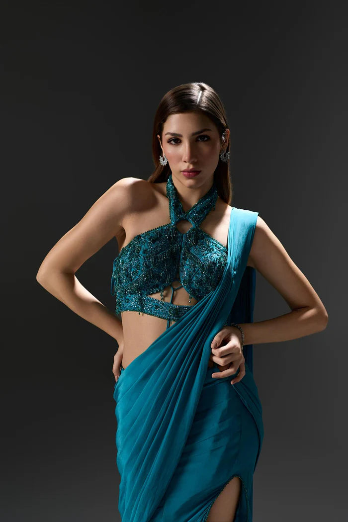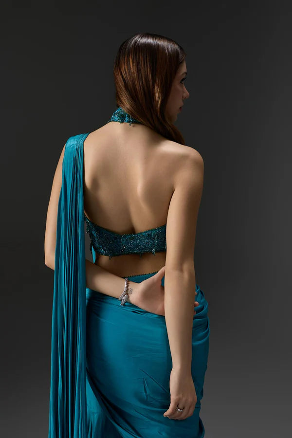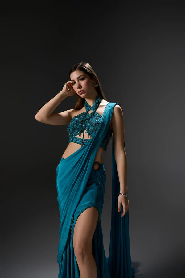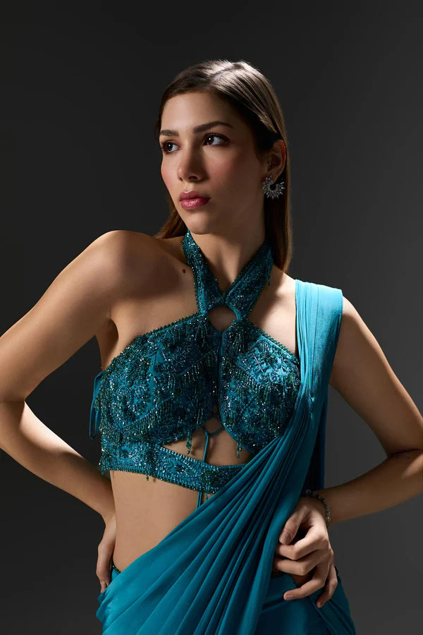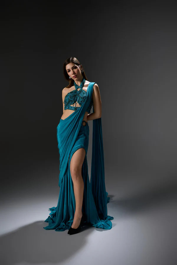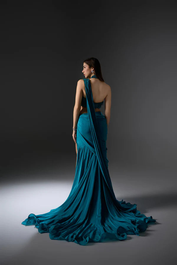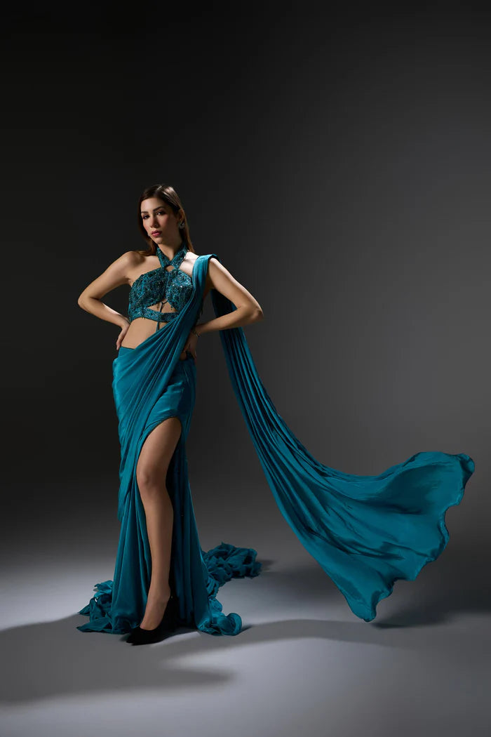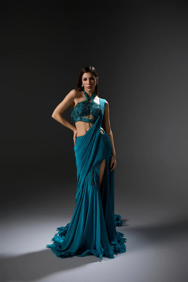 This couture drape saree is a bold blend of tradition and modern artistry. The silhouette features a long, flowing trail at the back with dramatic hem detailing that moves with grace and grandeur. It’s paired with a sharply cut blouse that brings in an edge of modern sophistication.