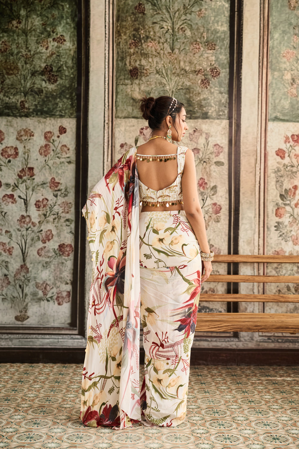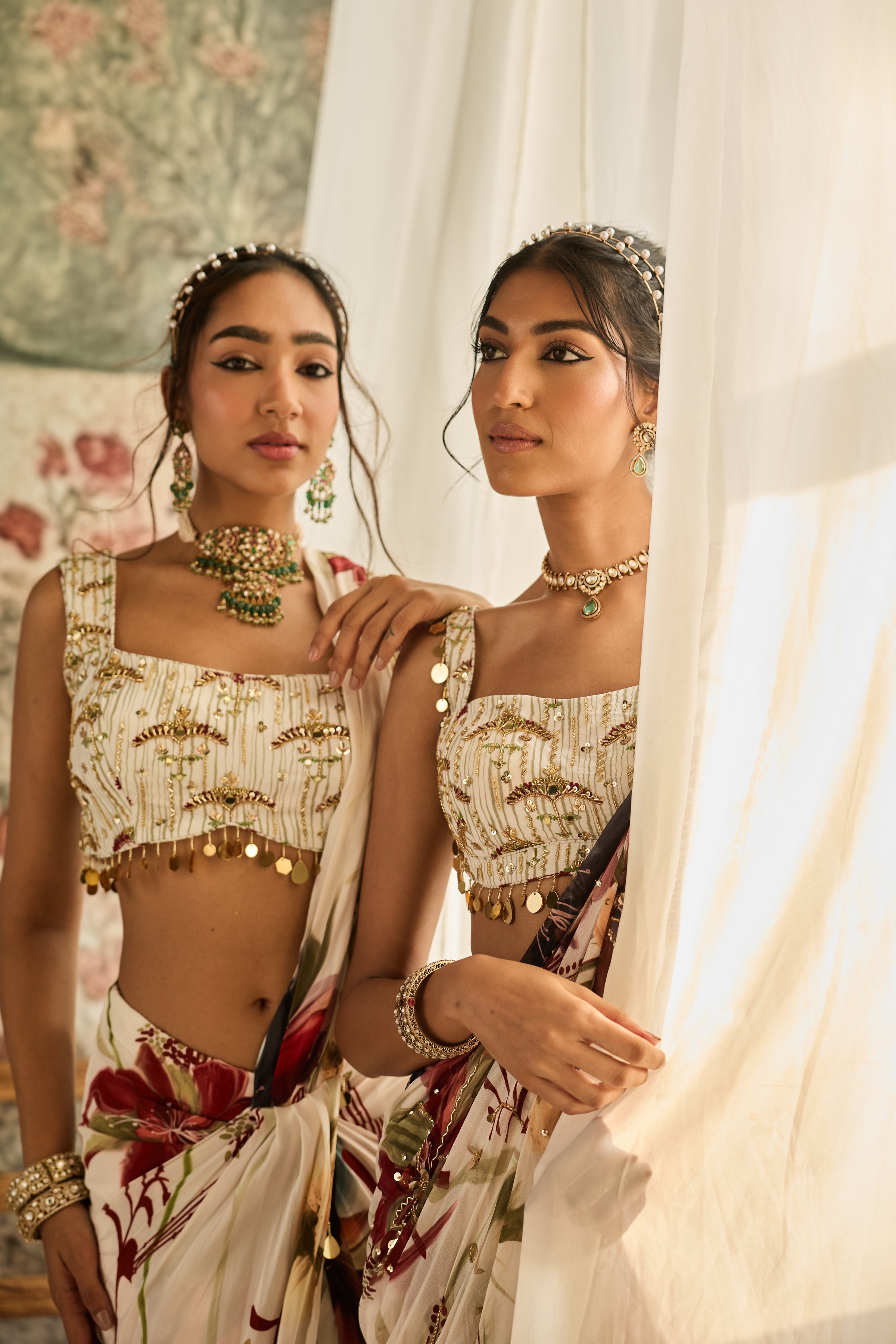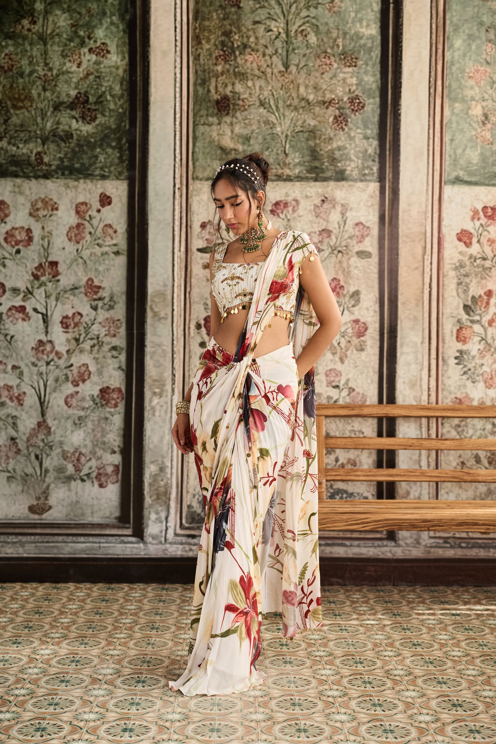 Ivory Floral Printed Skirt Saree Set