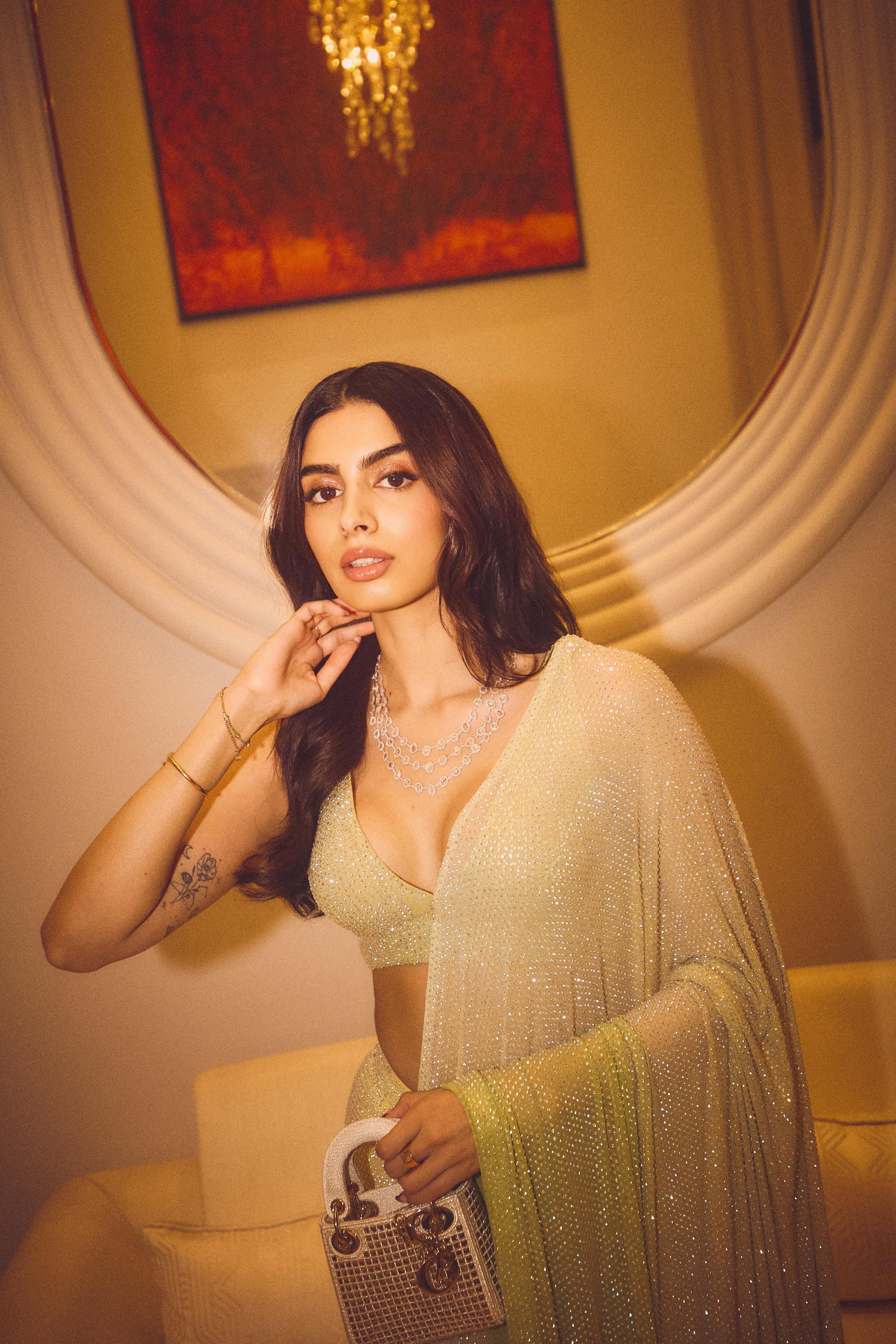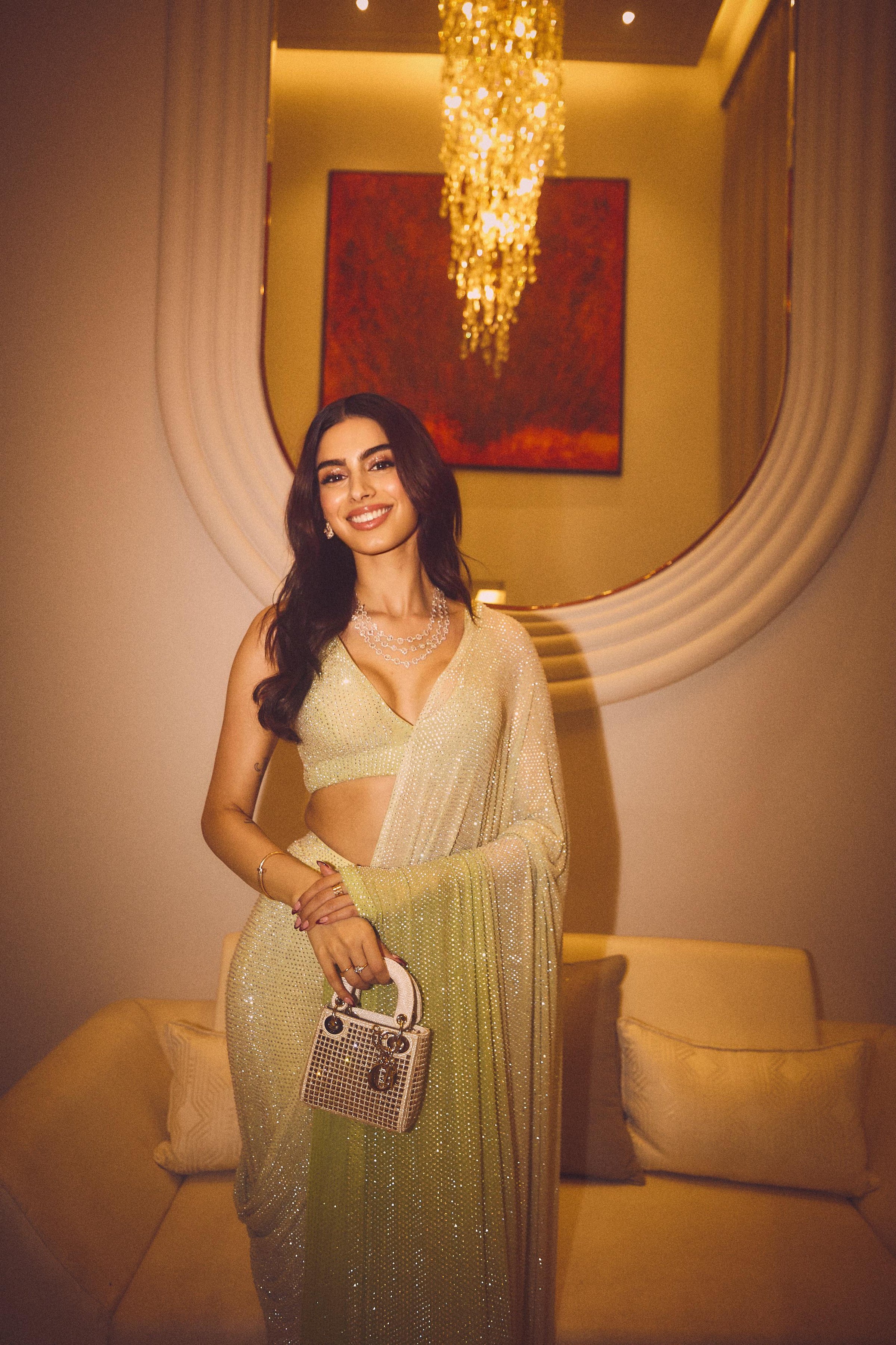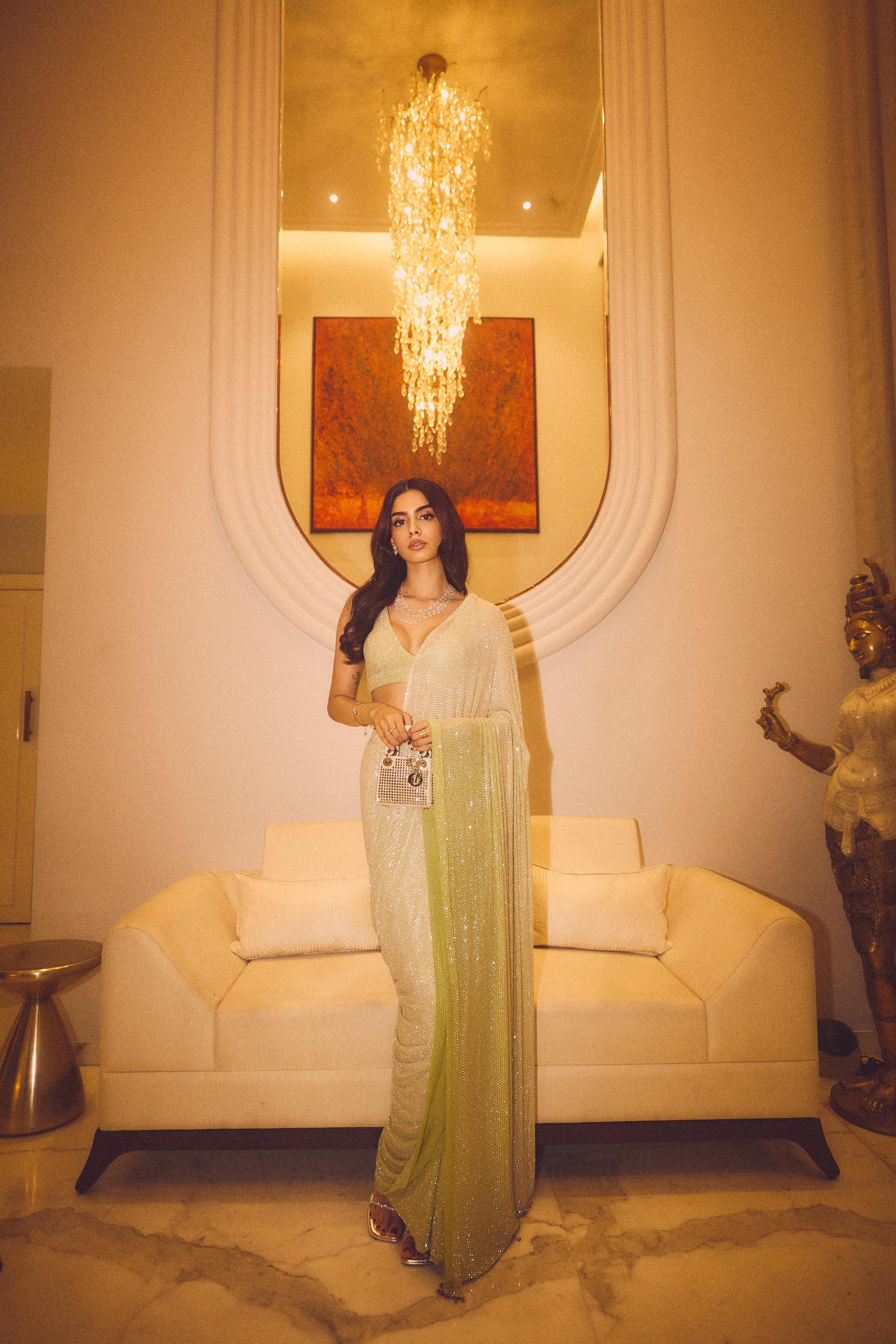 Mint ombre crystal embellished pre-stitched saree with rhinestones fringes on the palla edges paired with a deep neck blouse.