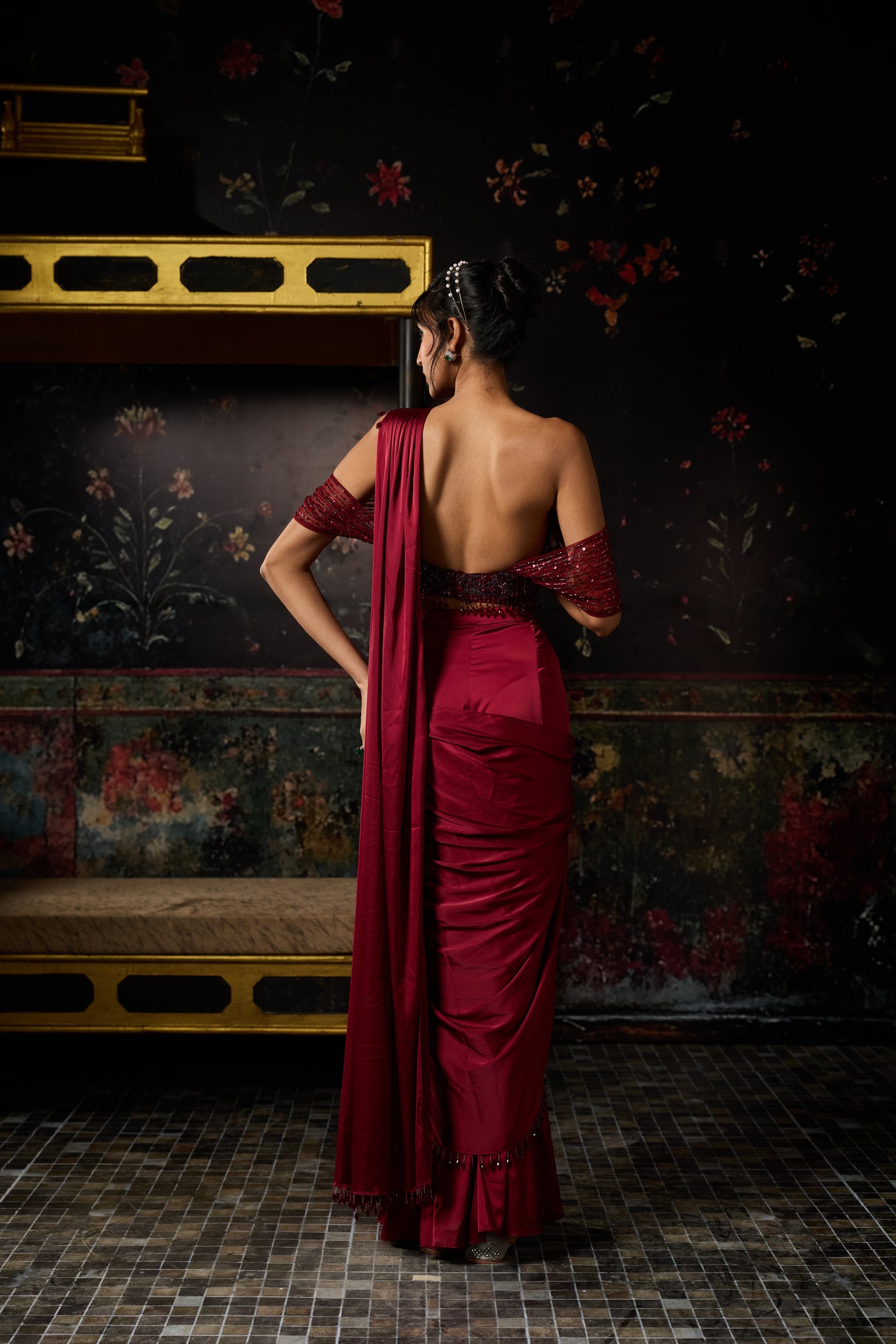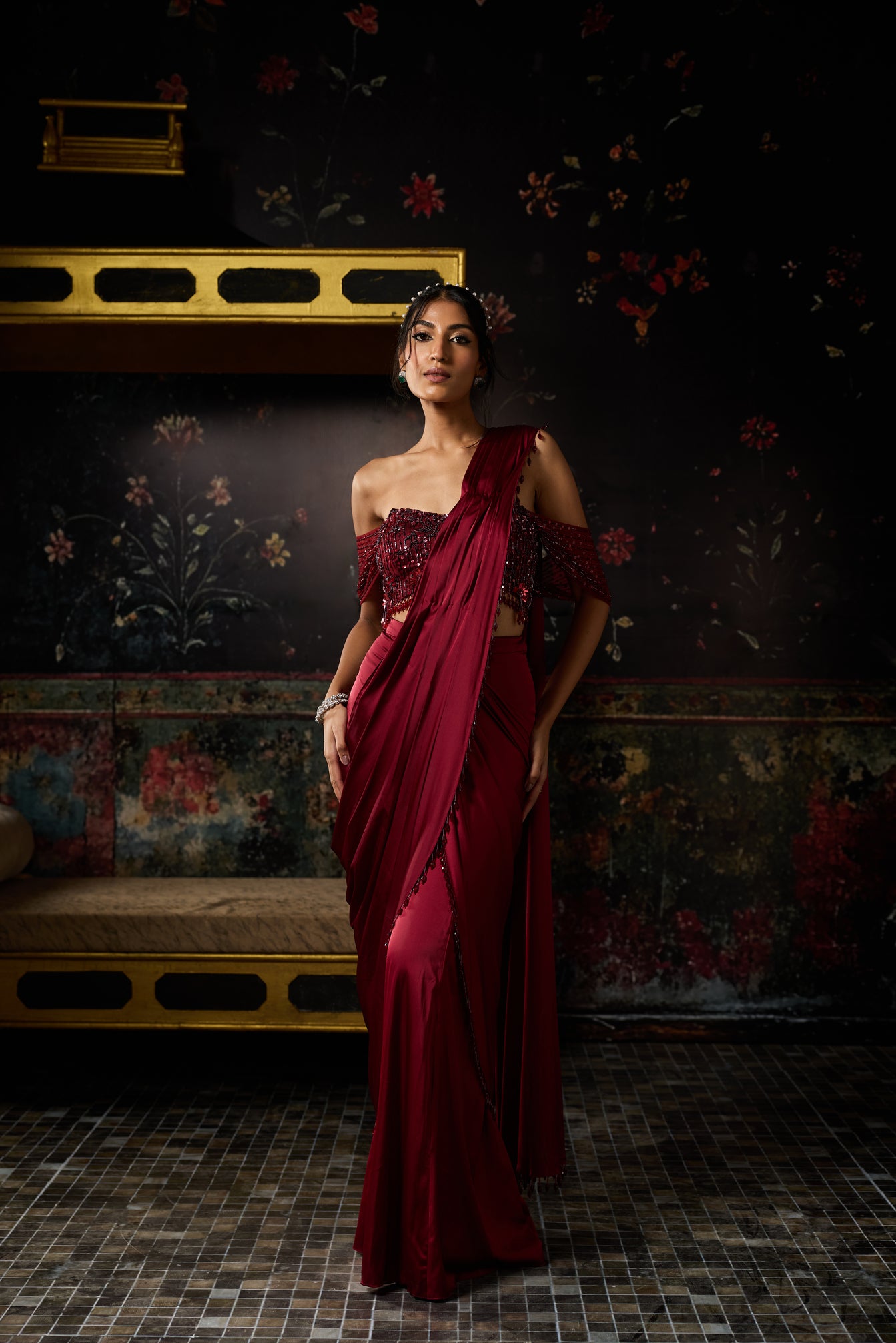 Maroon 3D Floral Embellished Off Shoulder Blouse With Maroon Sharara Saree