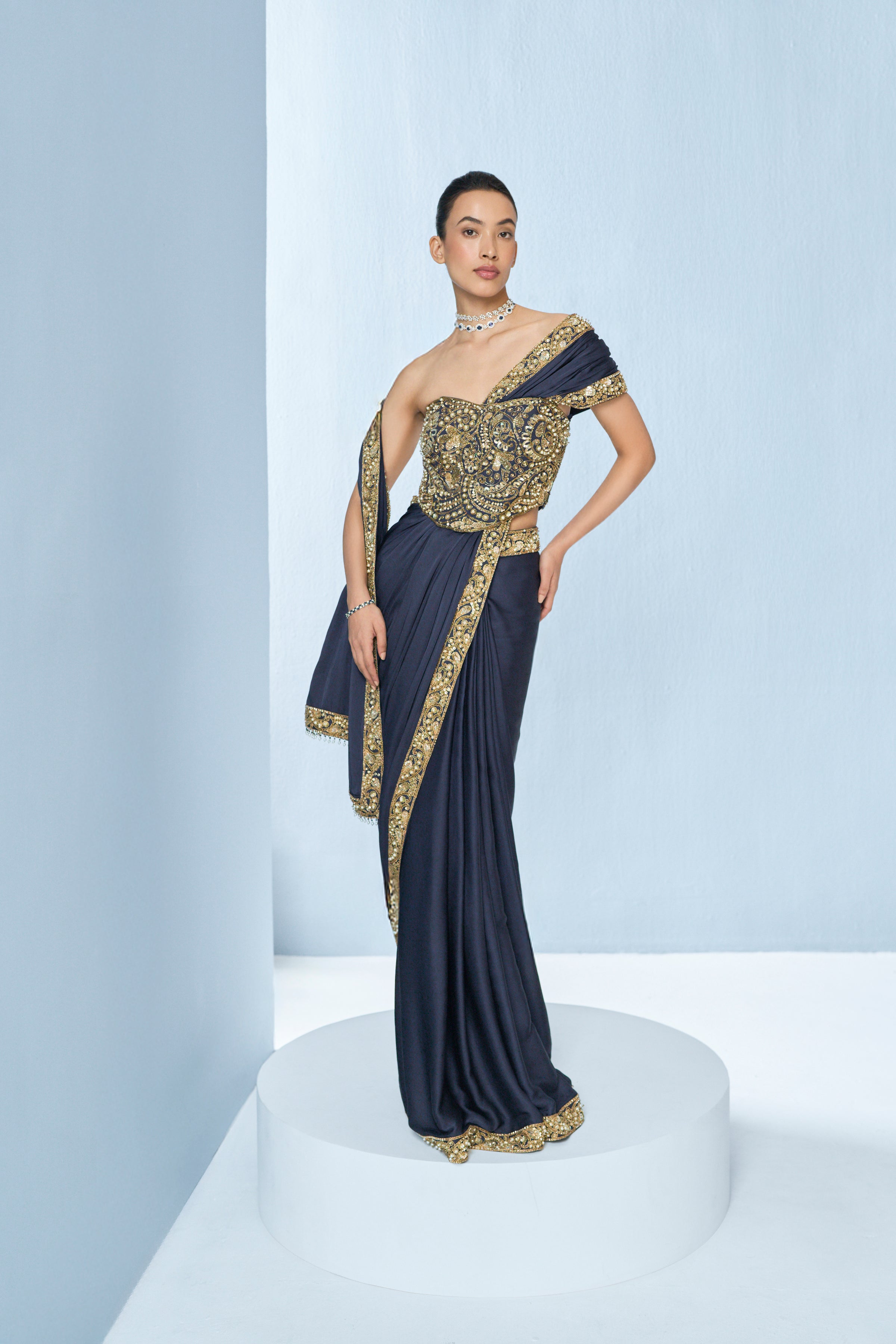 Midnight blue satin unstitched saree with an intricate border paired with a fully embroidered corset blouse. The embroidery materials used are sequin, cutdana, saadi, dori and pearls.