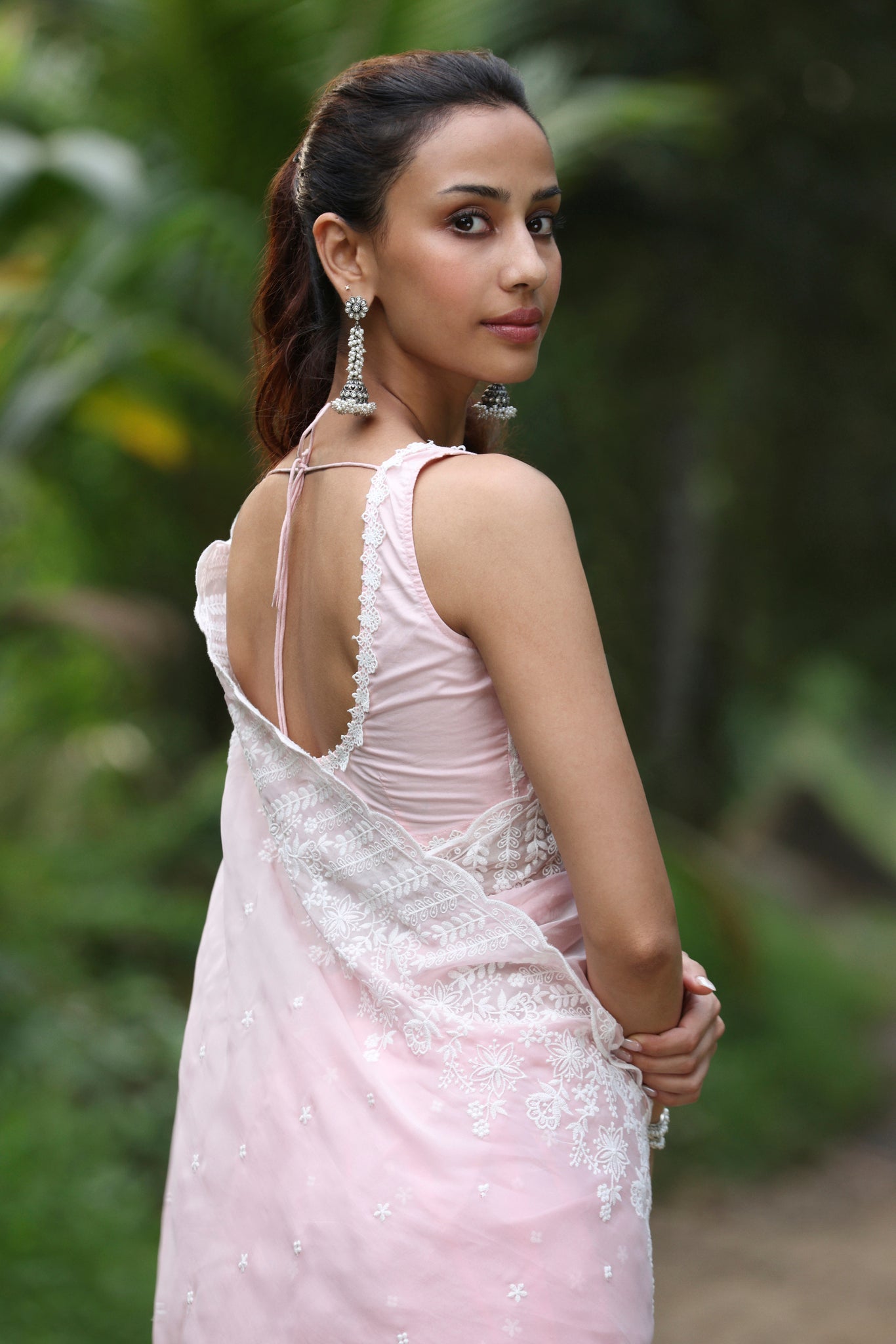 A vision of grace and femininity, this blush pink saree is an ode to timeless summer elegance. Crafted from lightweight organza, it drapes fluidly, creating an ethereal silhouette. The saree is adorned with delicate floral embroidery and intricate threadwork. The scattered white motifs on the soft ombre base add a subtle contrast, lending a dreamy appeal to the soft pastel hue. The border is beautifully detailed with scalloped embroidery, adding a refined finish to the design. This saree is perfect for intimate celebrations, summer weddings, or festive gatherings. Paired with an unstitched blouse piece.