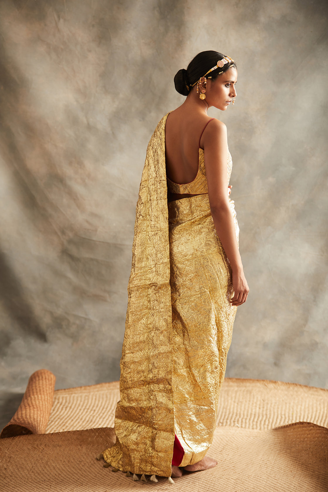 Gold zari woven lampi panaled saree palla with the pure crepe body styled with woven zari gold blouse