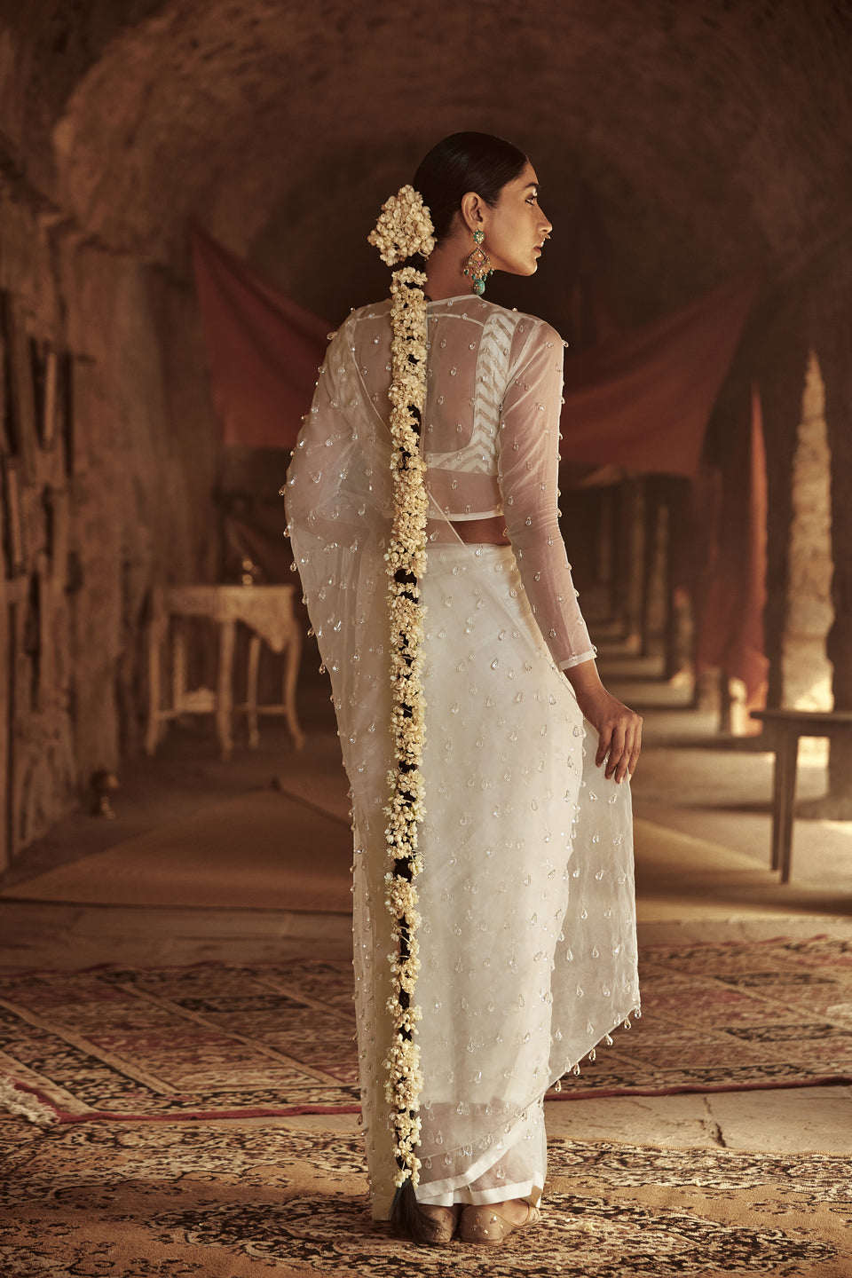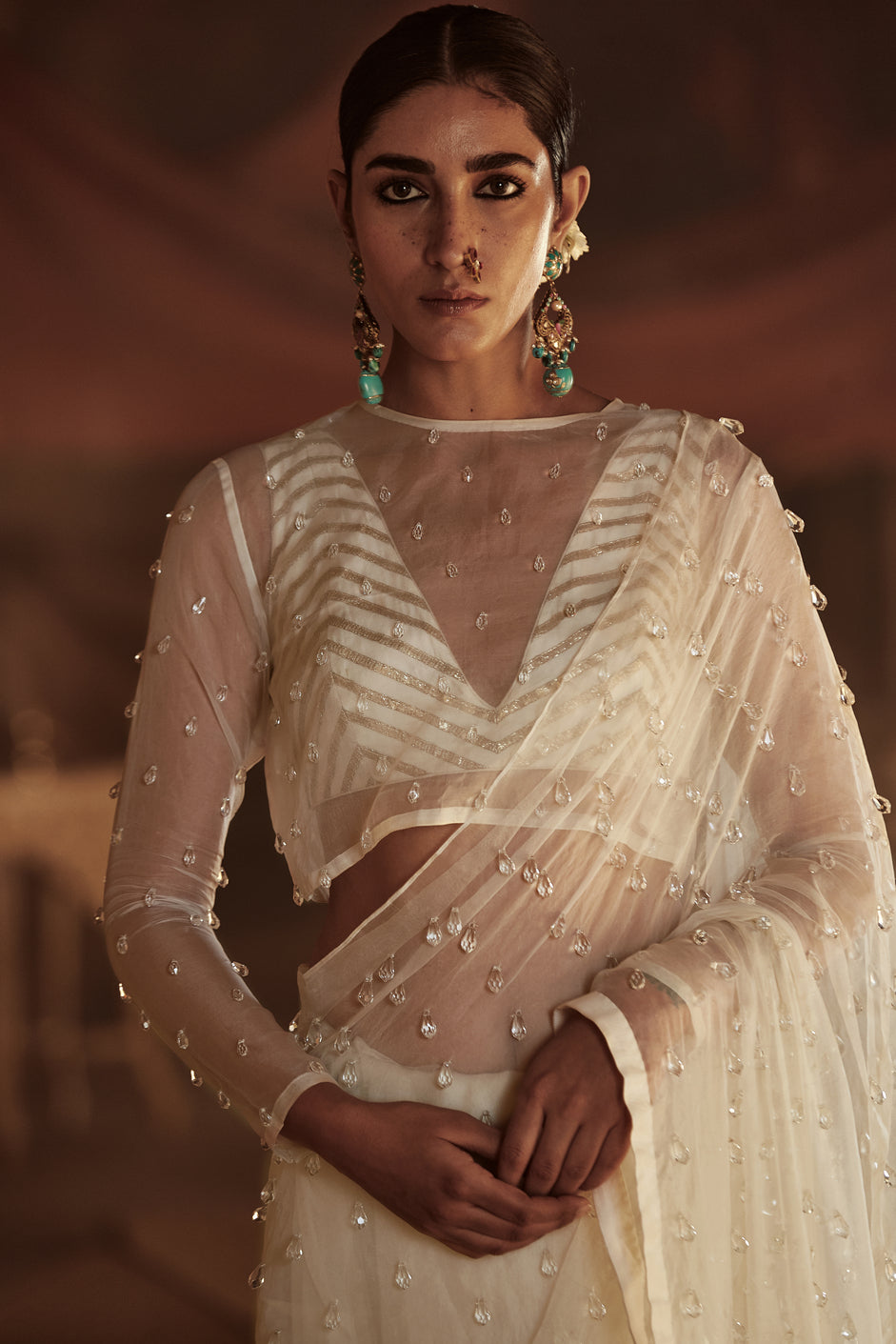 silk organza saree adorned with crystal droplets with the two pieces blouse that has zig-zag chanderi gota inner with crystal organza sheer crop top.