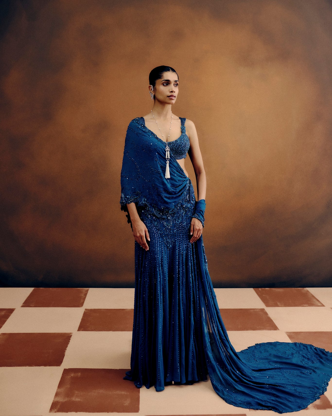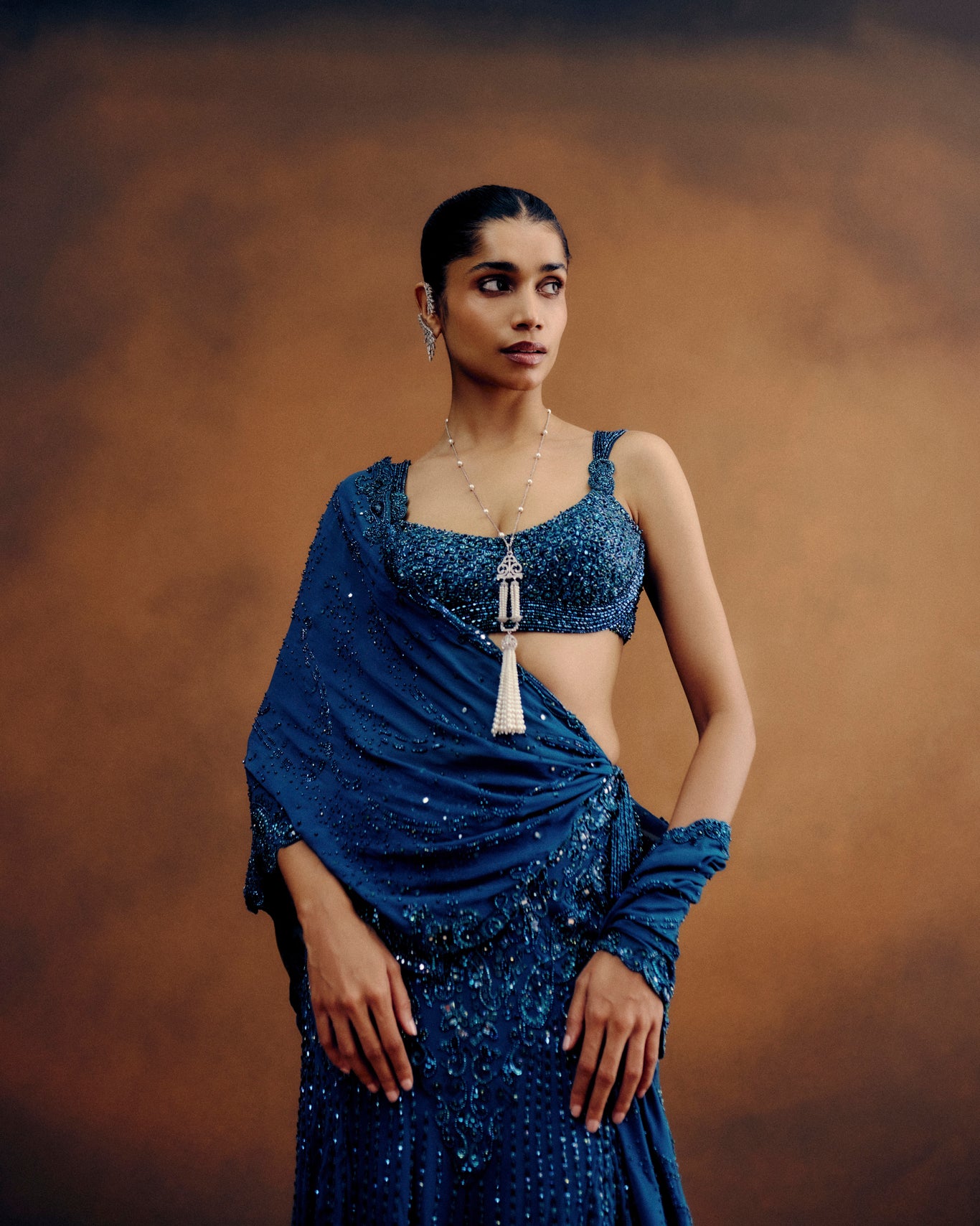 An Opulent Ode To Monochrome Elegance — This Crystal-Embellished Drape Saree In Deep Teal Georgette Is Entirely Hand-Embroidered, Each Facet Shimmering With Couture Precision.