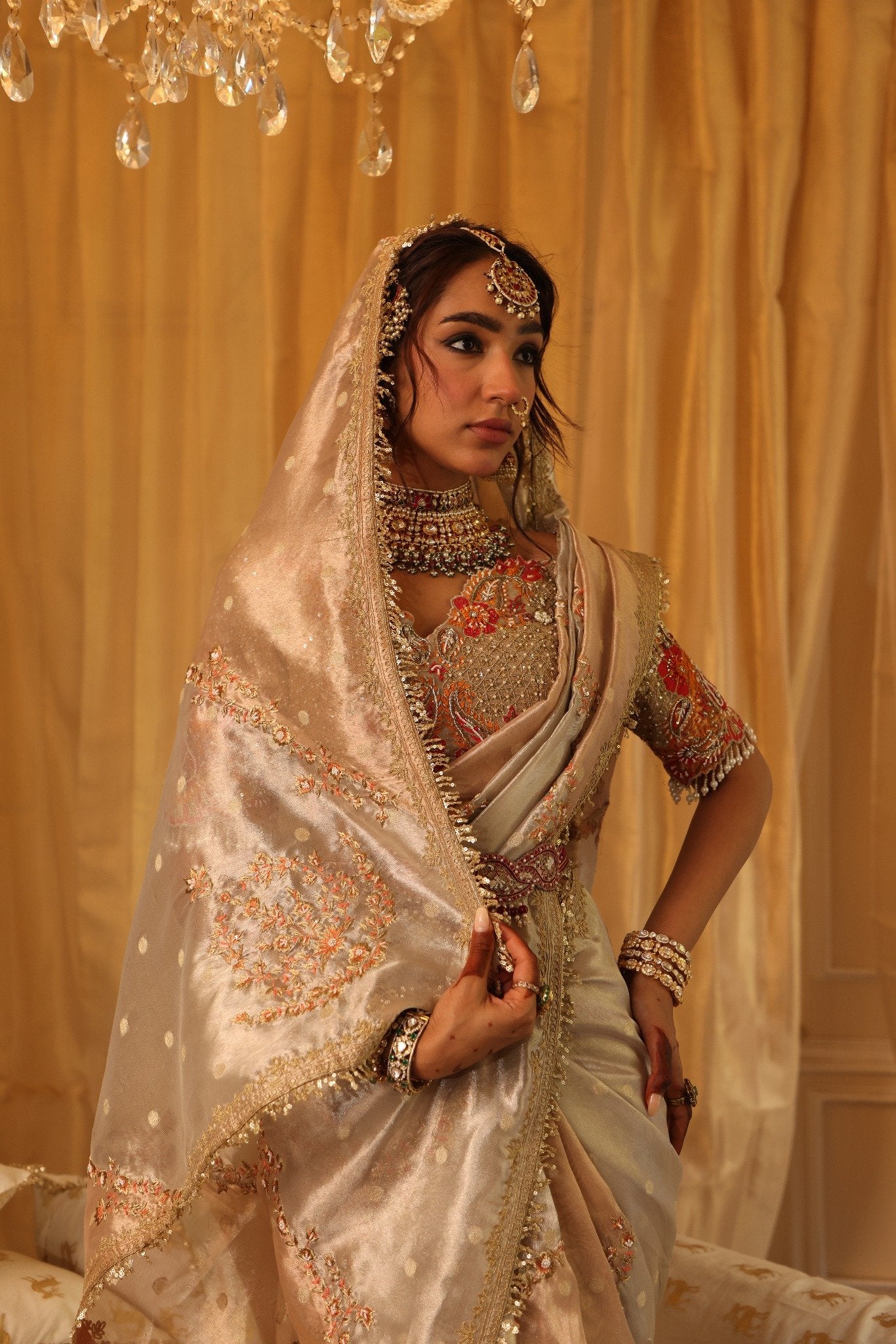 This exquisite 6-yard pure zari tissue saree in pearl gold and rose gold features intricate Mughal-inspired zardozi and thread embroidery. The rose gold palla showcases celestial moon motifs, while delicate lotus patterns add grace. Paired with a handcrafted blouse and lycra satin petticoat