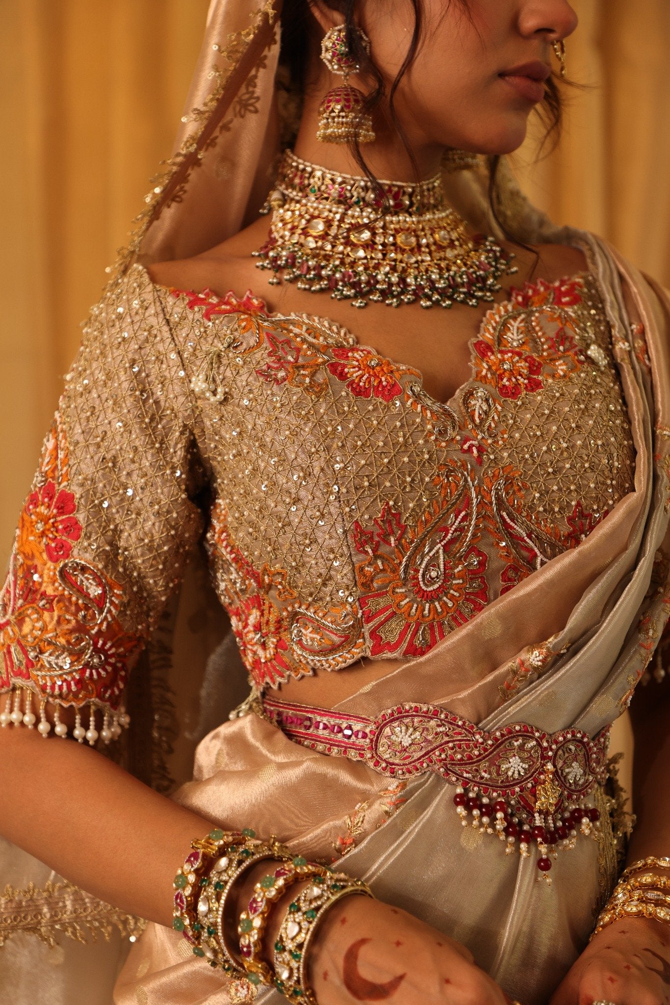 Embroidery & Embellishments: Mughal-inspired embroidery with celestial moon motifs, while delicate lotus patterns