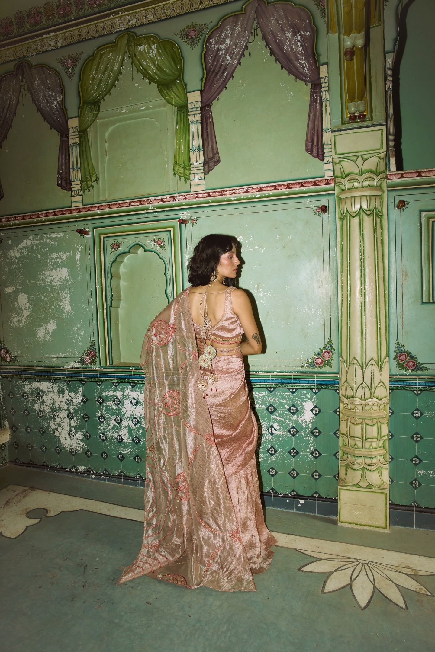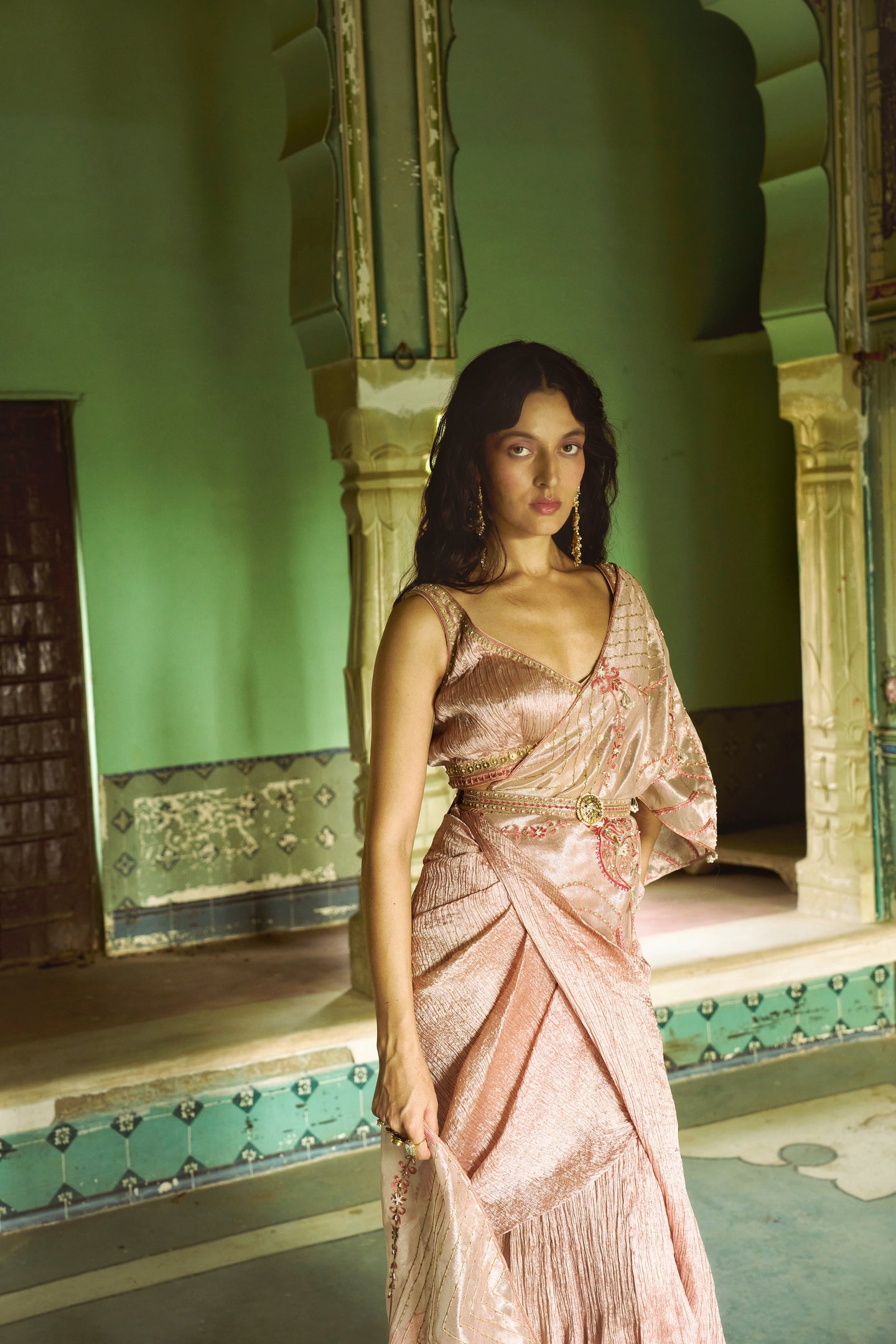 Rose gold crushed silk saree