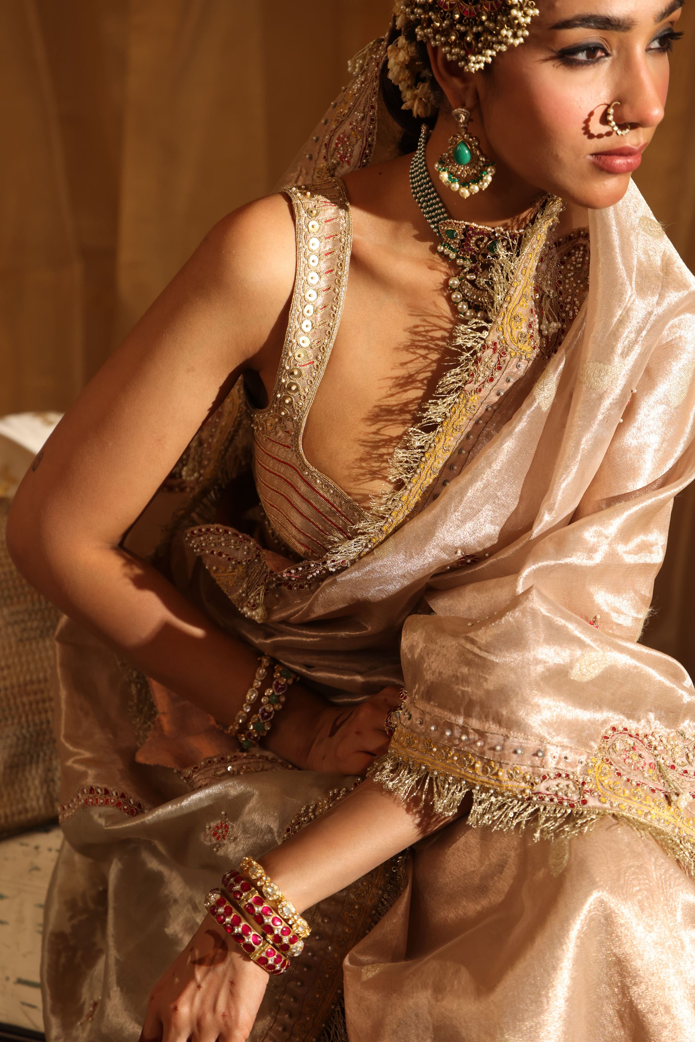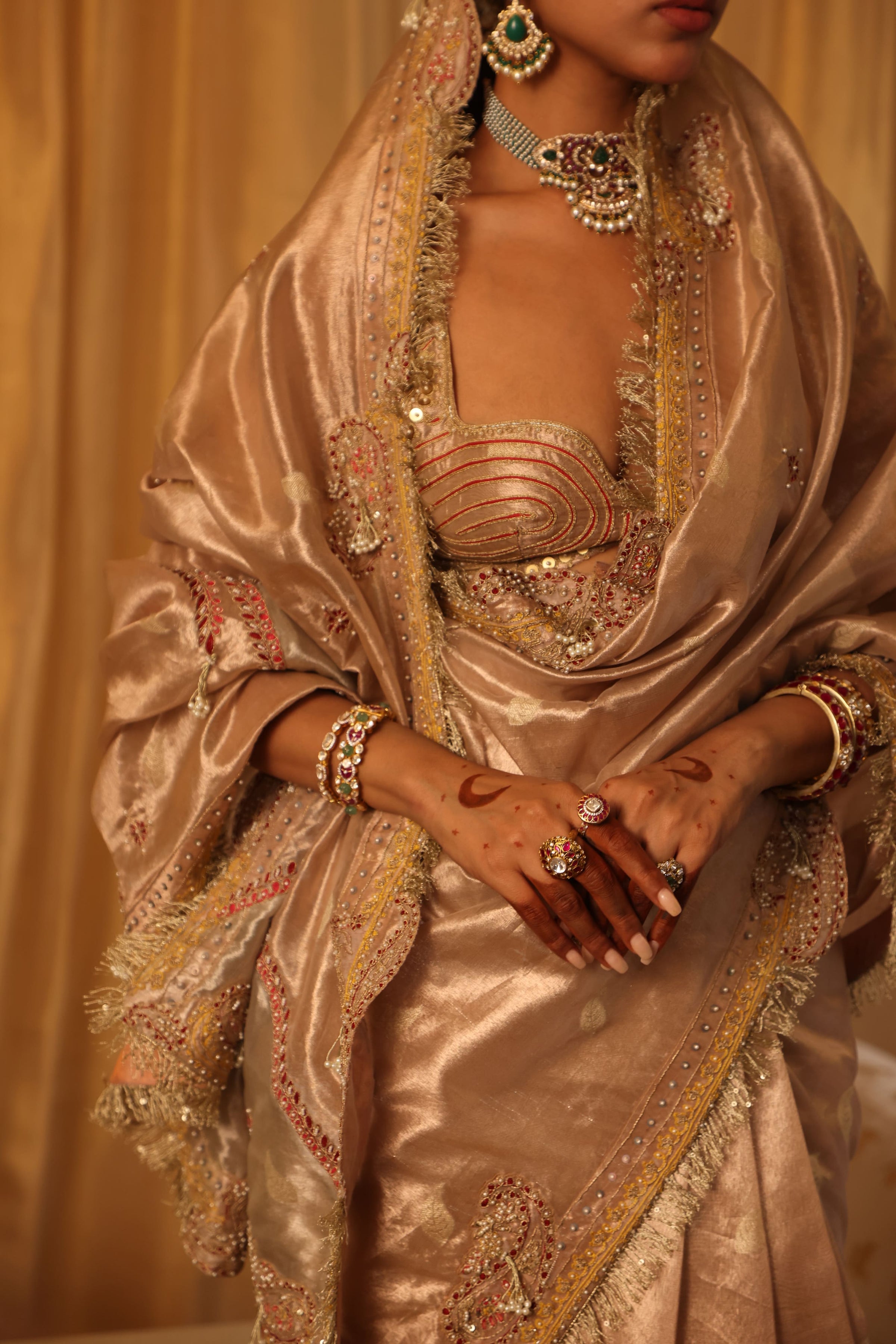 This 6-yard rose gold pure zari tissue saree is a stunning blend of elegance and craftsmanship, featuring woven leaf motifs and intricate zari, dori, pearl, and hand embroidery. The pearl gold pallu, adorned with paisley motifs and fringe accents, adds a luxurious touch. Paired with a lycra satin fish-cut petticoat and a heavily embroidered blouse with a deep sweetheart neckline.
