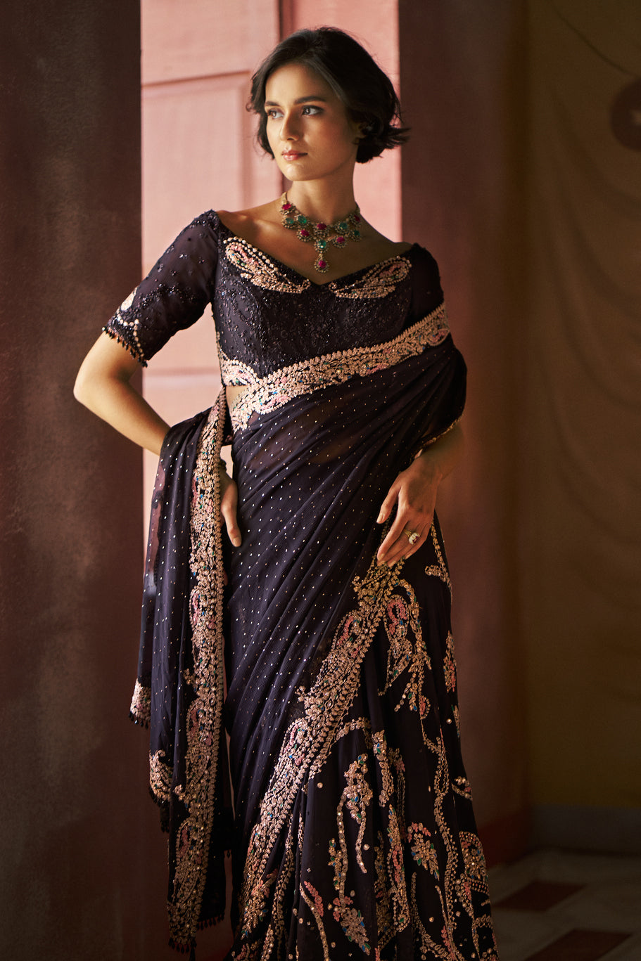 In A Striking Noir Hue, This Kalidaar Saree Features Intricate Kasab Embroidery, Paired With A Kamdaani-Enhanced Aanchal That Exudes Timeless Elegance. The Net Blouse, Adorned With Tonal Embroidery, Completes This Sophisticated Ensemble With An Air Of Luxurious Refinement.