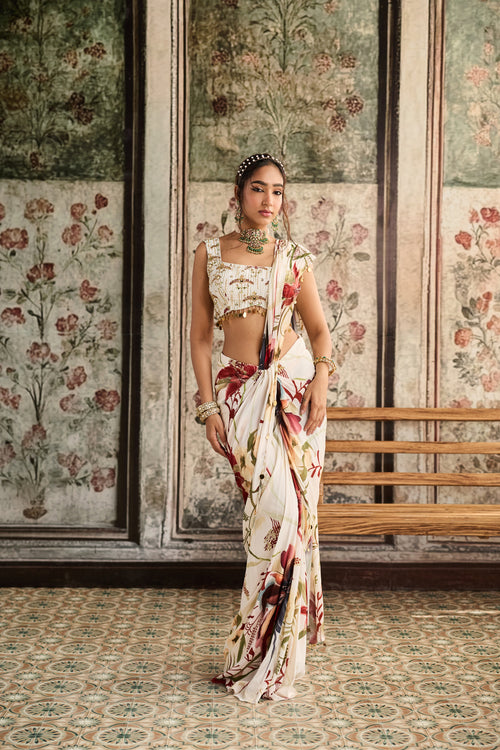 Ivory Floral Printed Skirt Saree Set