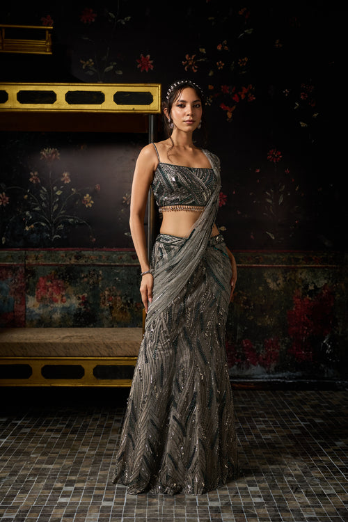 Grey Embellished Mermaid Skirt Saree Set