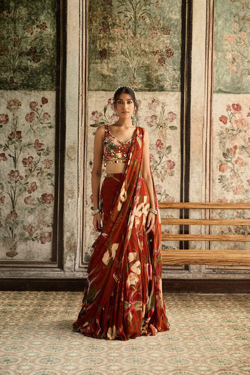 Rust Floral Print And Highlighted Mermaid Saree Set