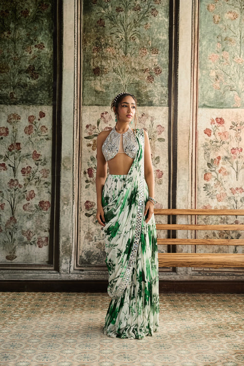 Ivory & Green Floral Print And Highlighted Border Skirt Saree Set