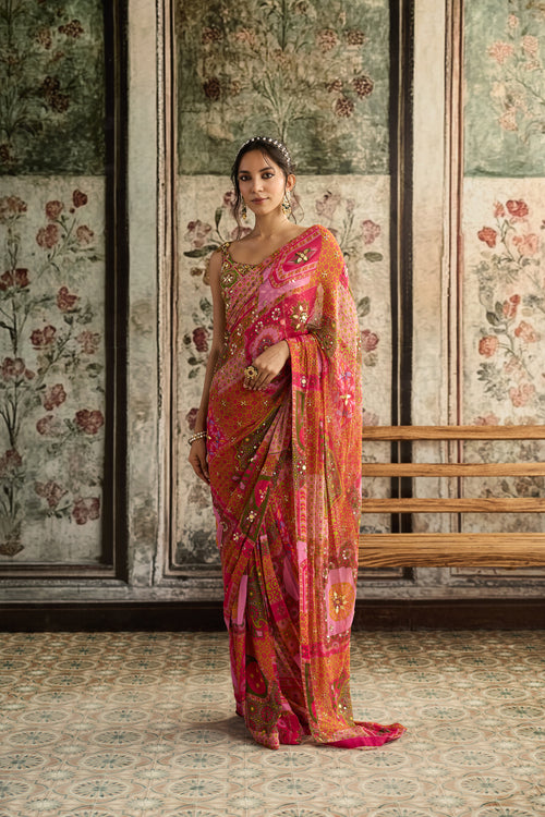 Fuschia Print And Highlighted Corset Blouse Paired With Pre-Draped Classic Saree Set
