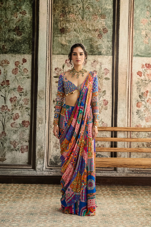 Multi-Color Print And Highlighted Plunge Neckline Blouse With Sharara Saree Set