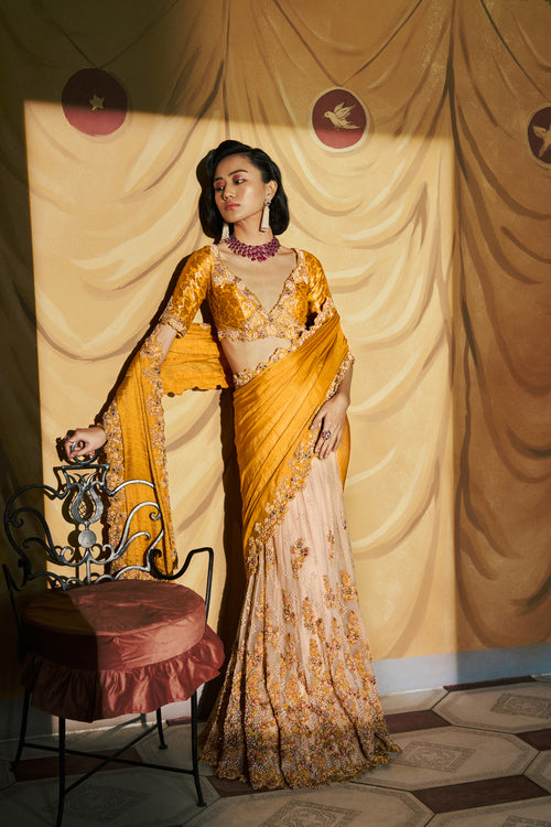 Beige & Maroon Print and Highlighted Skirt Saree Set