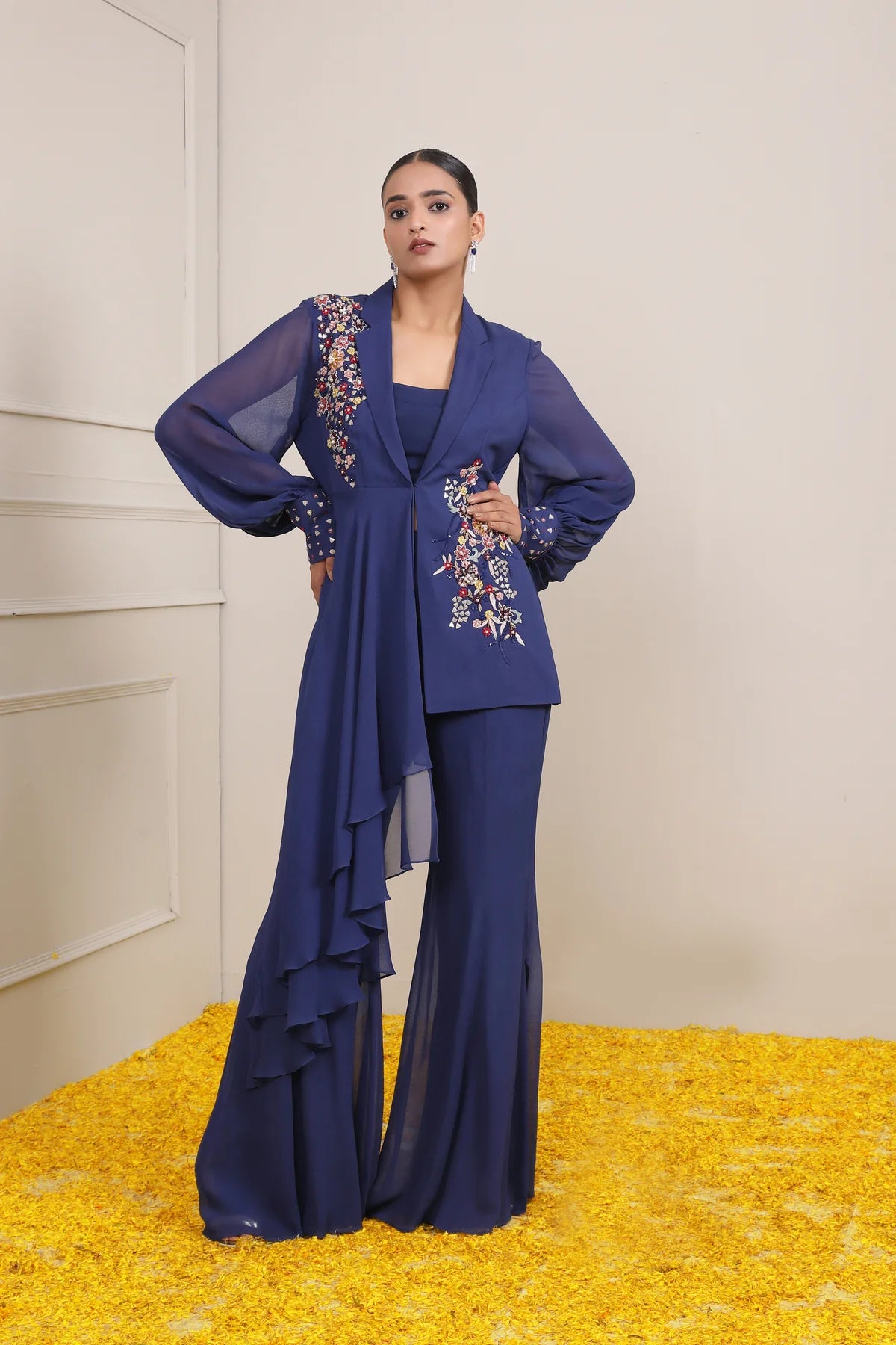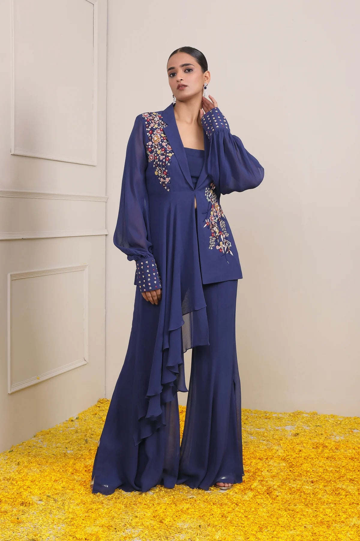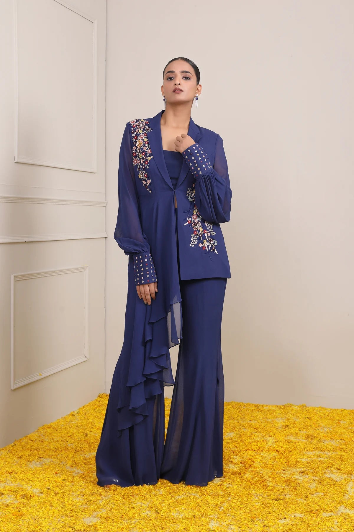 This ensemble is crafted in Navy Blue high-low Jacket in Georgette fabric with appliques and cut-dana embroidery. It is paired with a matching Inner and Palazzo Pants.
