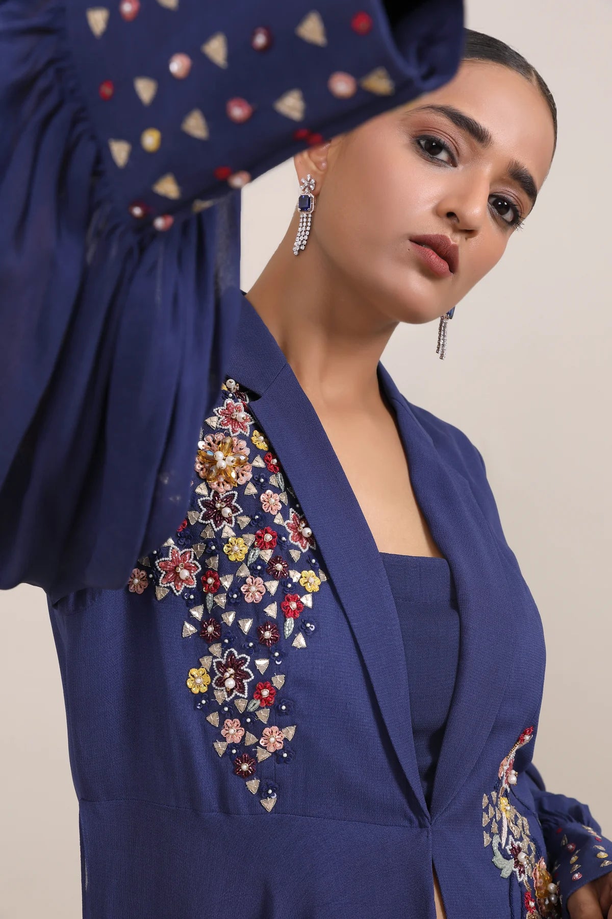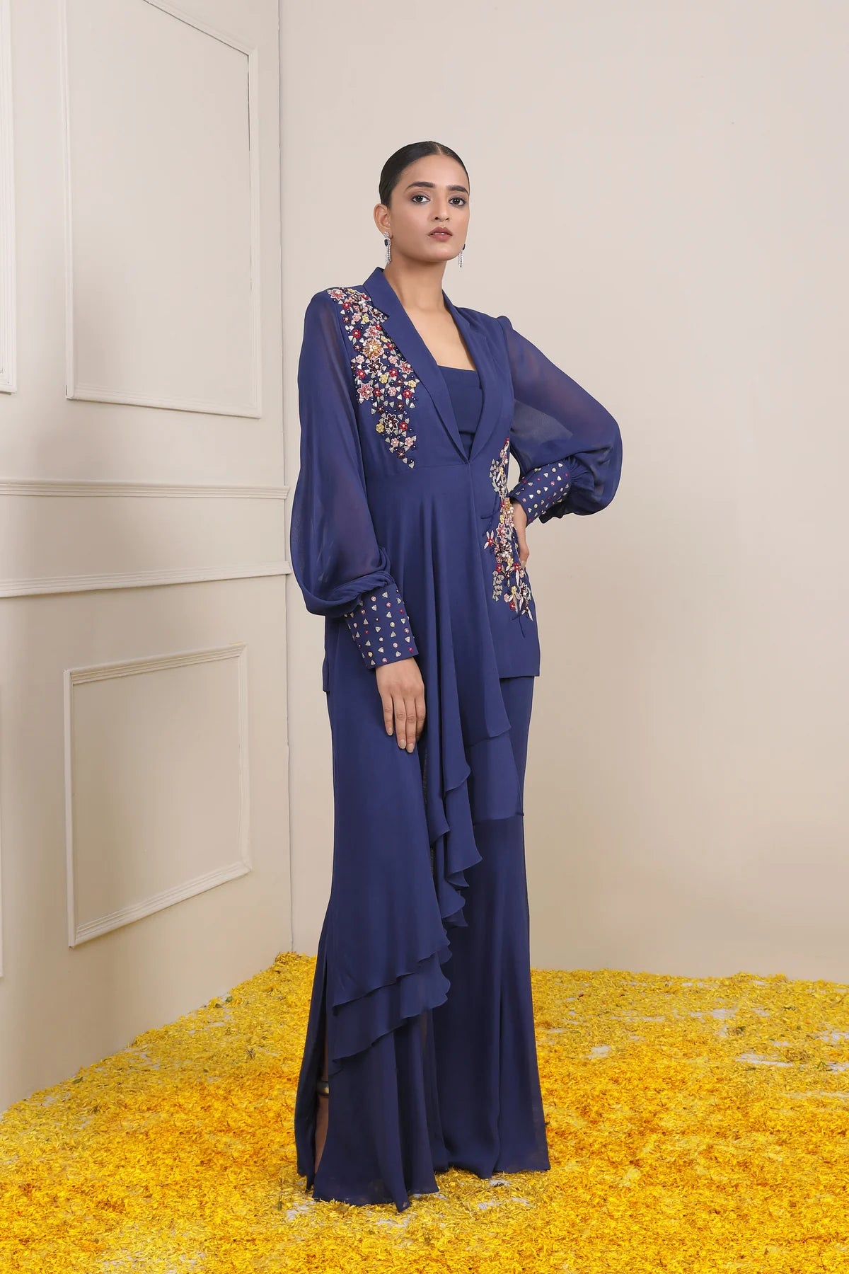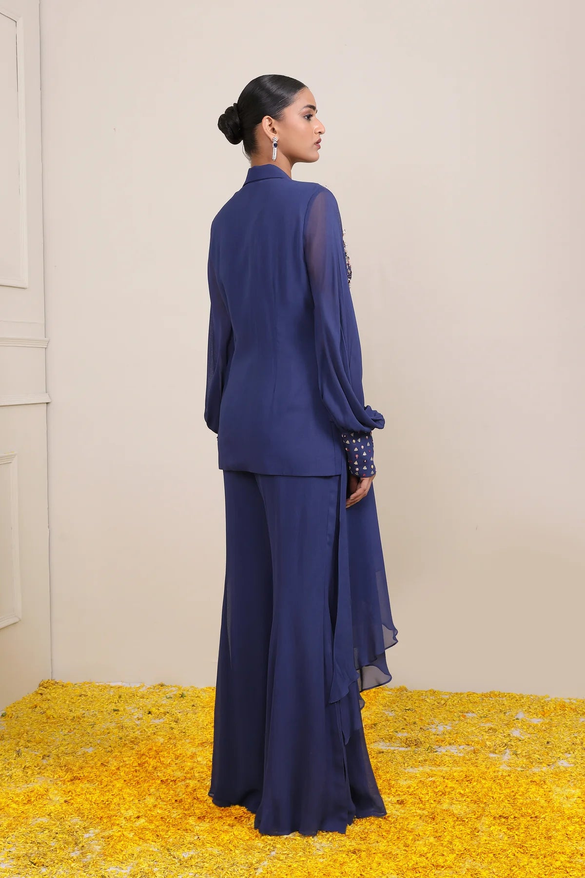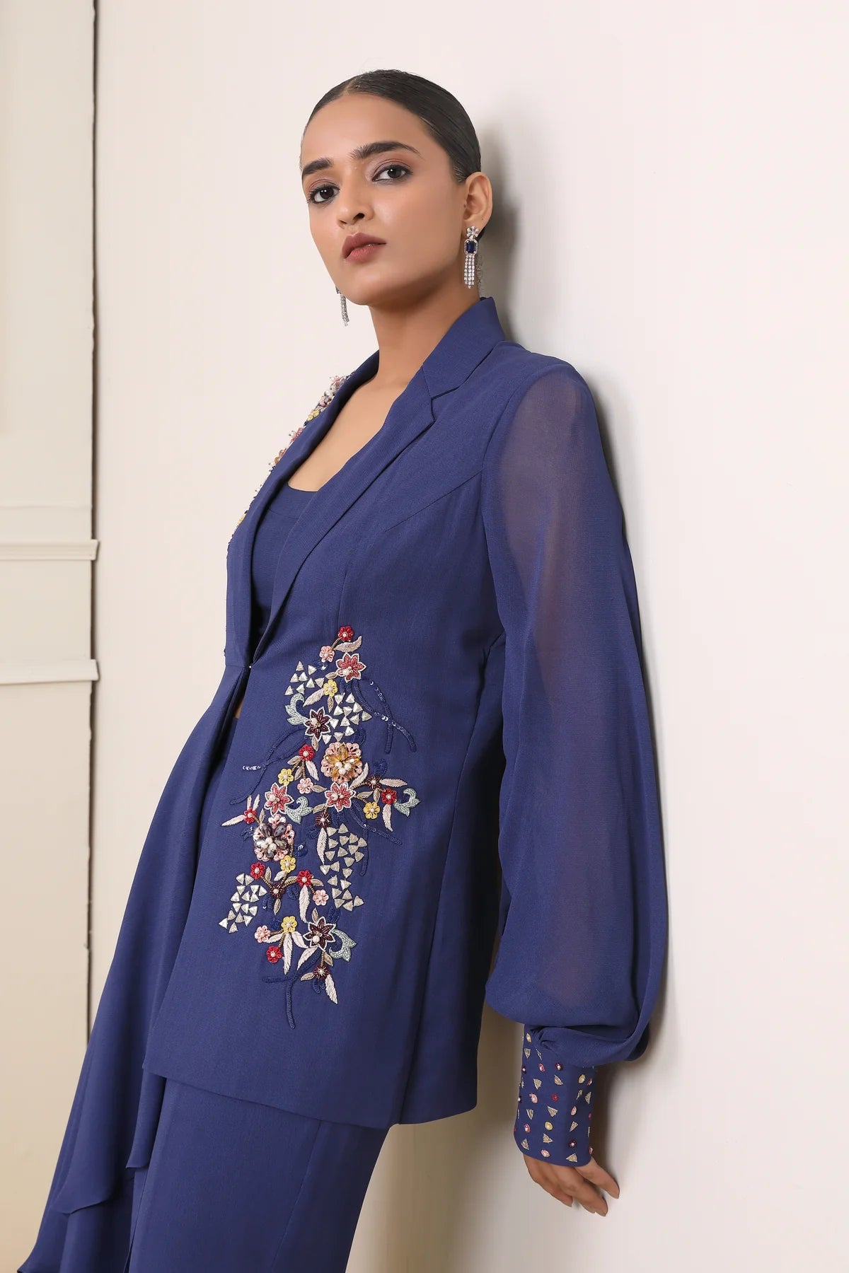 This ensemble is crafted in Navy Blue high-low Jacket in Georgette fabric with appliques and cut-dana embroidery. It is paired with a matching Inner and Palazzo Pants.