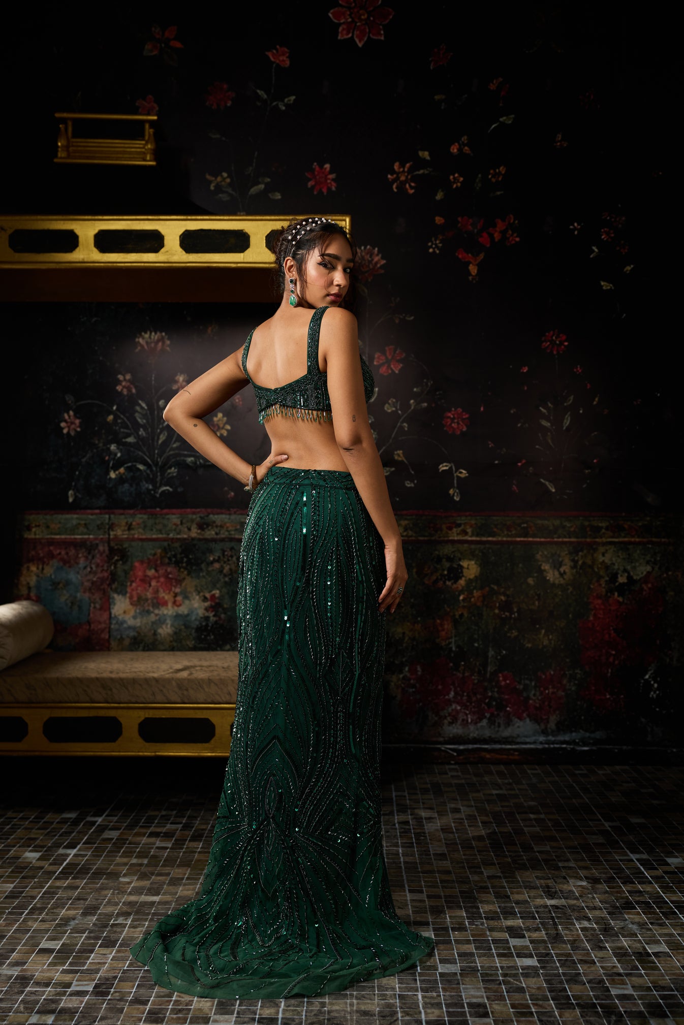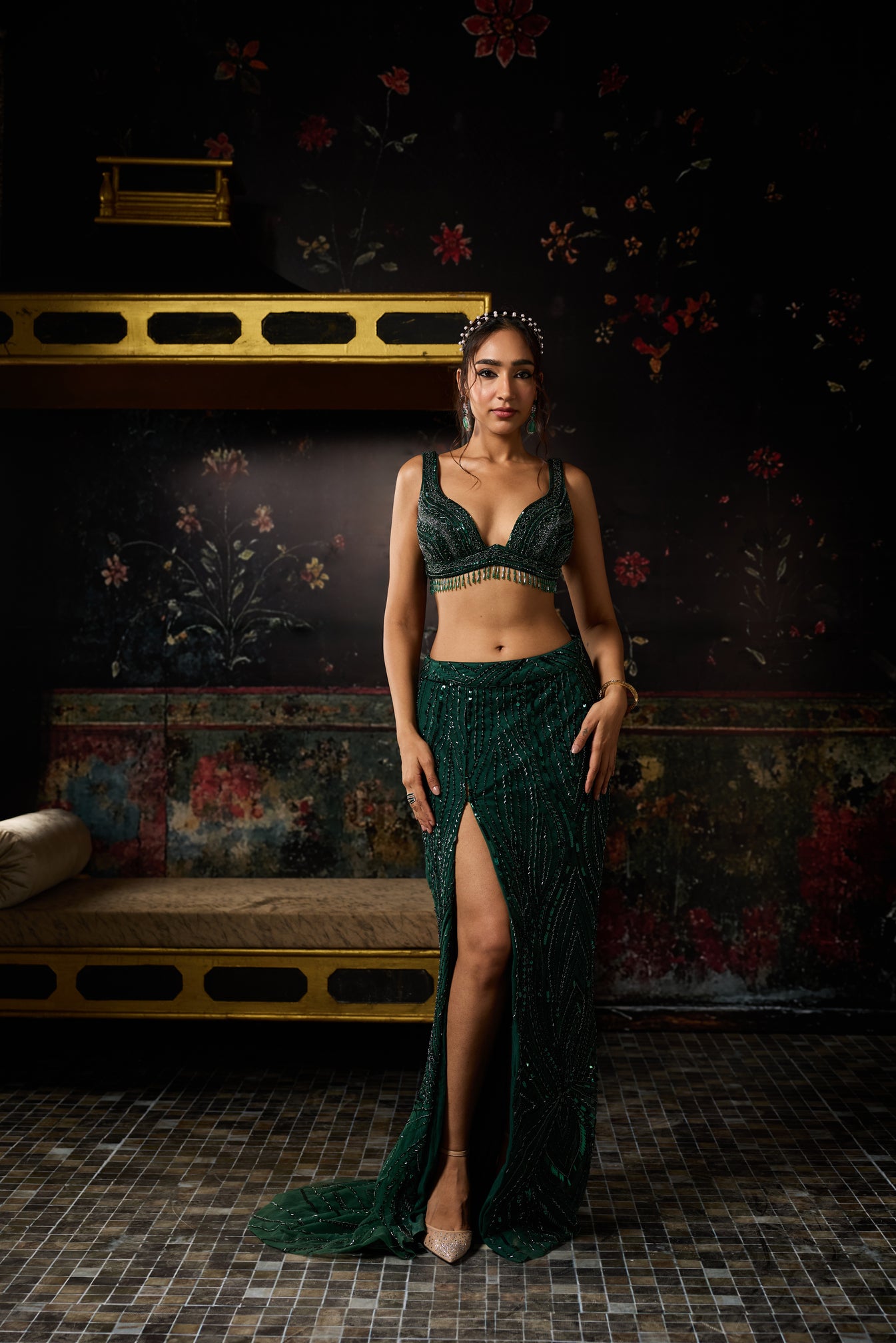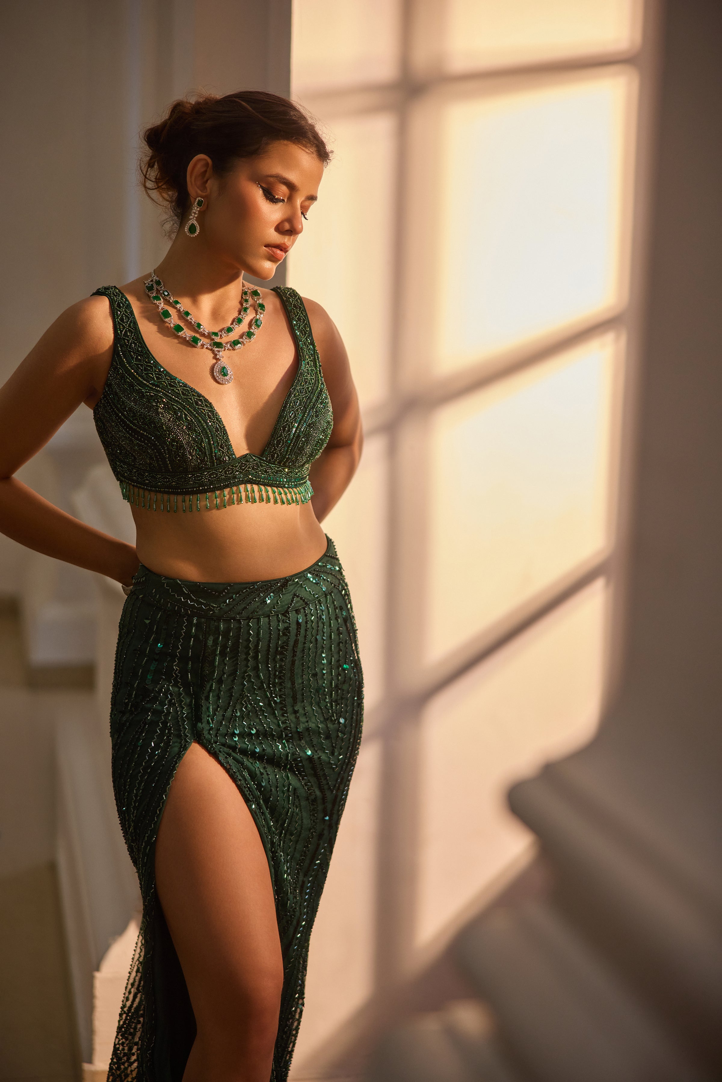 Emerald Green Mix Material Embellished Sleeveless Blouse With Embellished Trail Slit Skirt