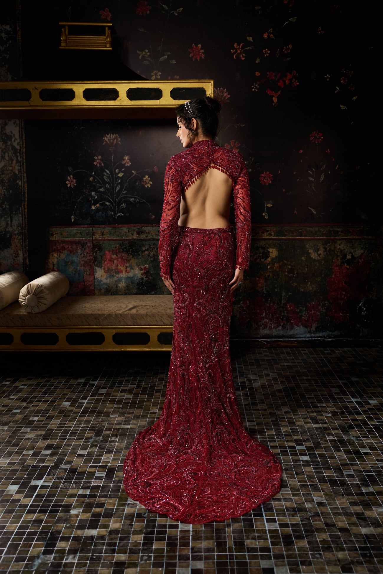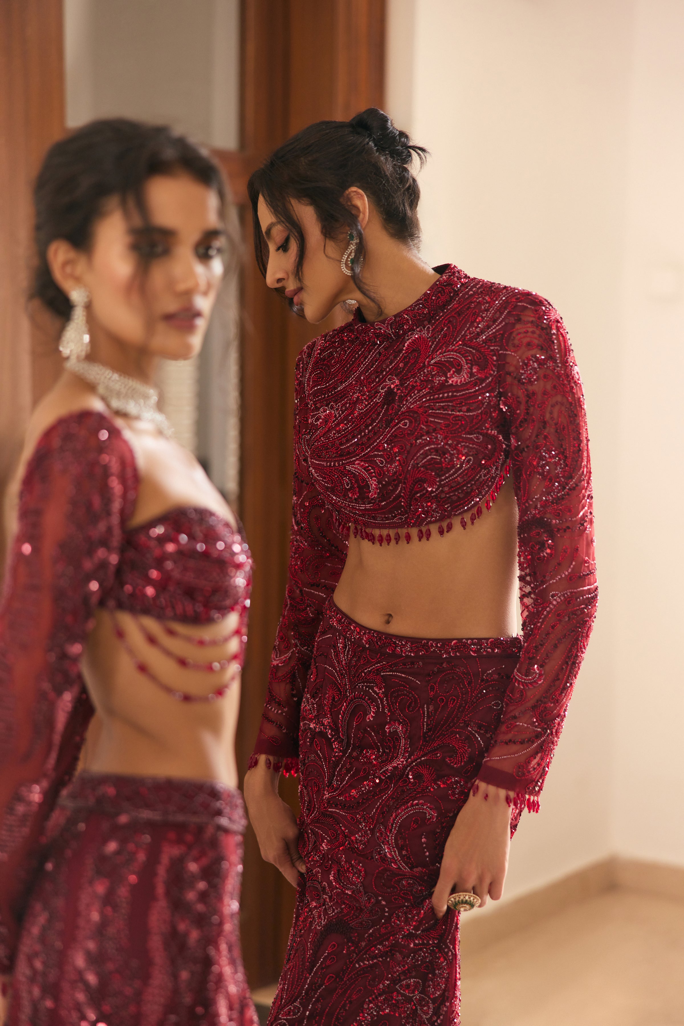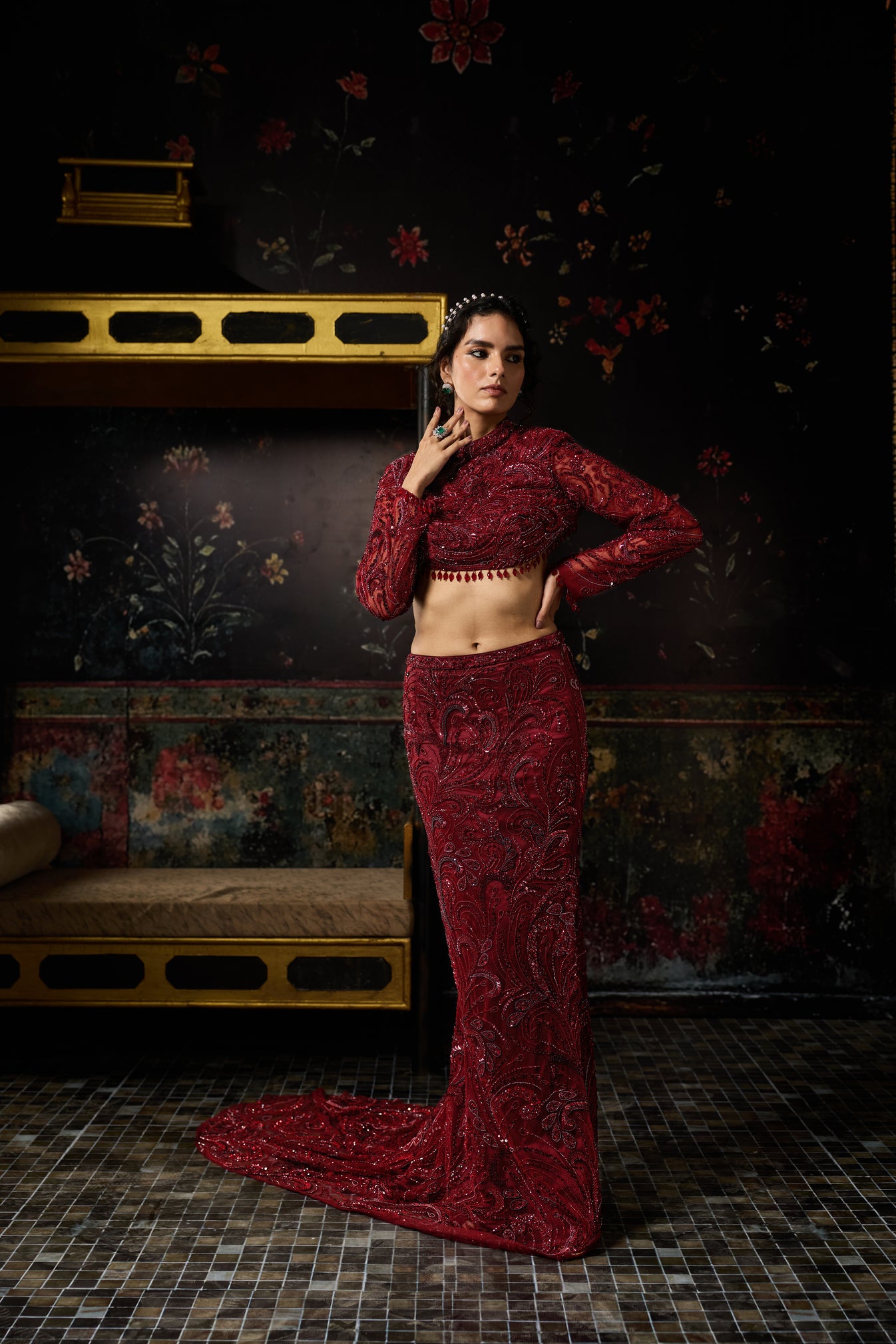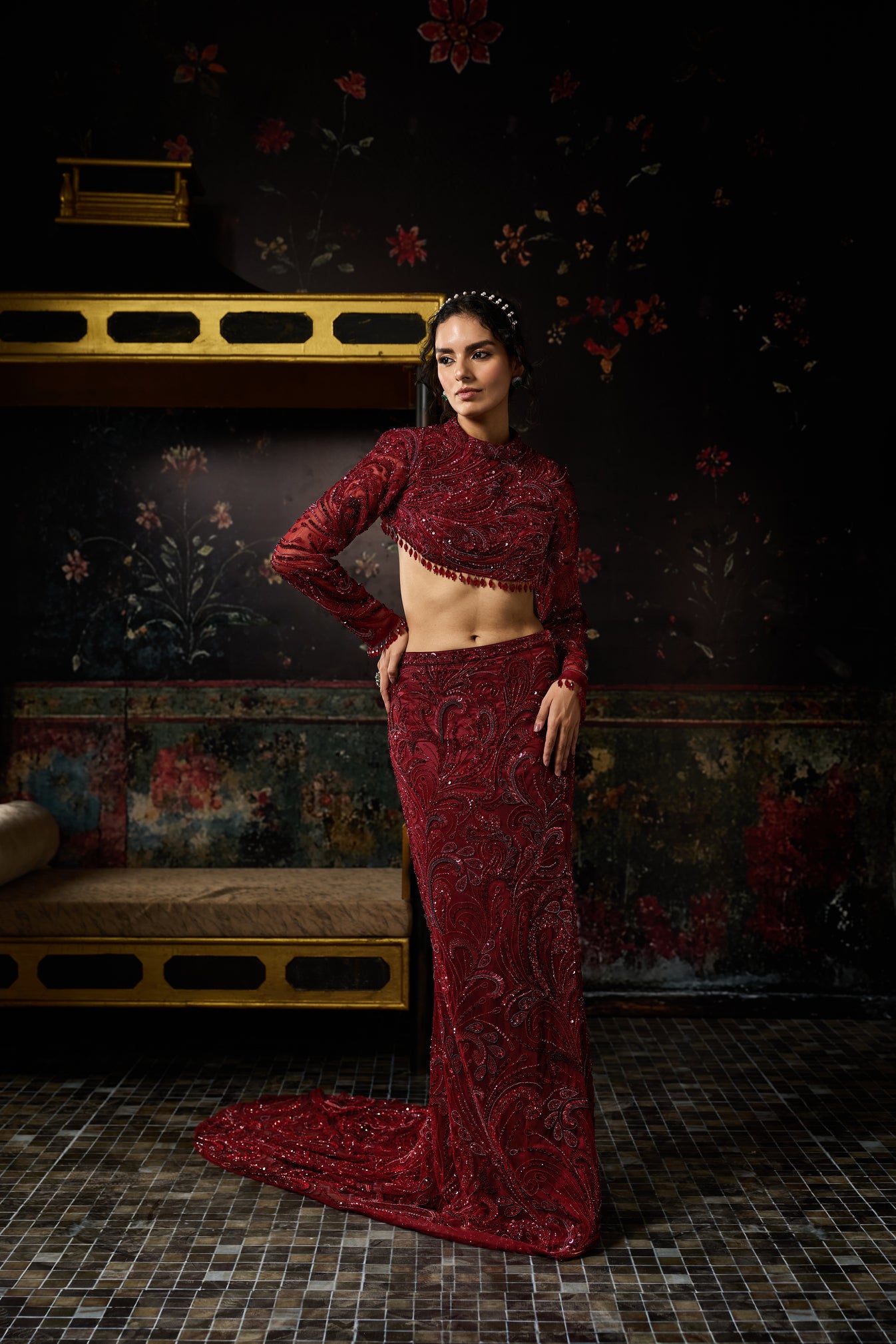 Maroon Mic Material Embellished Jewel Neck Cropped Full Sleeve Blouse With Embellished Long Trail Fitted Skirt