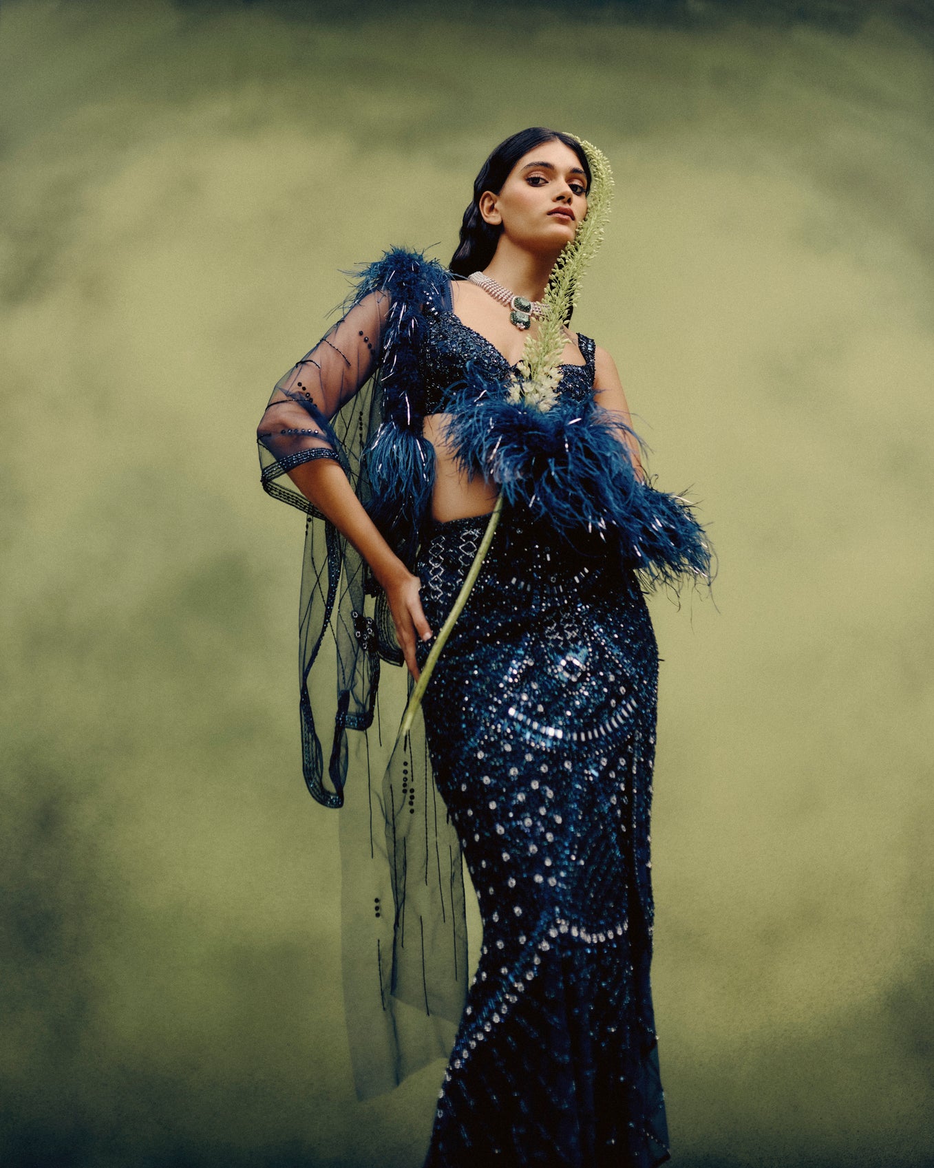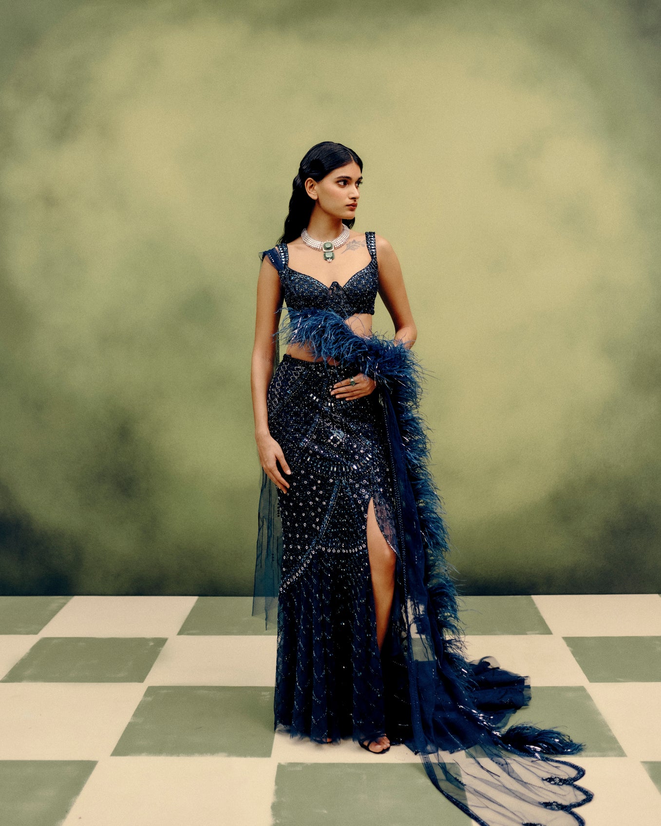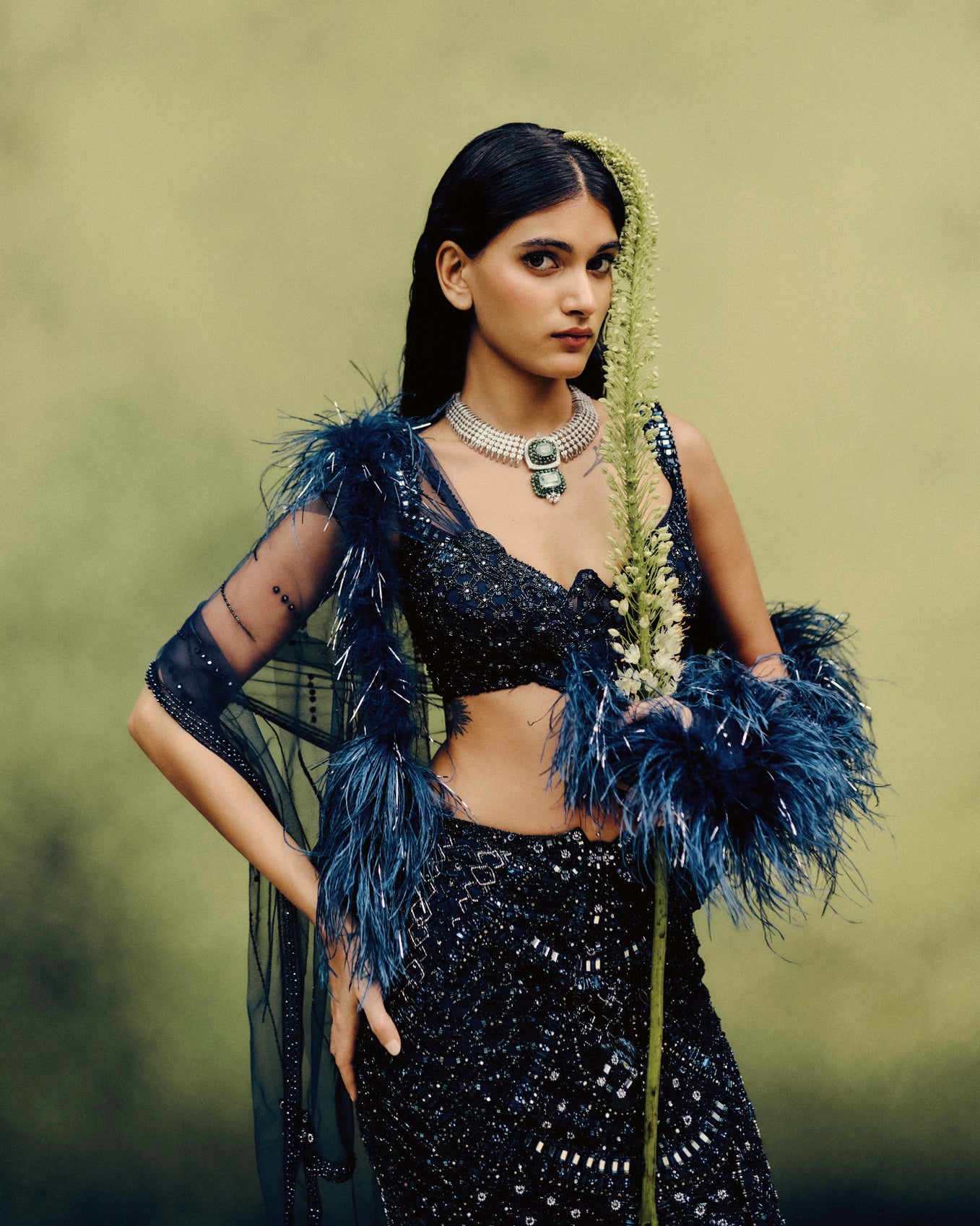 Bathed In The Allure Of Neon Navy, This Corset And Skirt Set Is Adorned With Meticulous Monochromatic Hand Embroidery, Punctuated By Glints Of Mirror Work That Catch The Light Like Scattered Stardust. A Feather-Draped Accent Cascades With Fluid Elegance, Framing The Ensemble’S Jewel-Like Craftsmanship.