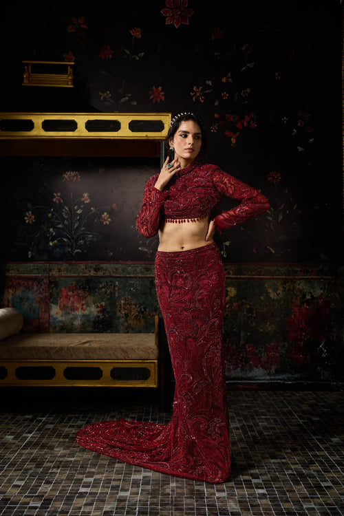 Maroon Embellished Trail Skirt Set