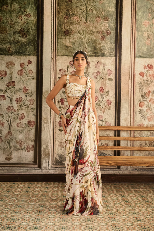 Ivory Floral Print And Highlighted Skirt Saree Set