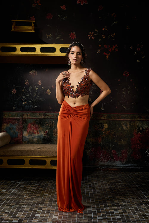 Rust Cutwork Blouse With Draped Skirt Set