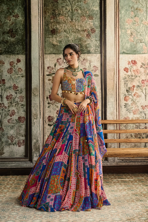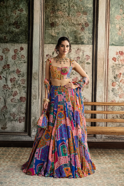 Multi-Color Print And Highlighted Criss-Cross Back Blouse With Godet Skirt Set