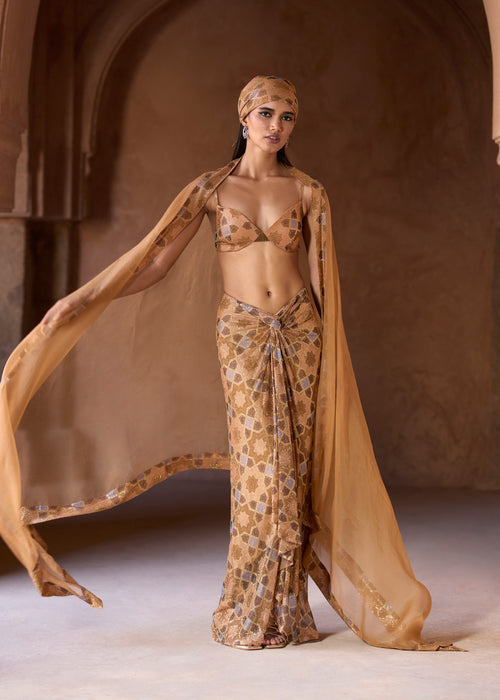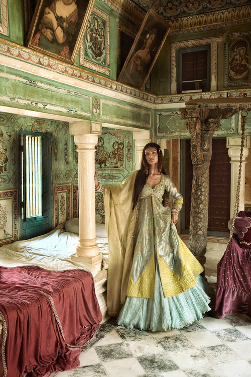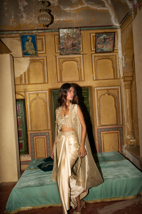 Mustard Yellow Zari Tissue Jacket With Crushed Skirt Set