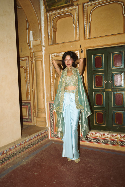 Sea Green Organza Peplum With 3D Petal Slit Skirt