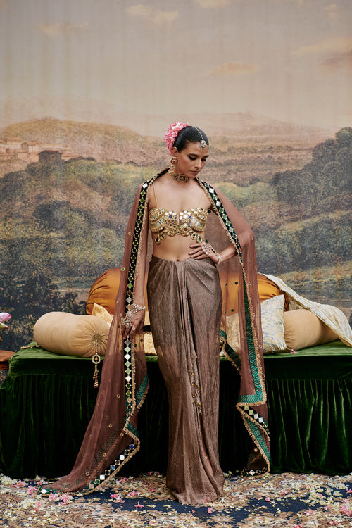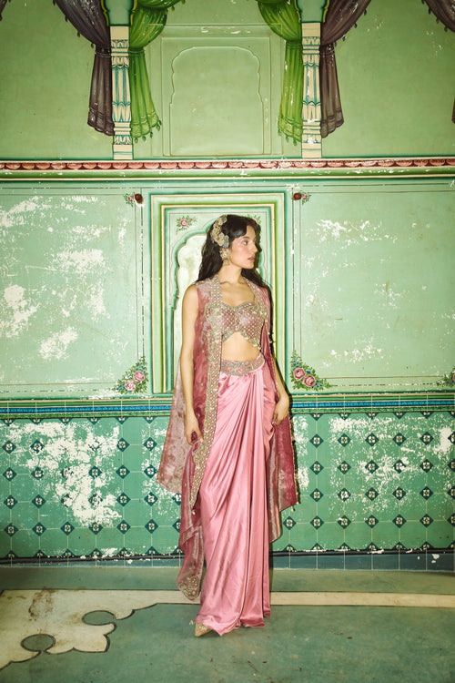 Old Rose Crystal Embellished Skirt With Draped Blouse