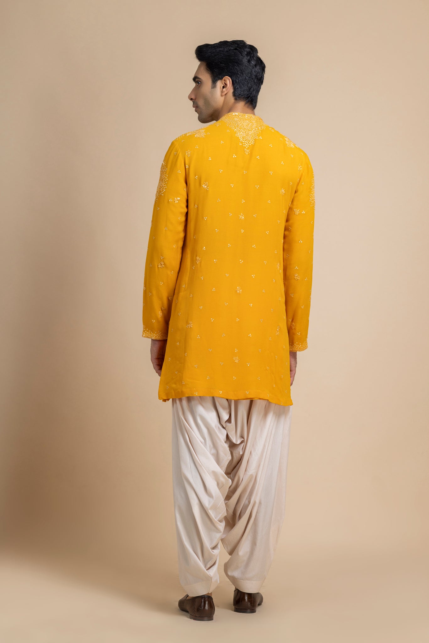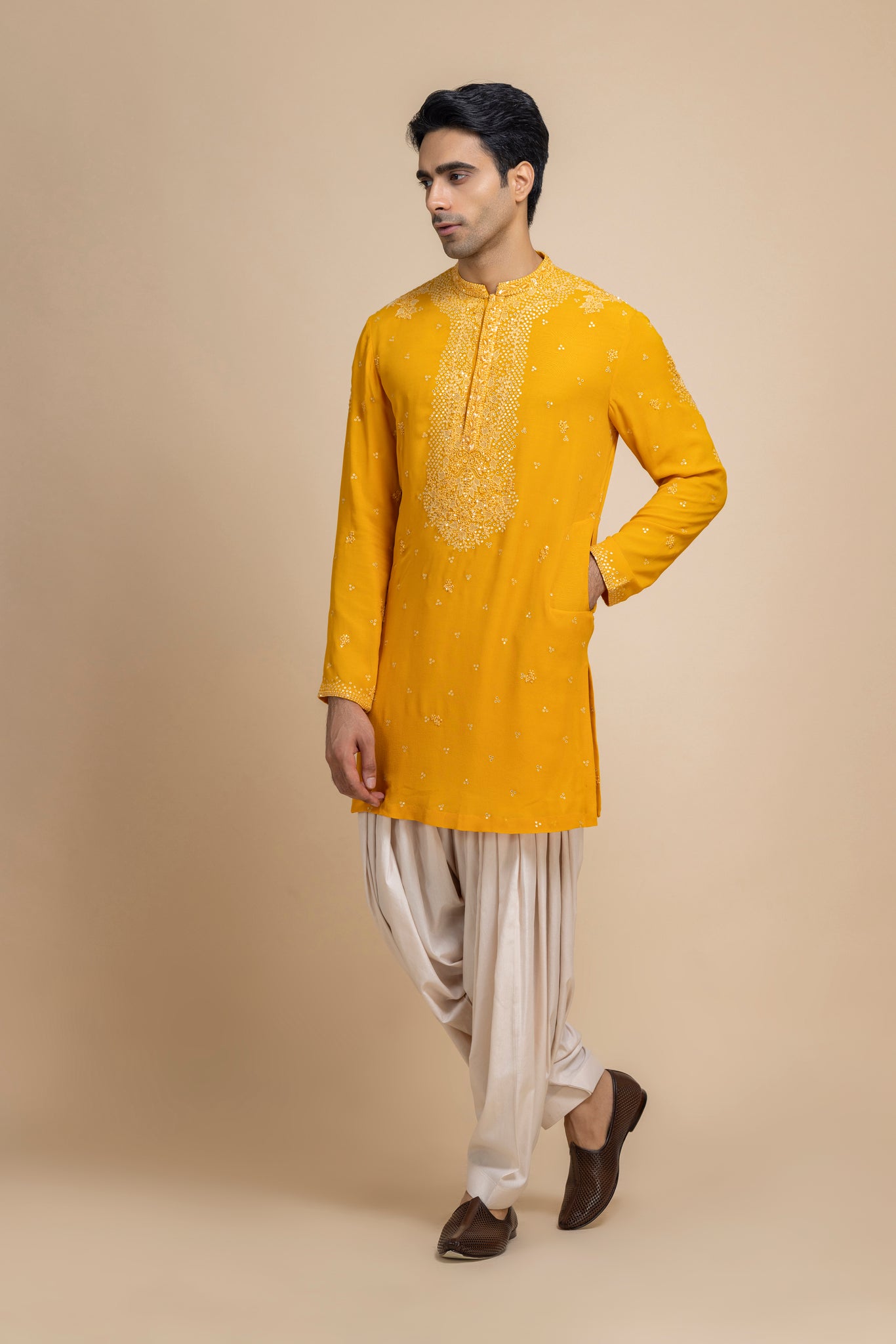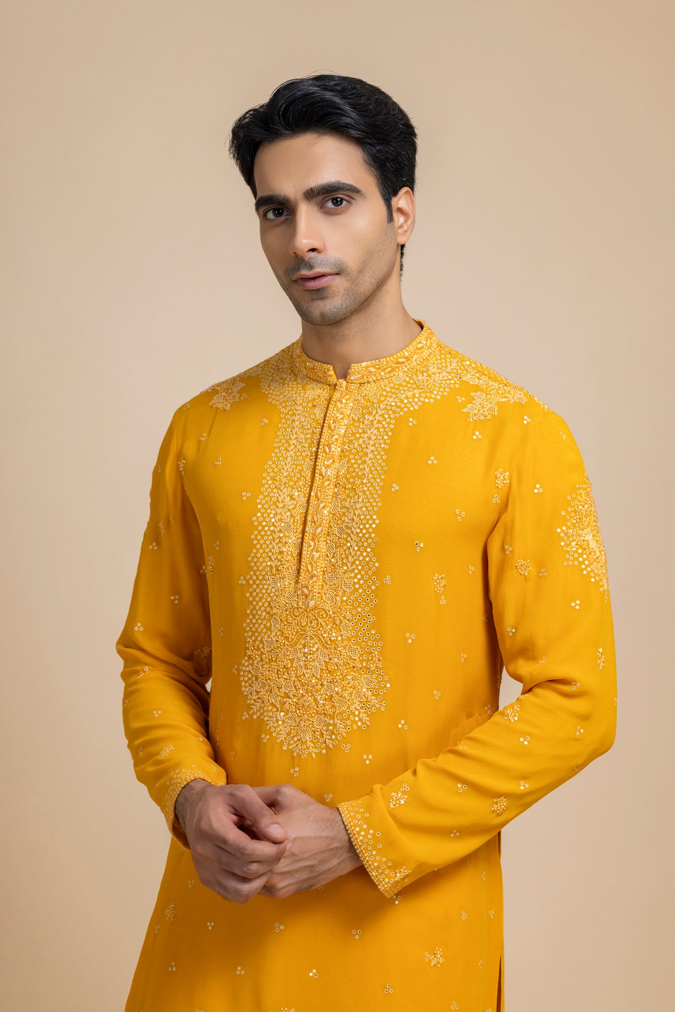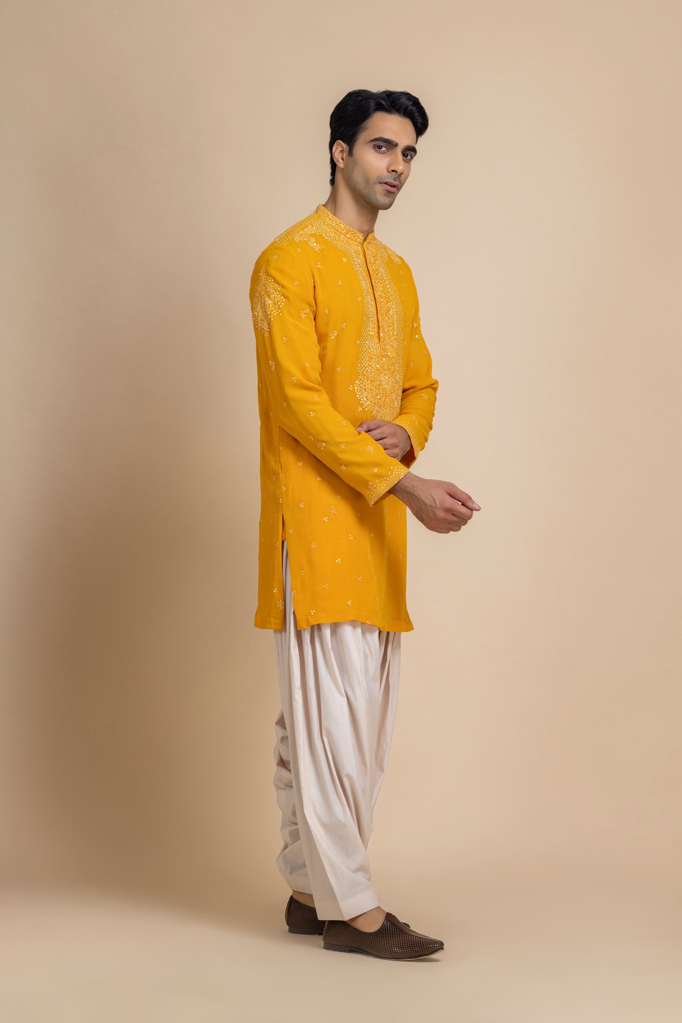 This Turmeric Yellow Kurta Is Crafted In Breezy Georgette, Detailed With Subtle Tonal Embroidery That Adds Depth Without Taking Away From Its Vibrant Charm. Paired With A Classic Salwar