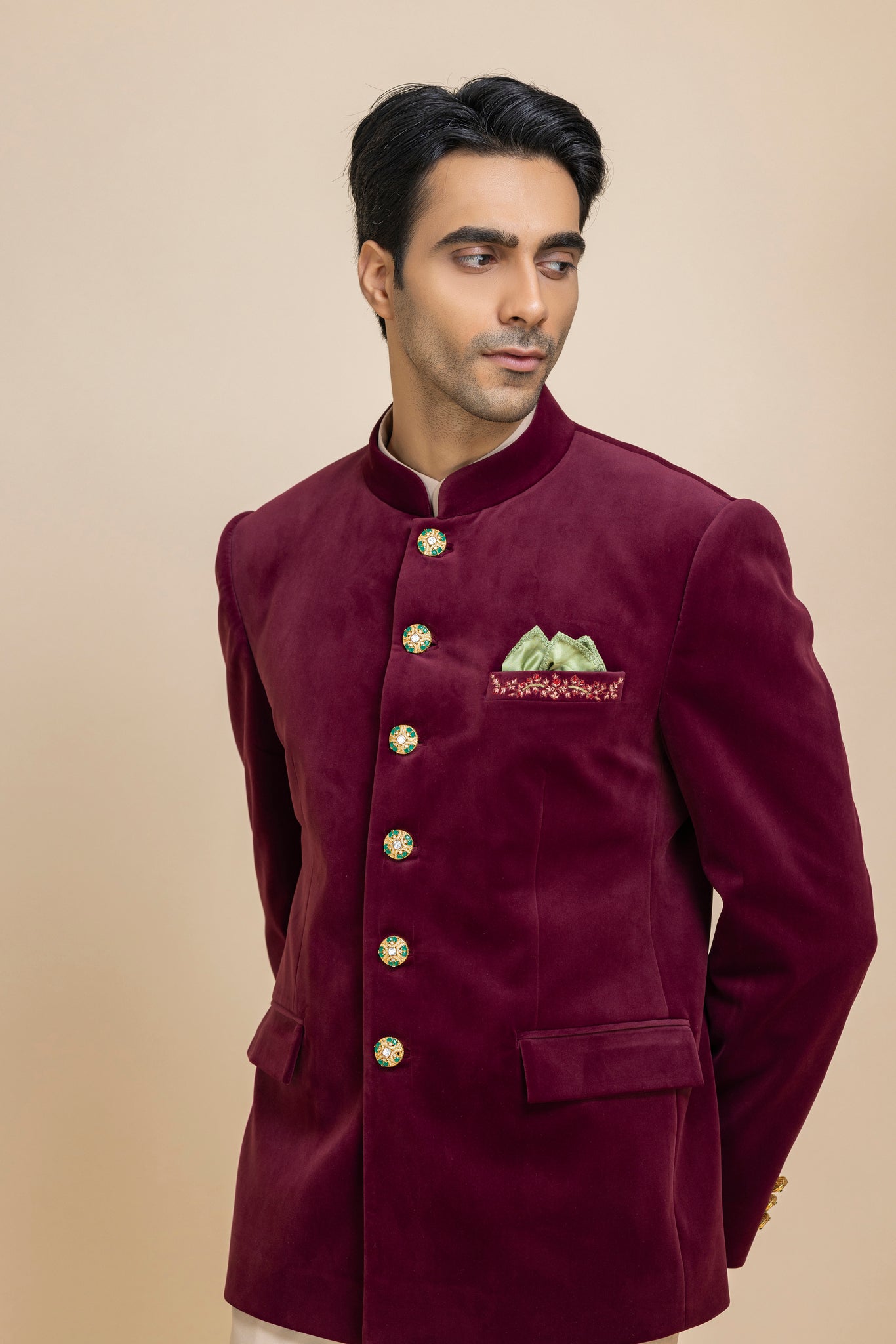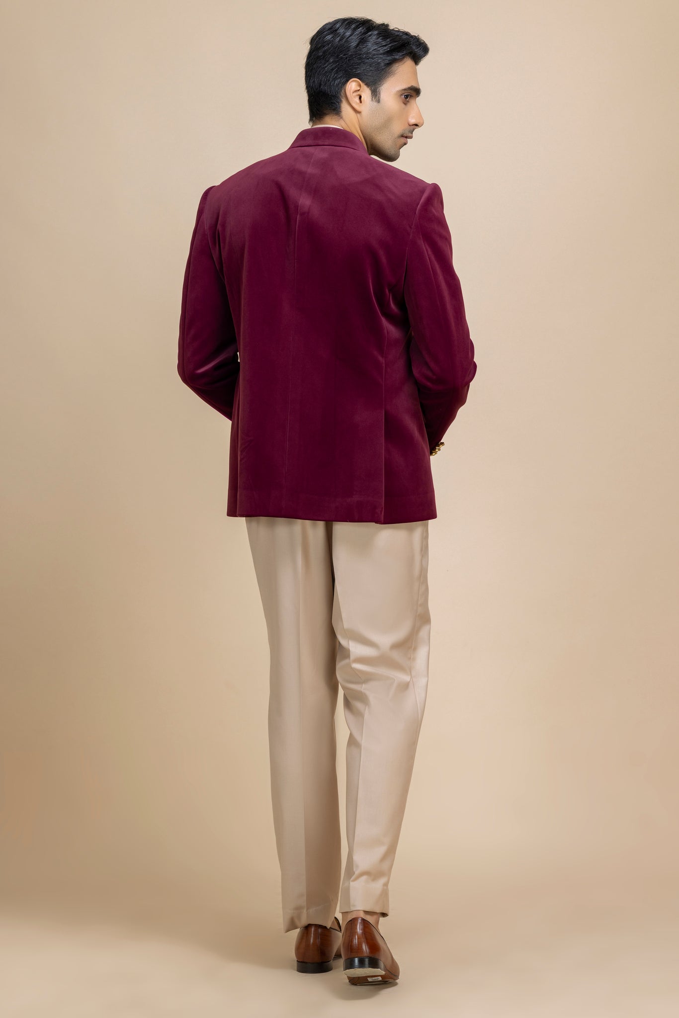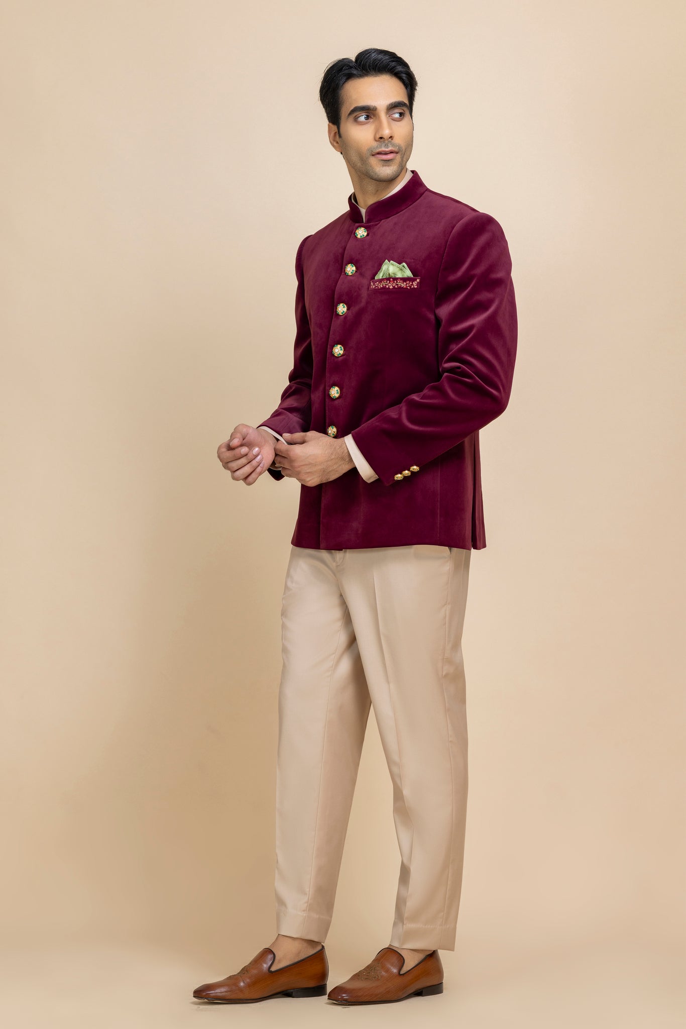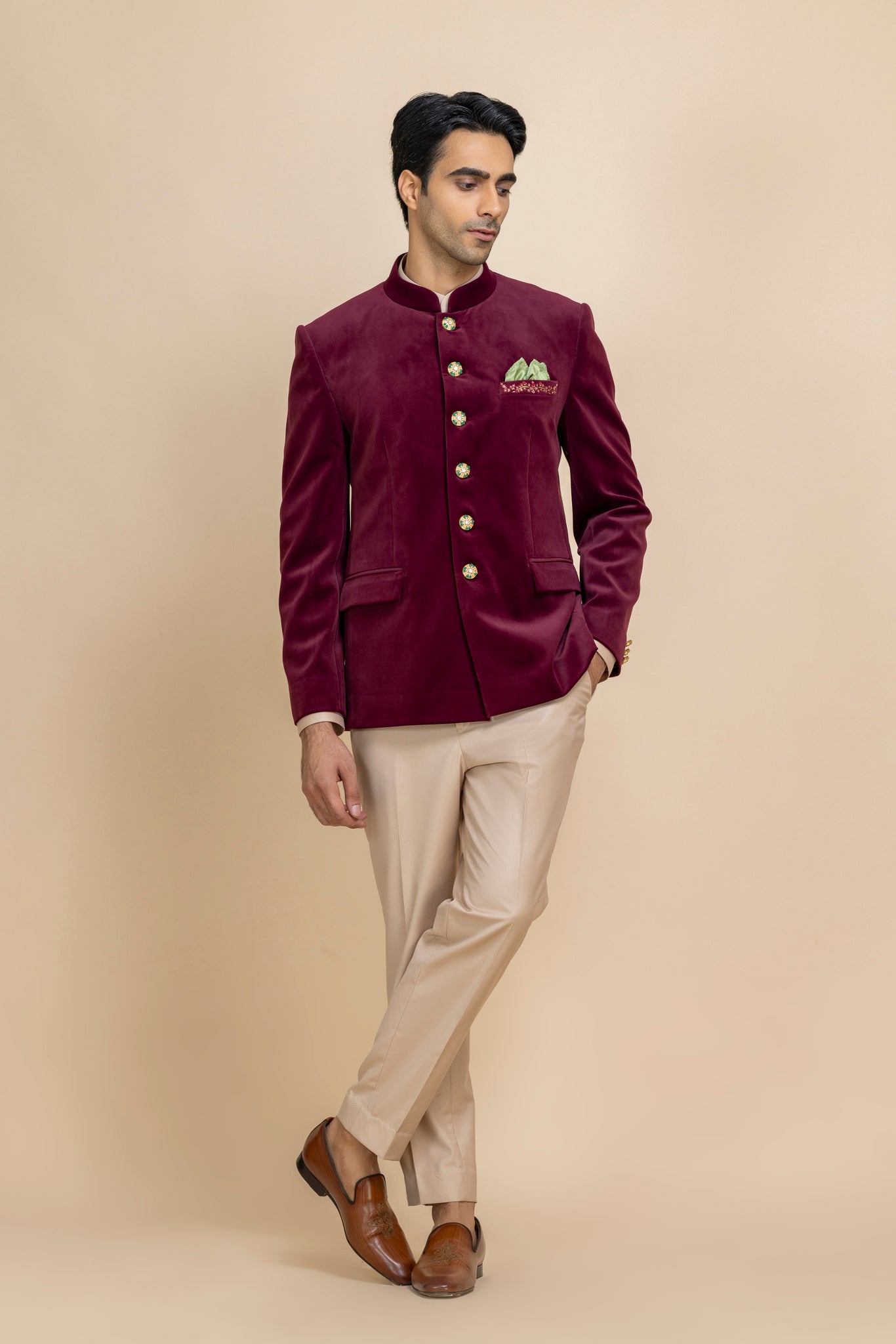 A Statement Of Timeless Sophistication. Crafted In Rich, Plush Velvet, This Jacket Exudes Luxury While Maintaining A Sleek, Contemporary Silhouette. Paired With Beige Trousers And A Sage Green Pocket Square, It Creates A Harmonious Palette That Balances Warmth And Subtle Freshness.