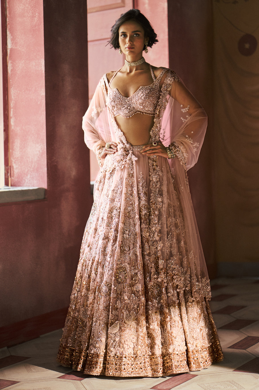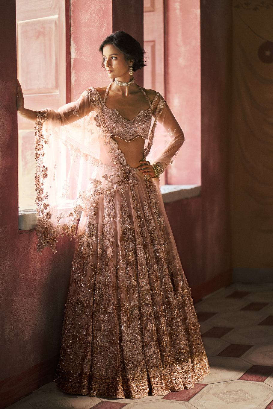 A Gossamer Net Lehenga In A Muted Opaline Rose Tint, Elevated With Intricate Dori Accents And Glinting Golden Embroidery. The Coordinated Net Dupatta Floats With Grace, Lending The Ensemble A Poetic Finish.