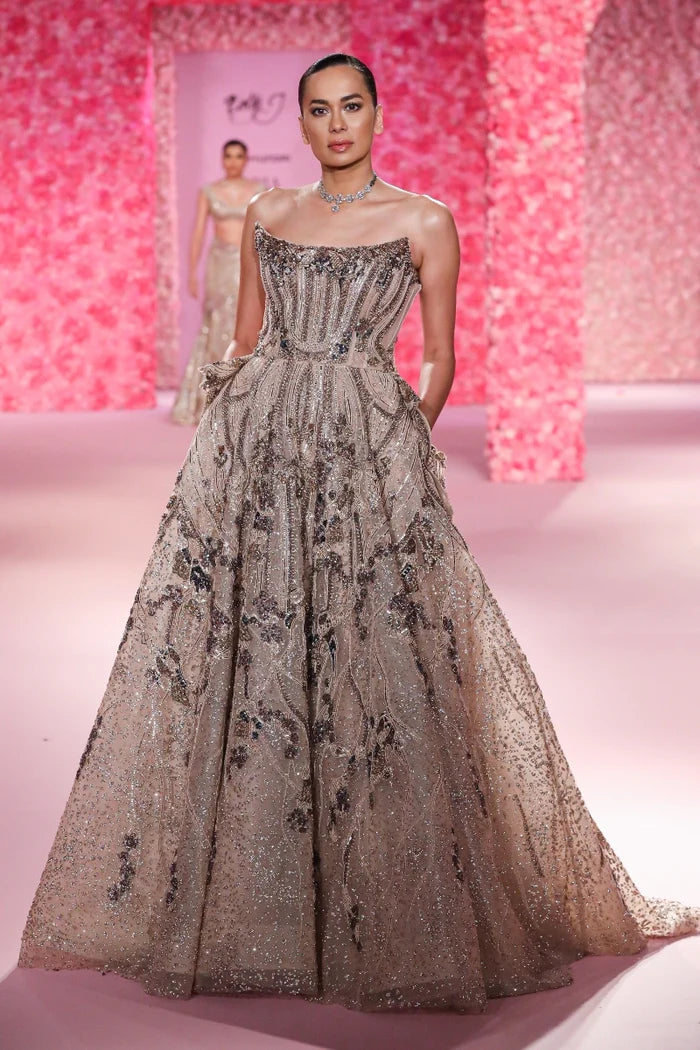 Gold shimmer tulle sculpted corset bustier gown adorned with copper and cobalt blue stonework
